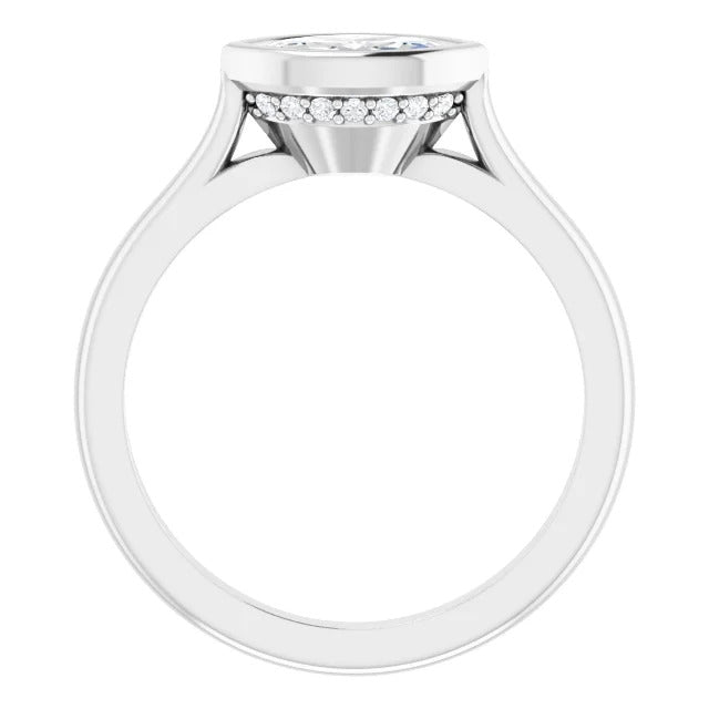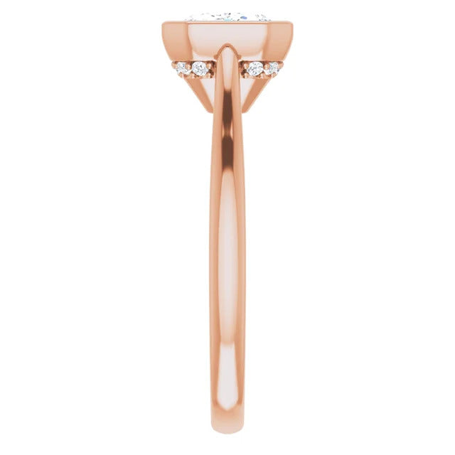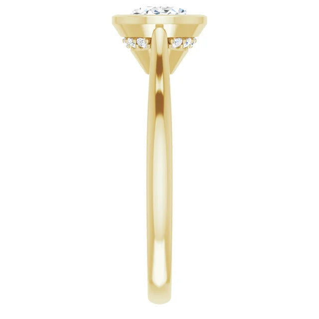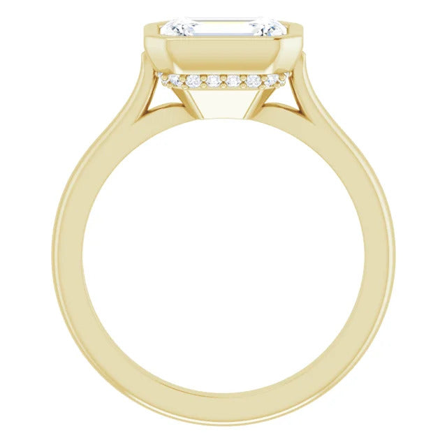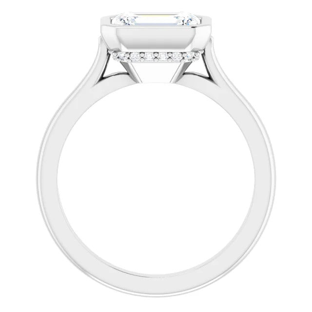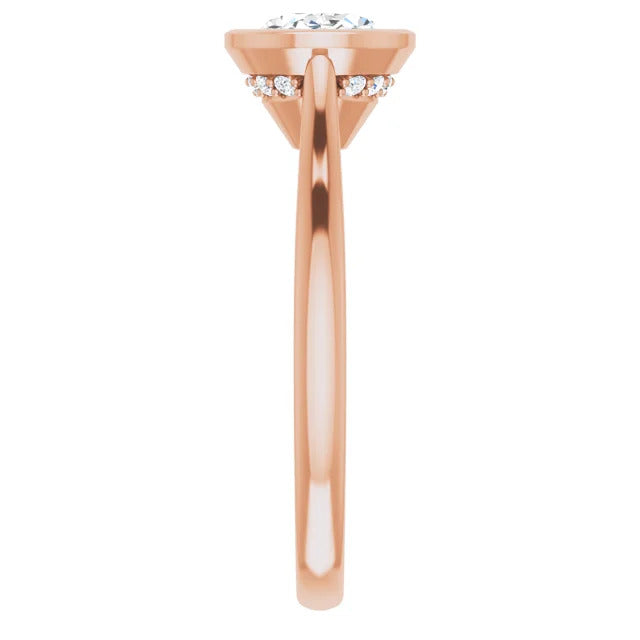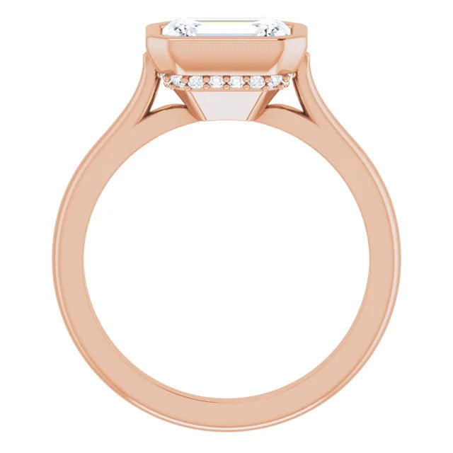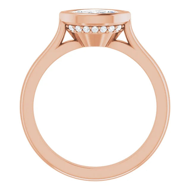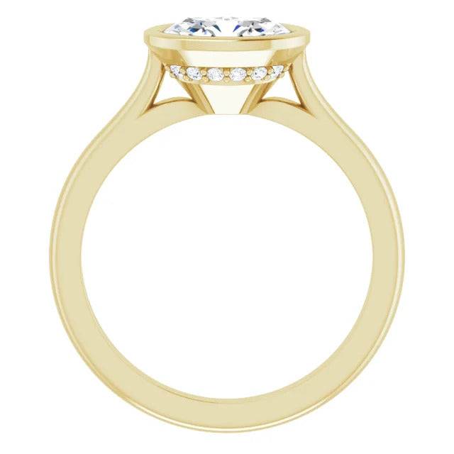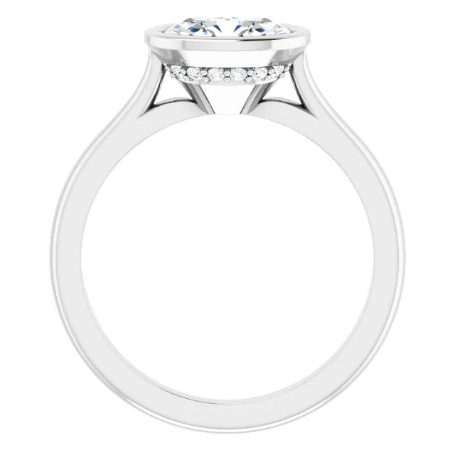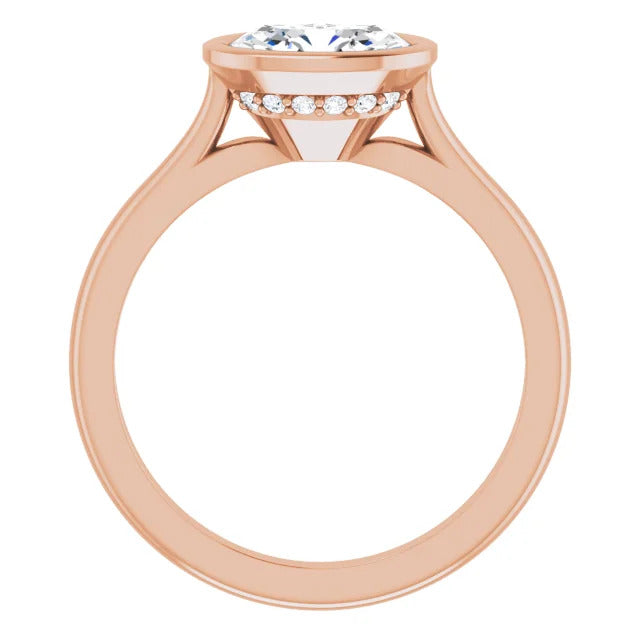 The Lilian is an enchanting engagement ring that captivates with its exquisite design. This cathedral setting showcases a bezel-set center stone and a hidden halo embellished with sparkling round brilliant diamonds, adding a touch of allure and elegance to the ring's design.