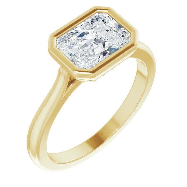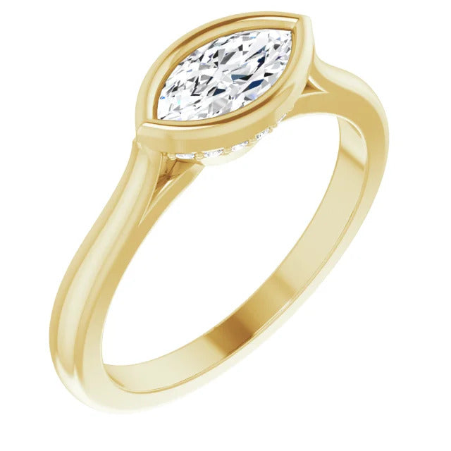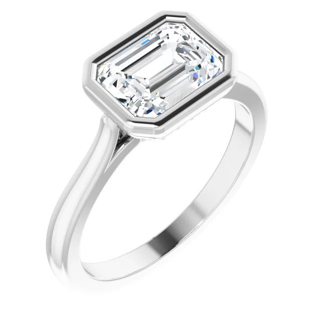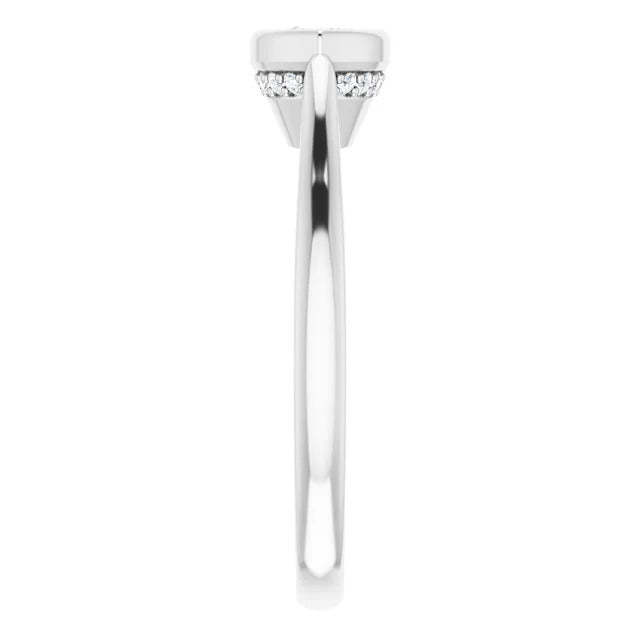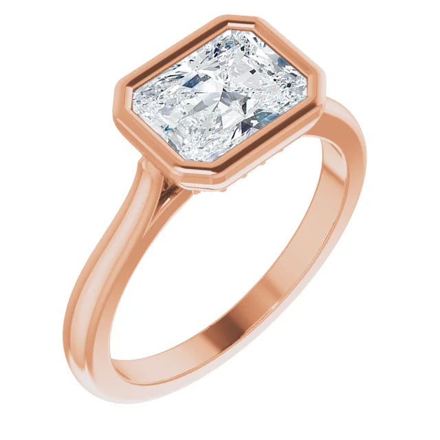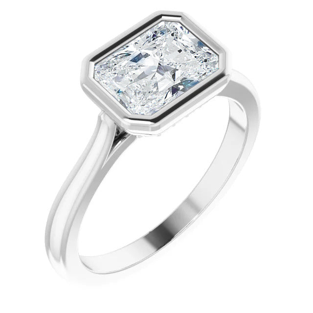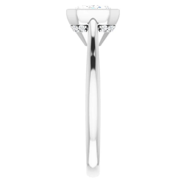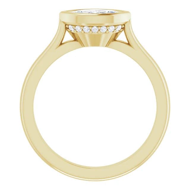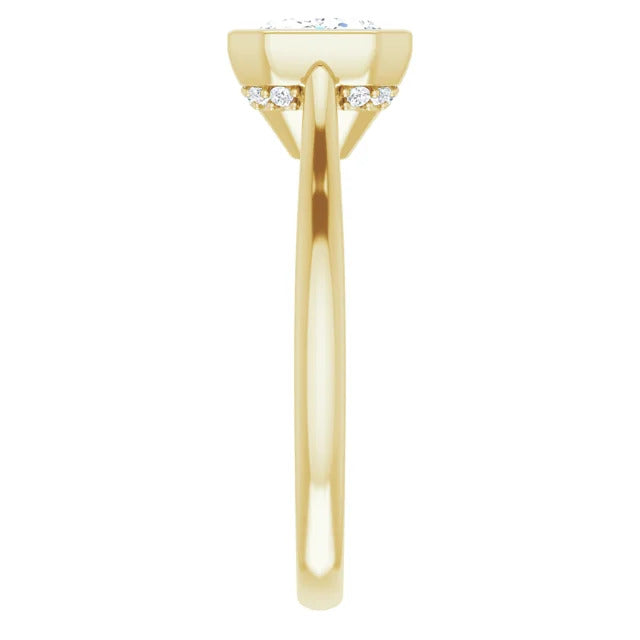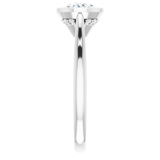The Lilian is an enchanting engagement ring that captivates with its exquisite design. This cathedral setting showcases a bezel-set center stone and a hidden halo embellished with sparkling round brilliant diamonds, adding a touch of allure and elegance to the ring's design.