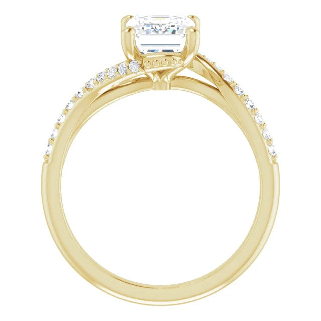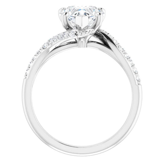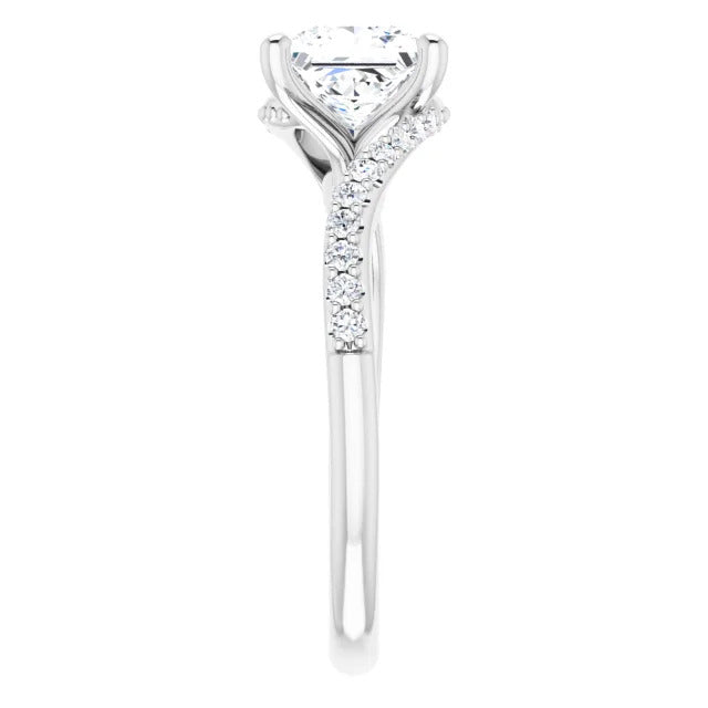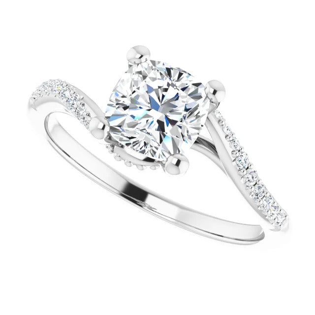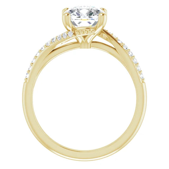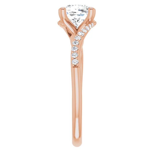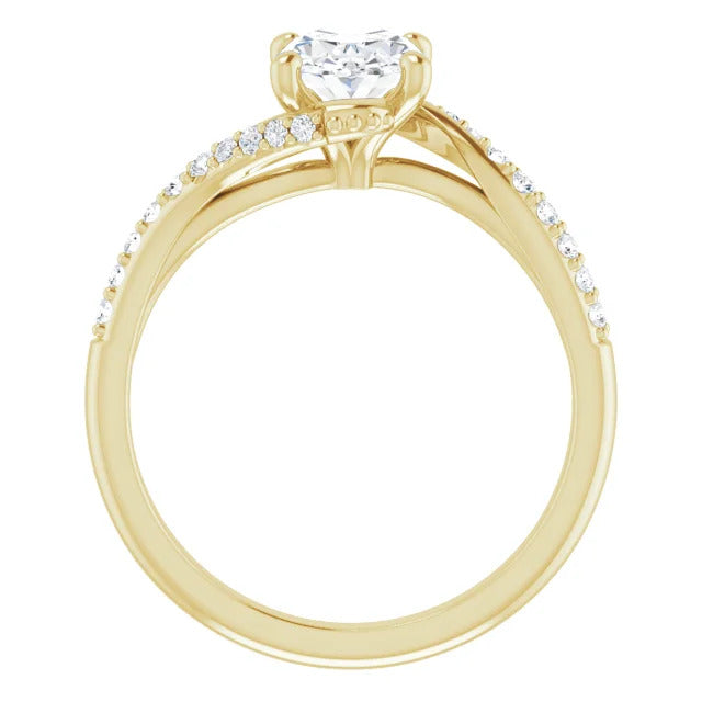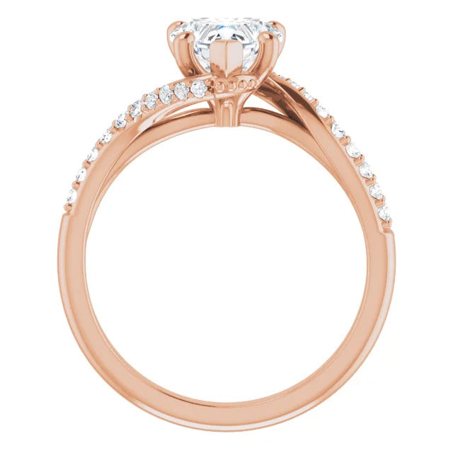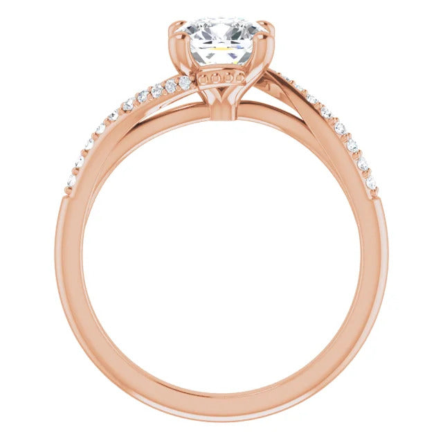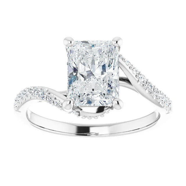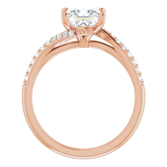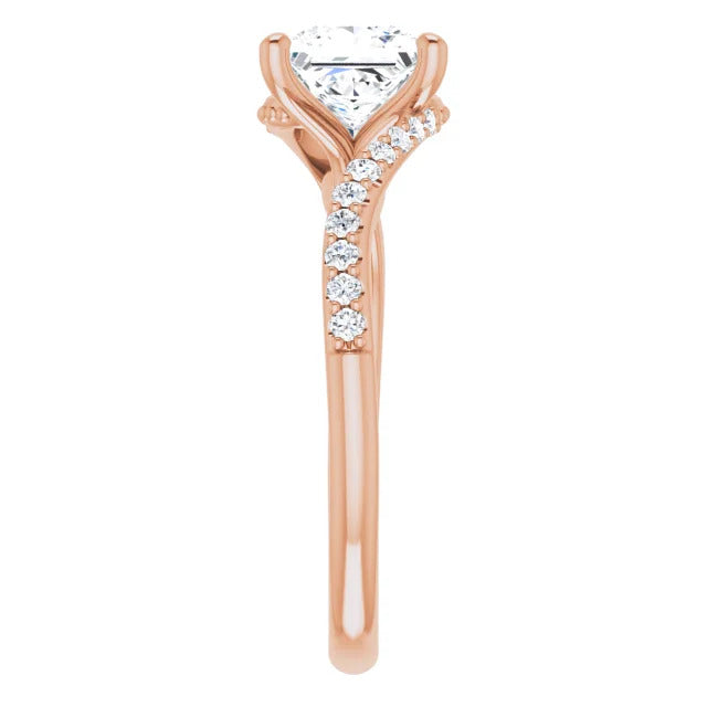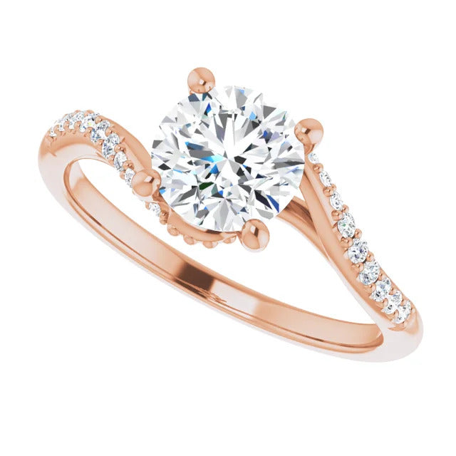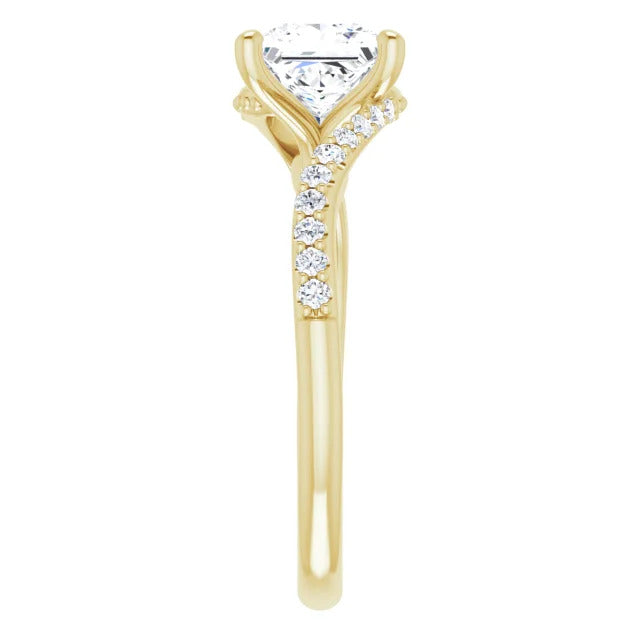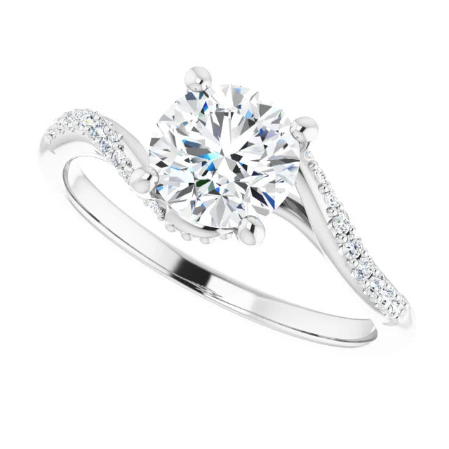 The Angela is an enchanting engagement ring designed with a bypass cathedral setting and pavé diamonds delicately adorning half of the shank. This ring emanates shimmering splendor.