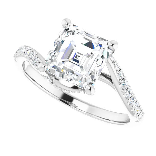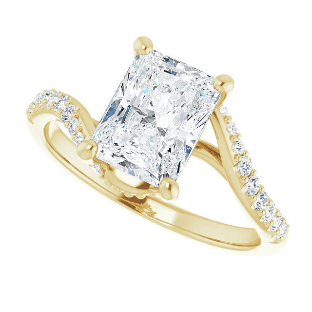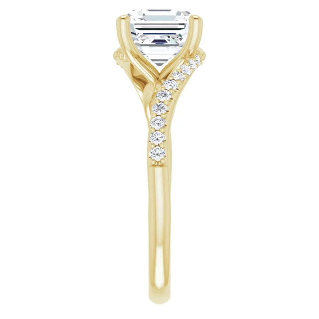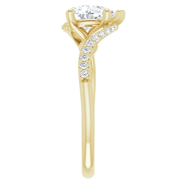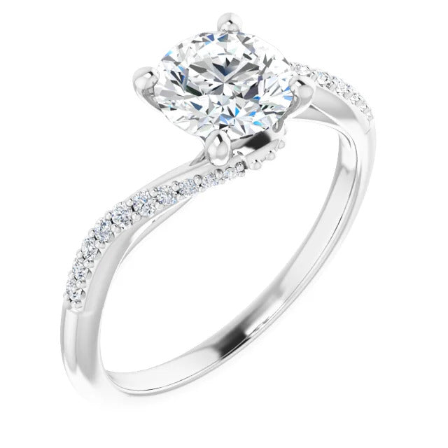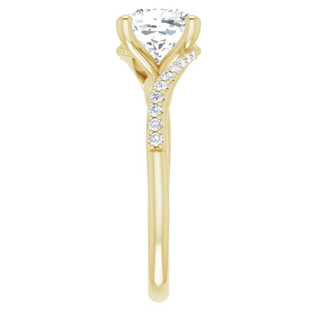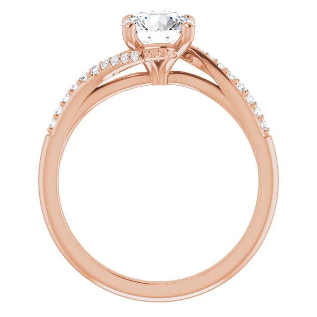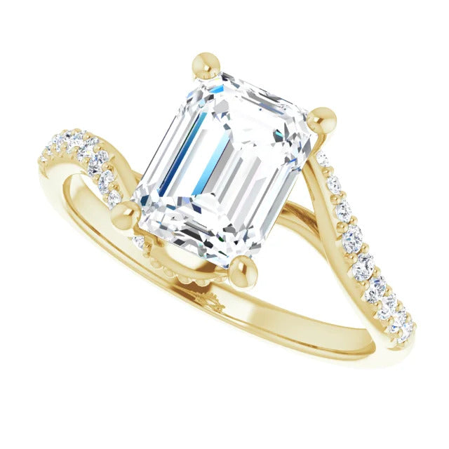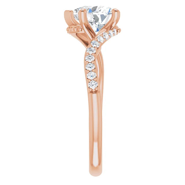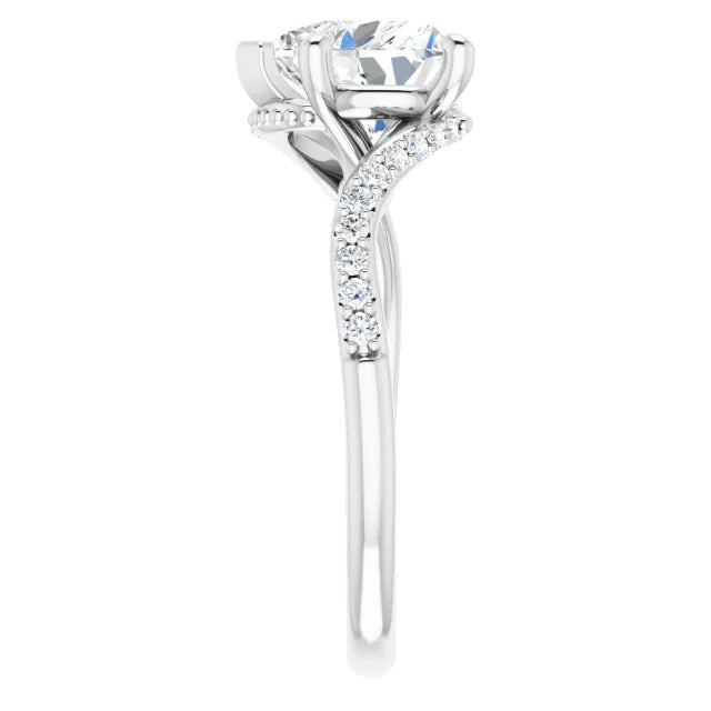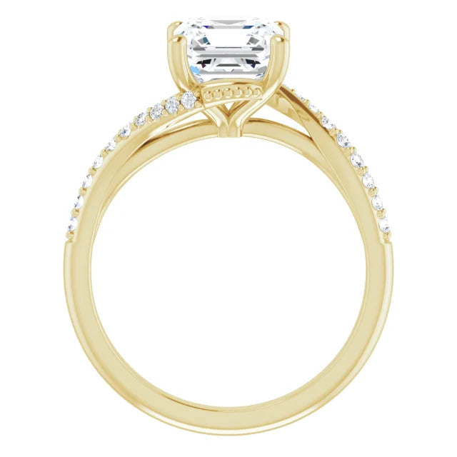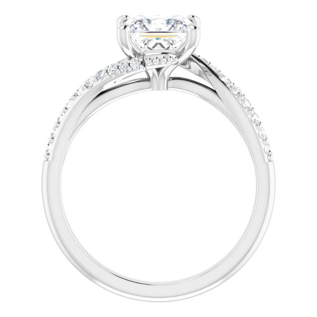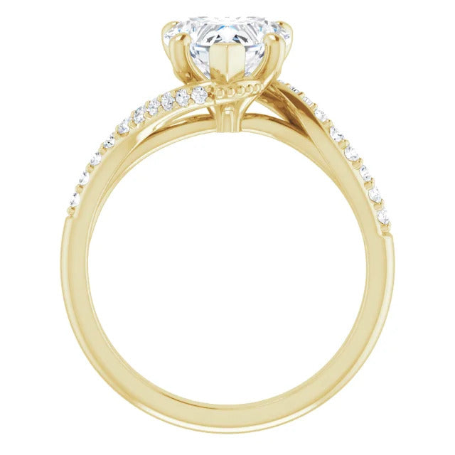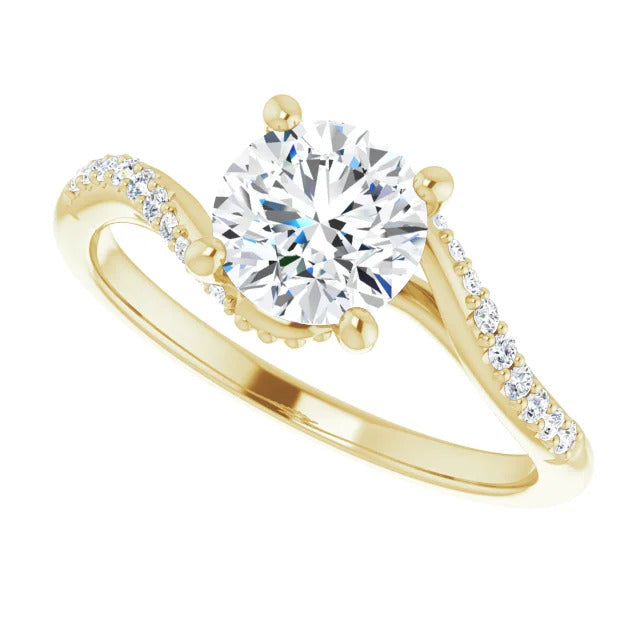 The Angela is an enchanting engagement ring designed with a bypass cathedral setting and pavé diamonds delicately adorning half of the shank. This ring emanates shimmering splendor.