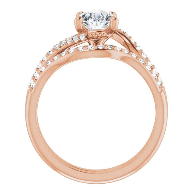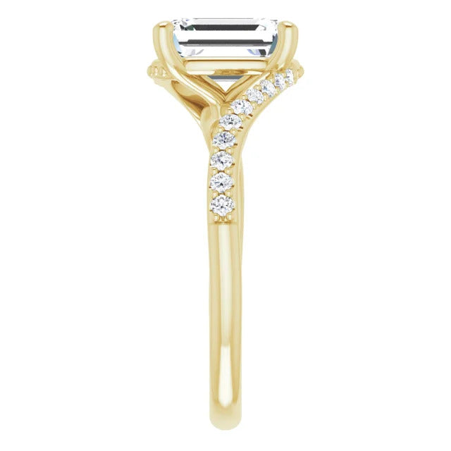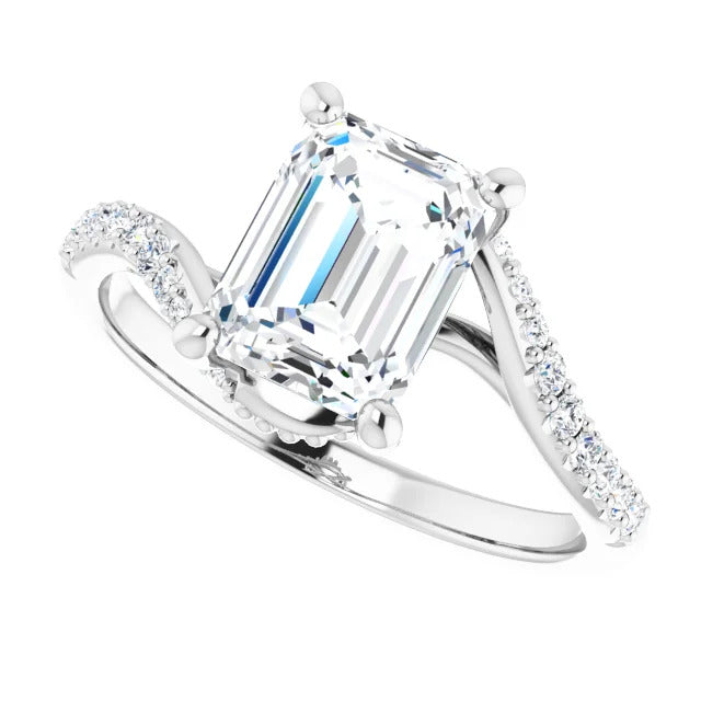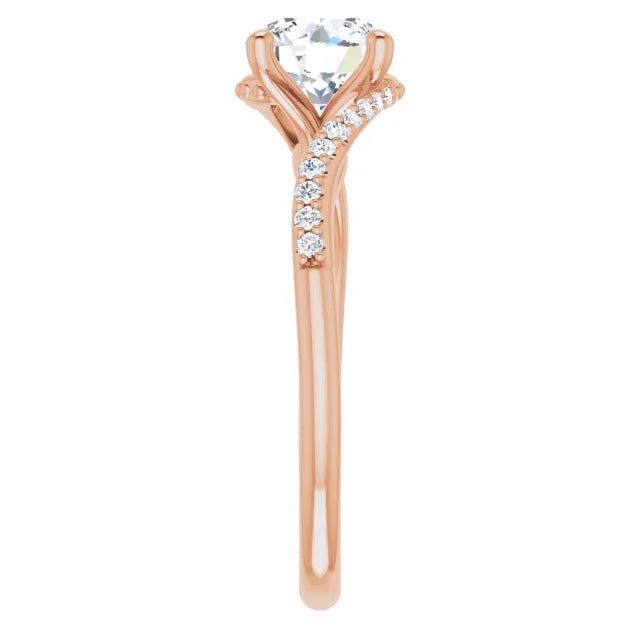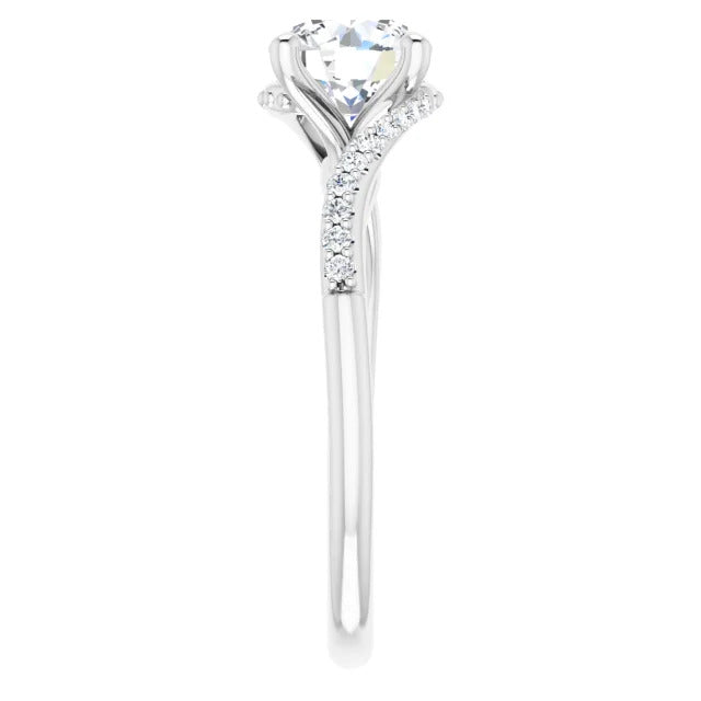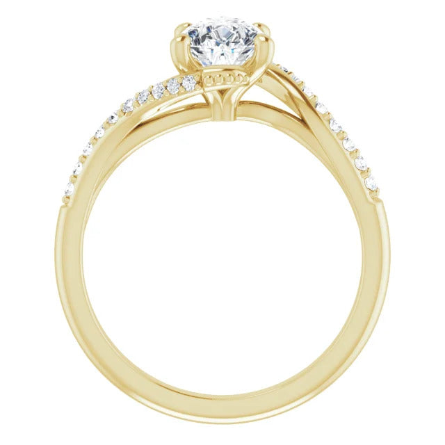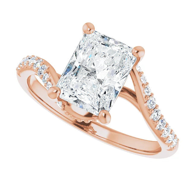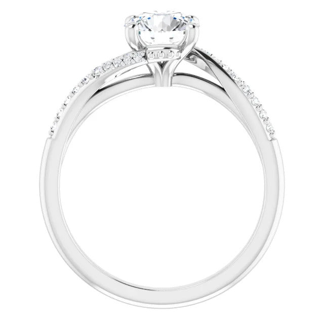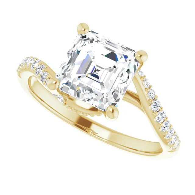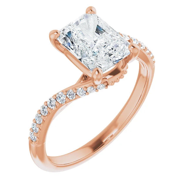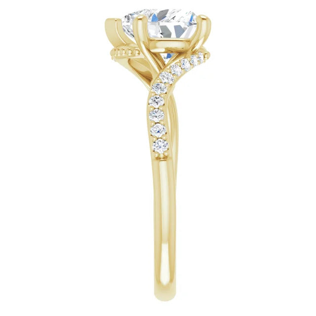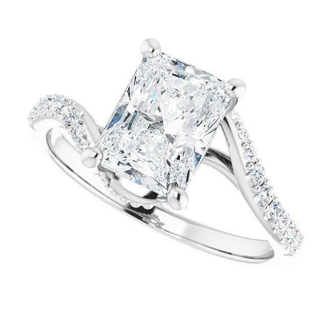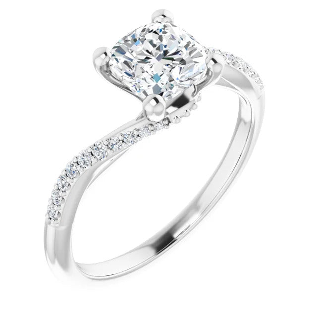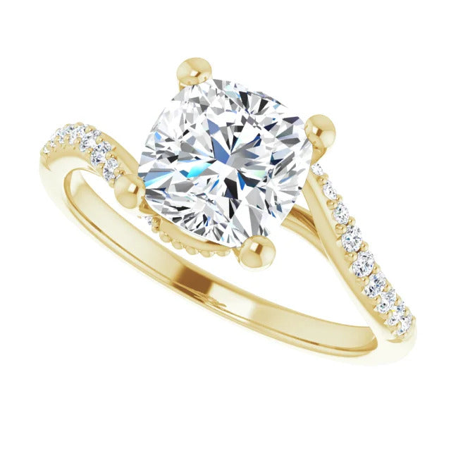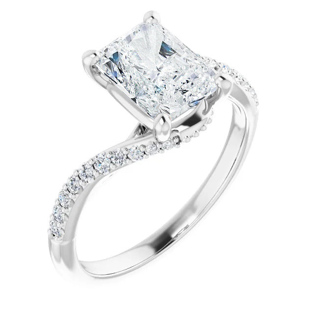 The Angela is an enchanting engagement ring designed with a bypass cathedral setting and pavé diamonds delicately adorning half of the shank. This ring emanates shimmering splendor.