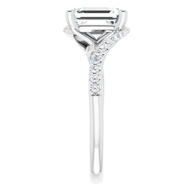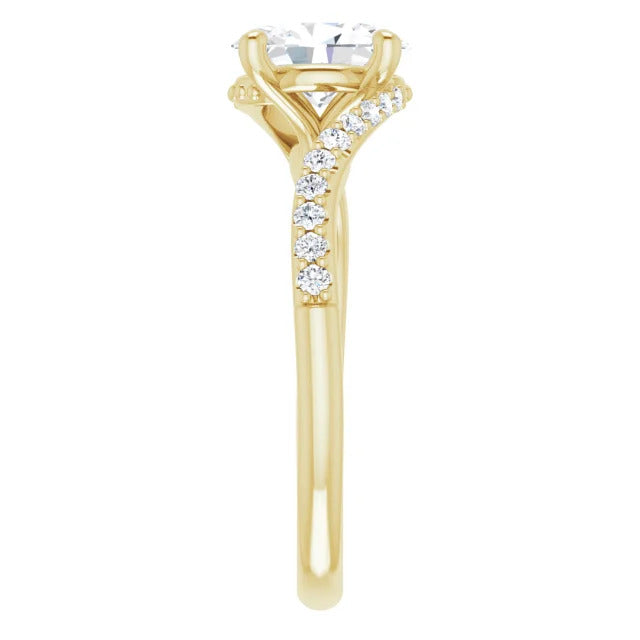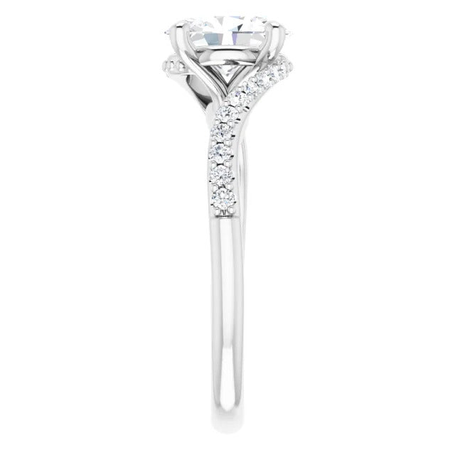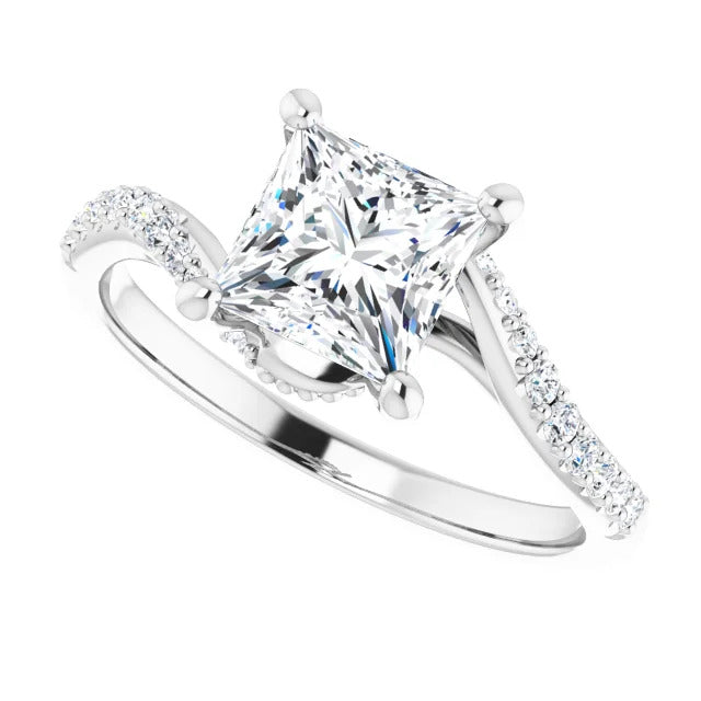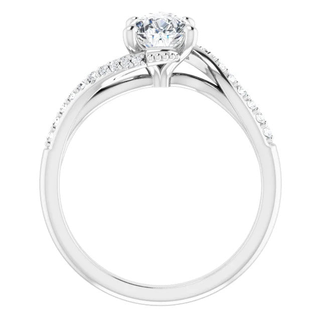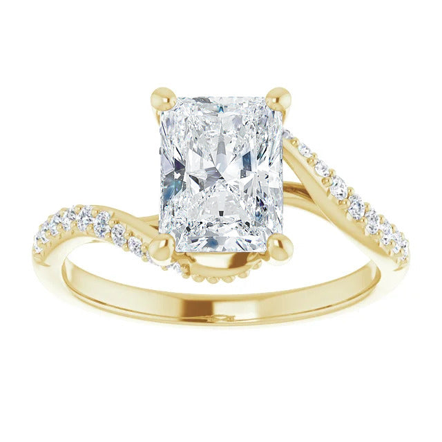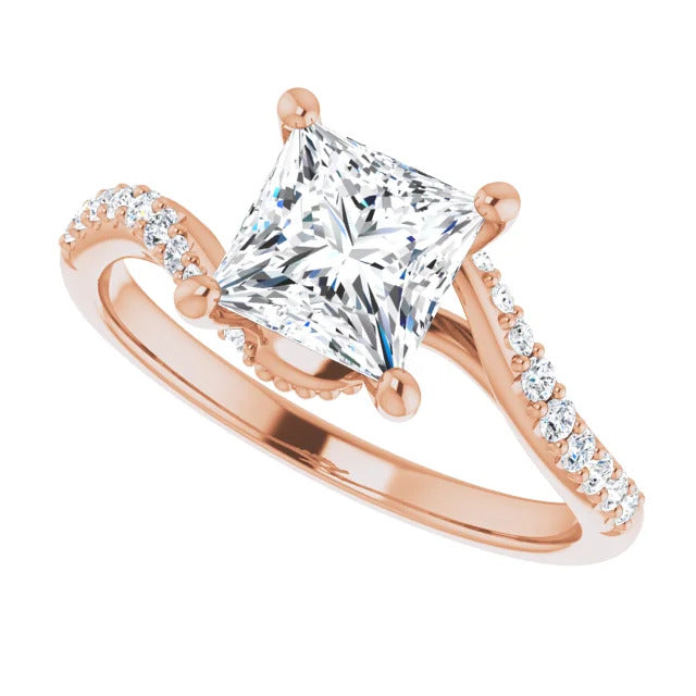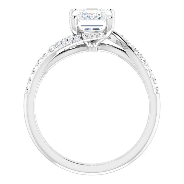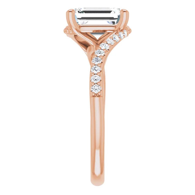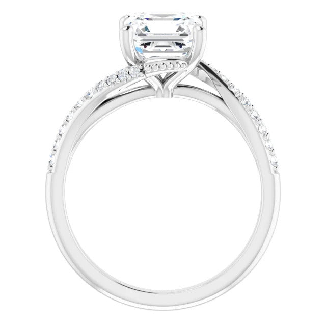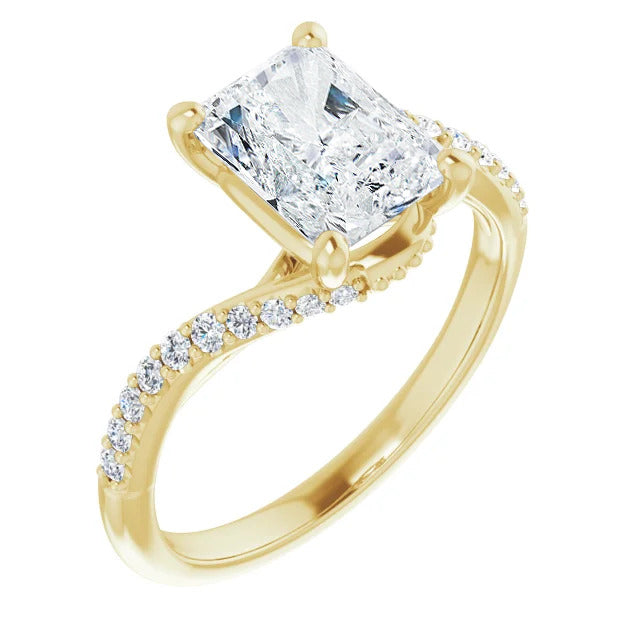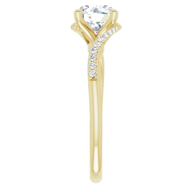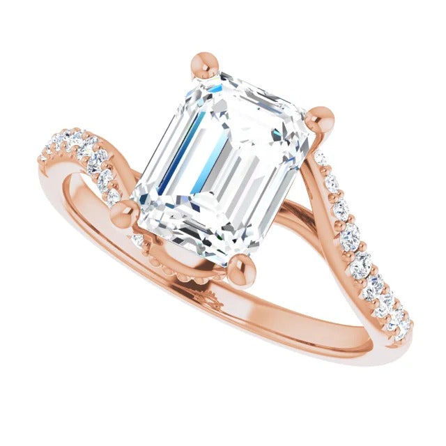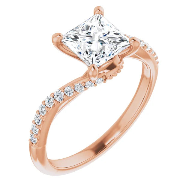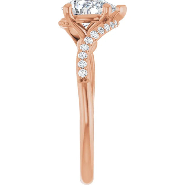 The Angela is an enchanting engagement ring designed with a bypass cathedral setting and pavé diamonds delicately adorning half of the shank. This ring emanates shimmering splendor.