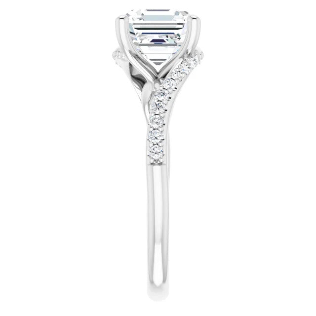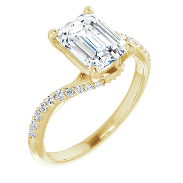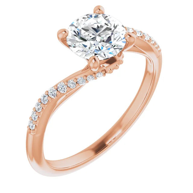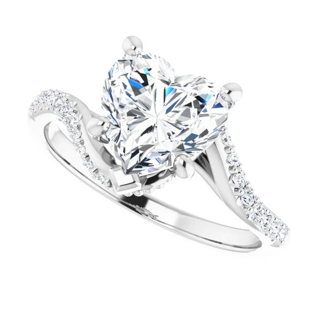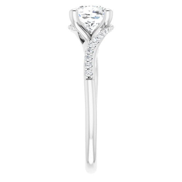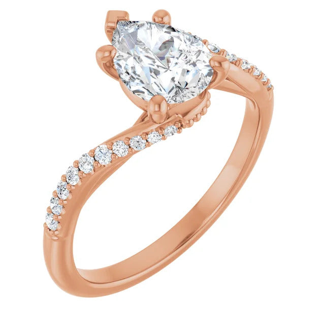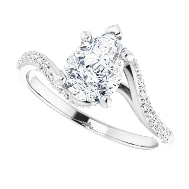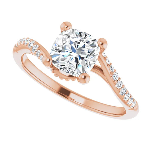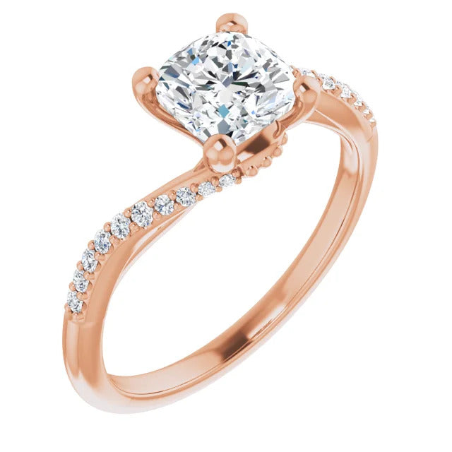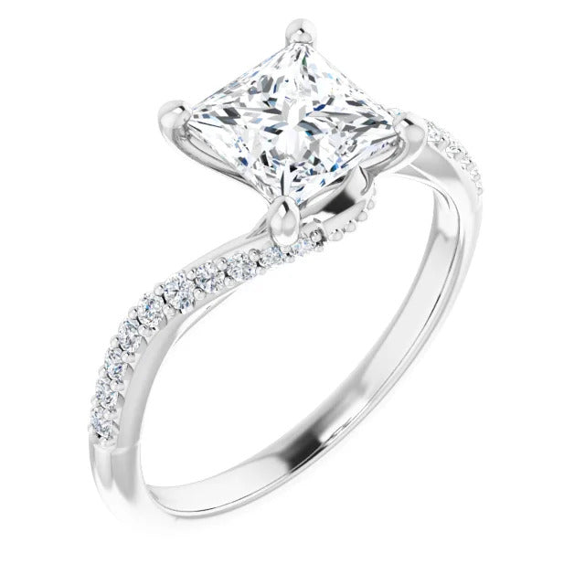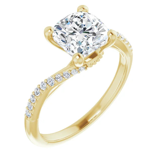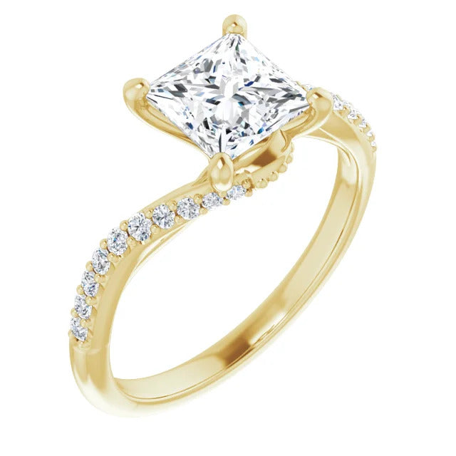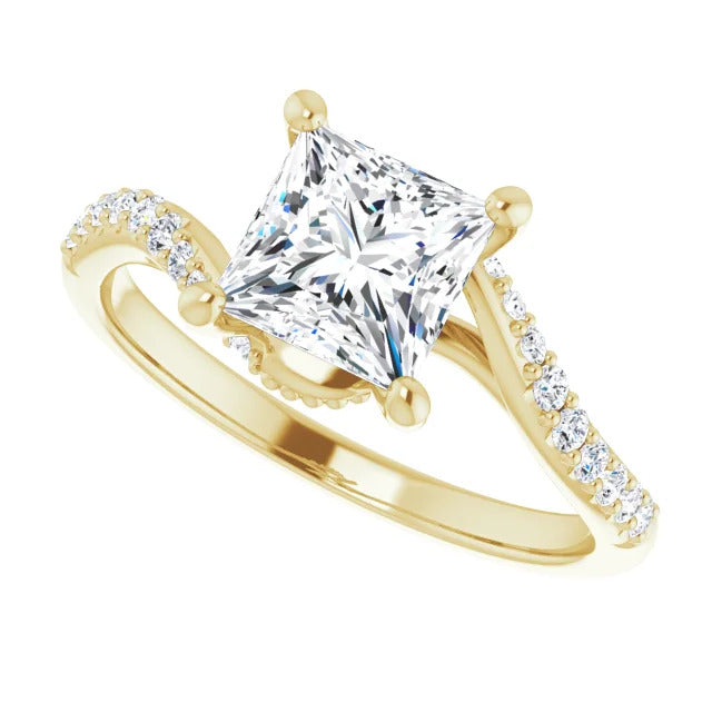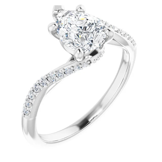 The Angela is an enchanting engagement ring designed with a bypass cathedral setting and pavé diamonds delicately adorning half of the shank. This ring emanates shimmering splendor.