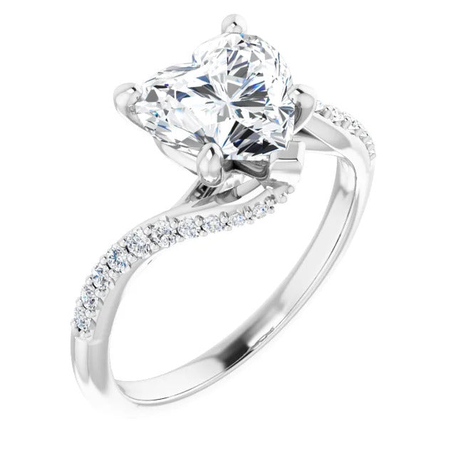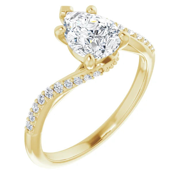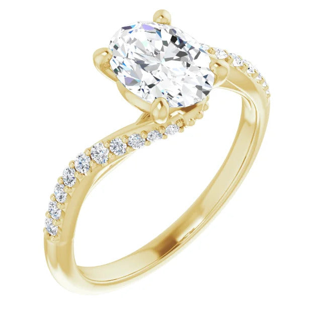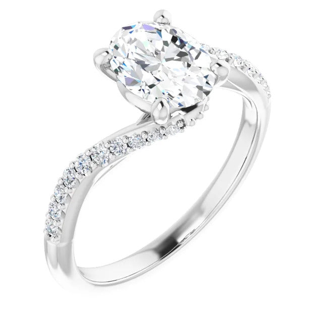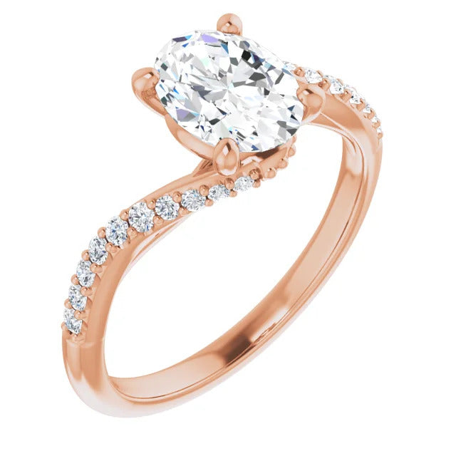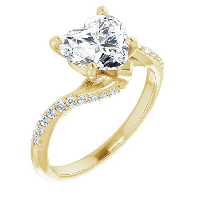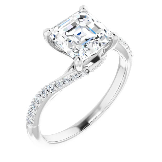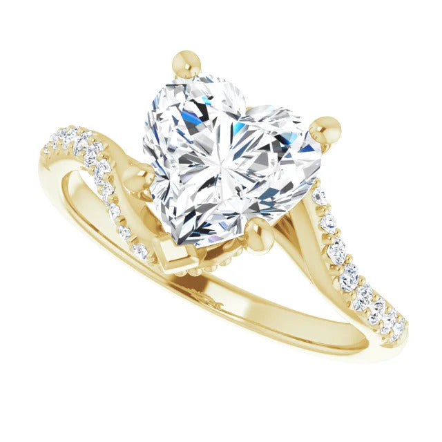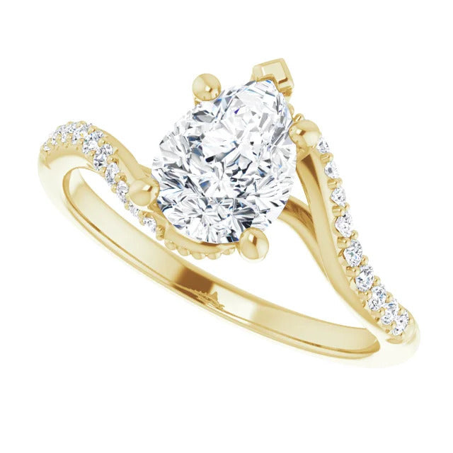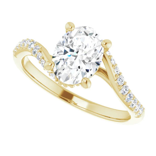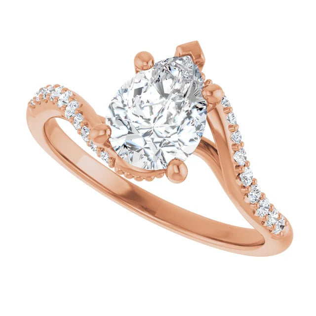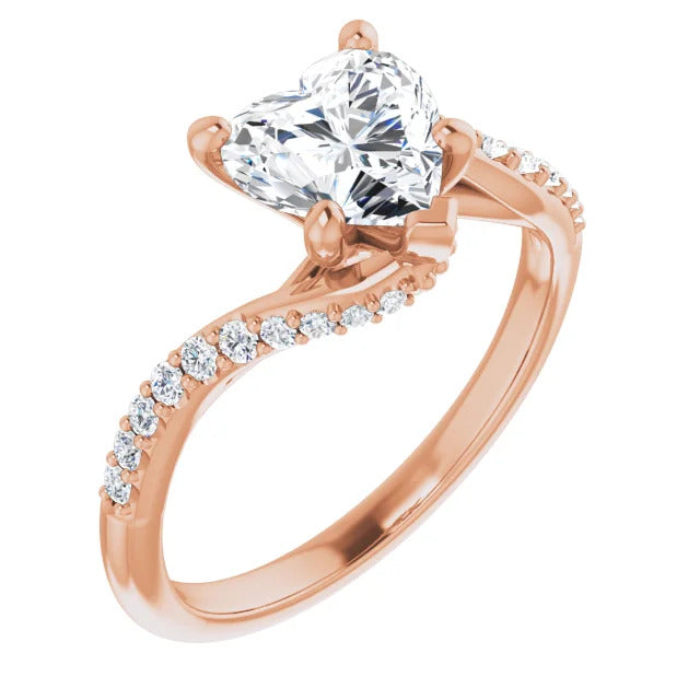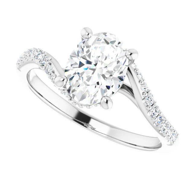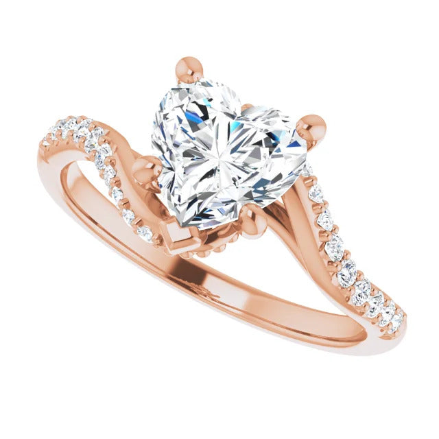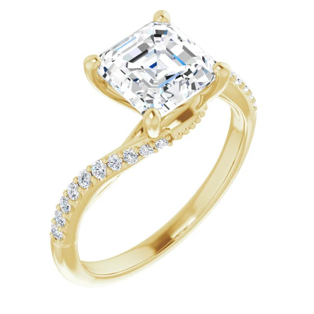 The Angela is an enchanting engagement ring designed with a bypass cathedral setting and pavé diamonds delicately adorning half of the shank. This ring emanates shimmering splendor.