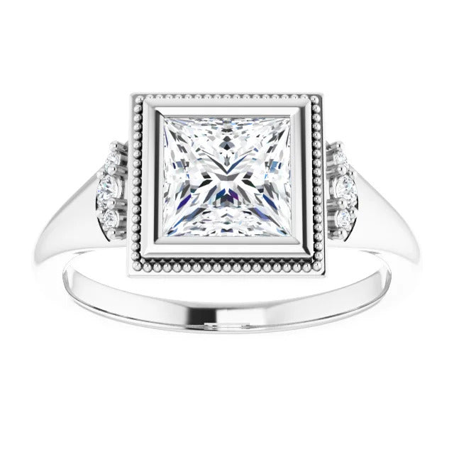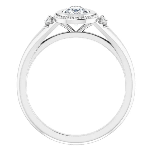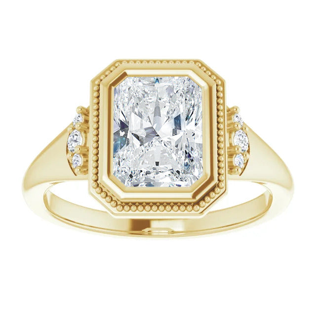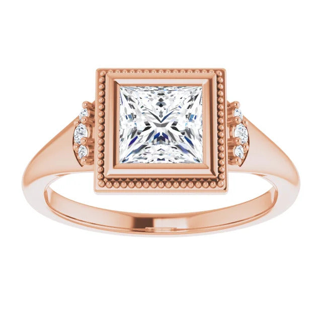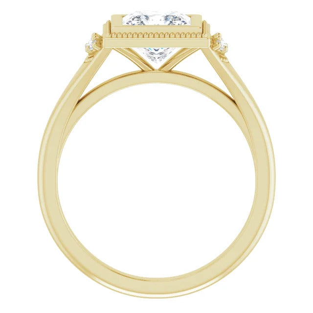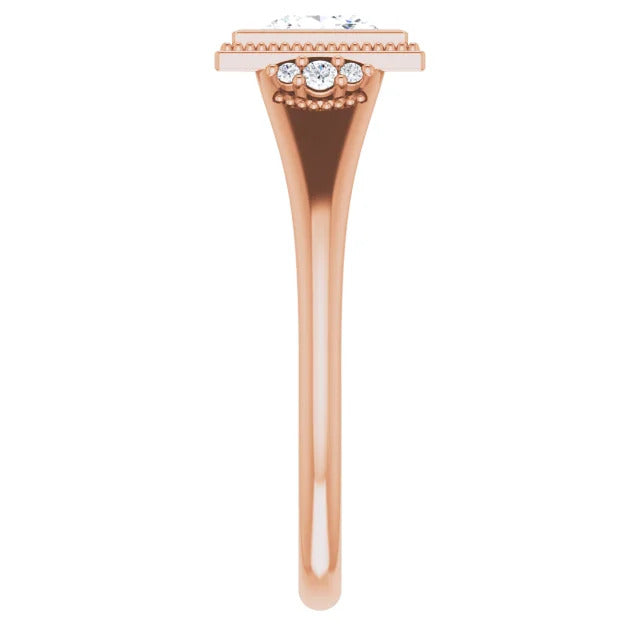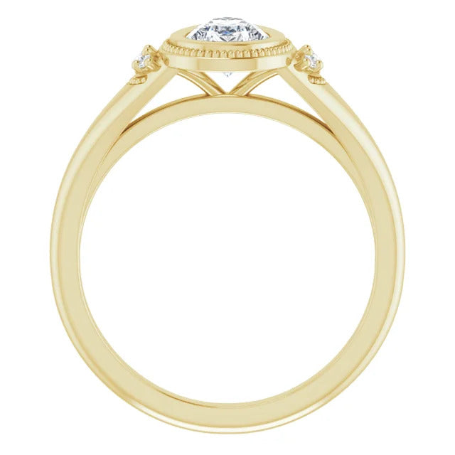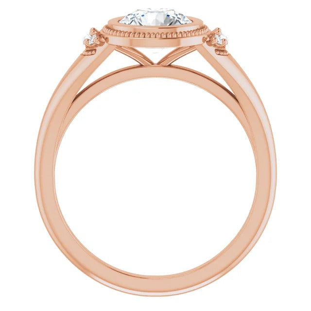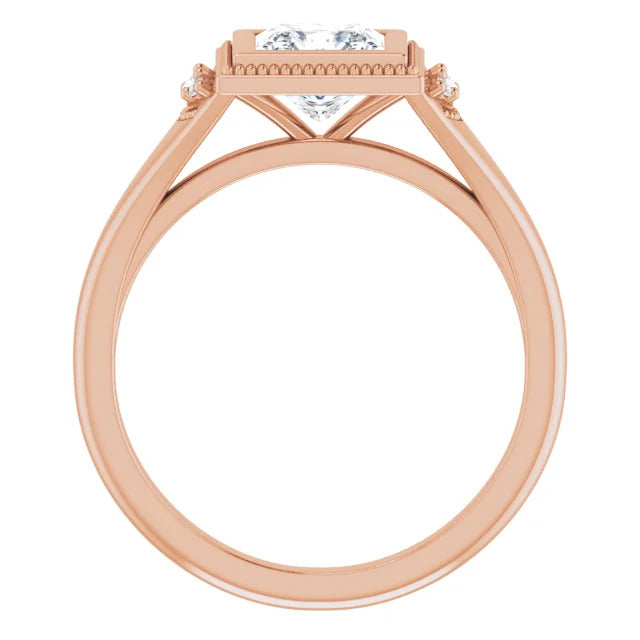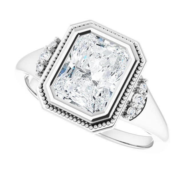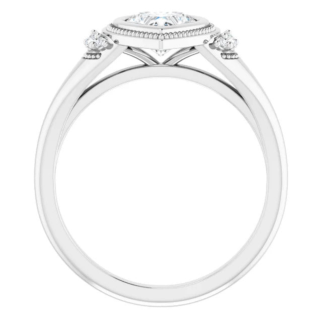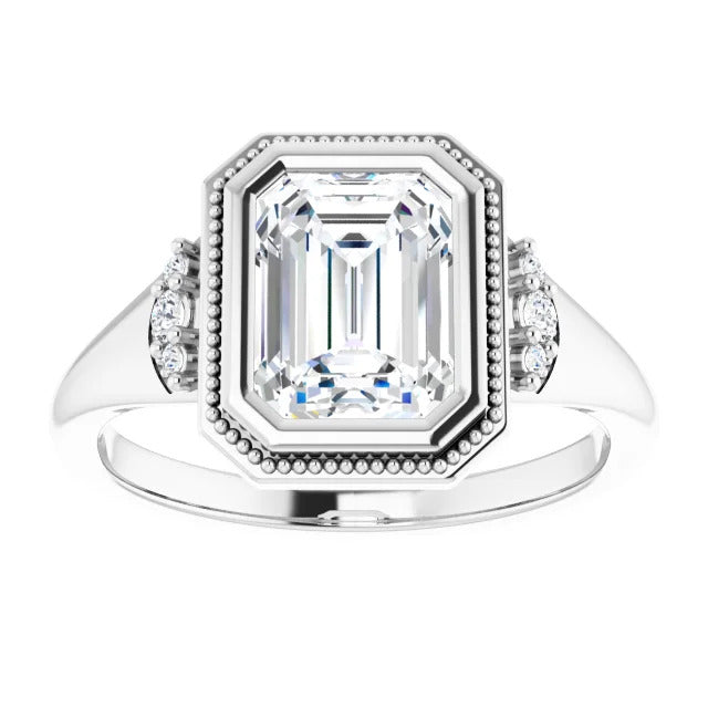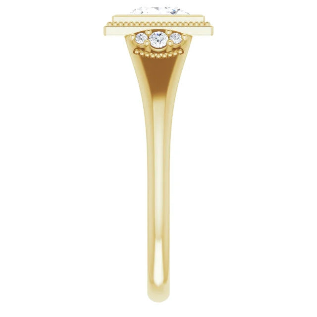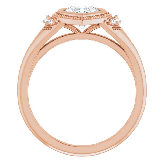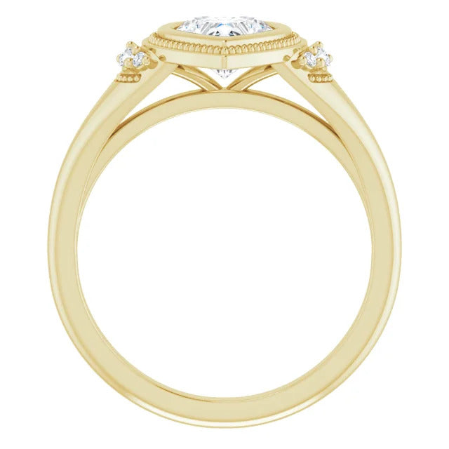 The Helen is an enchanting engagement ring that captures hearts with its charm. With a cathedral bezel setting and delicate beaded details throughout, this stunning piece features three pavé diamonds on each side of the center stone, adding a touch of shimmer and sophistication.