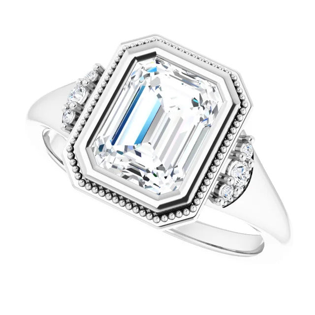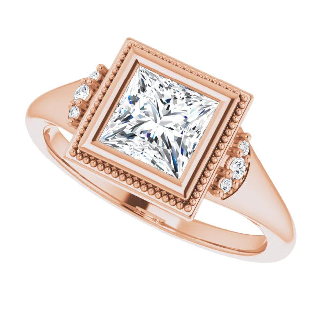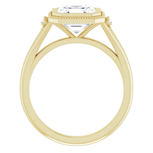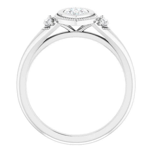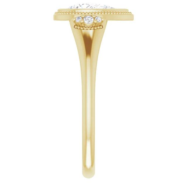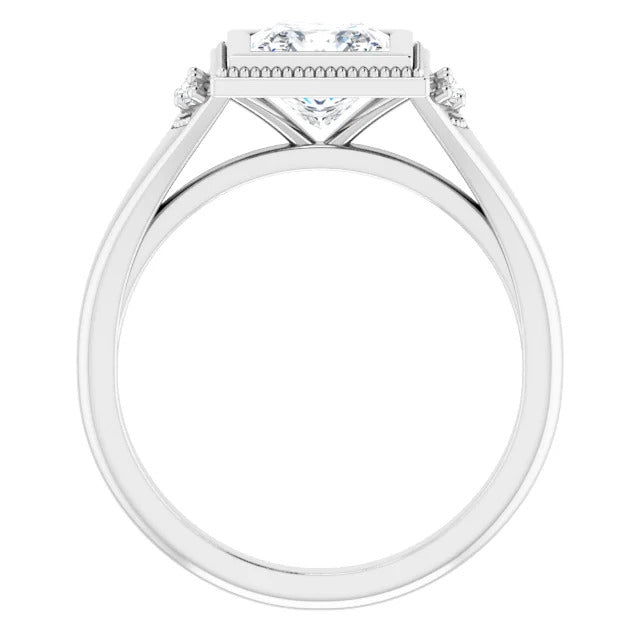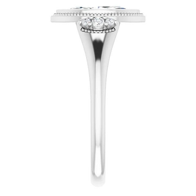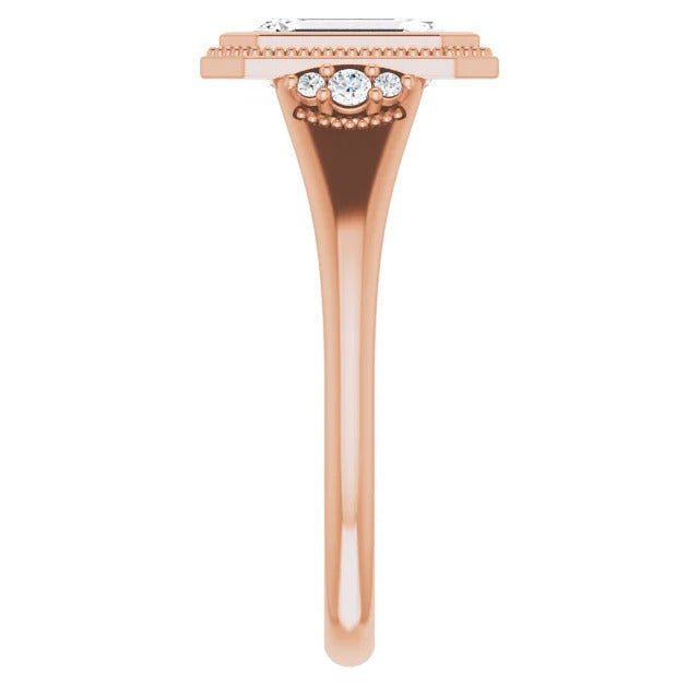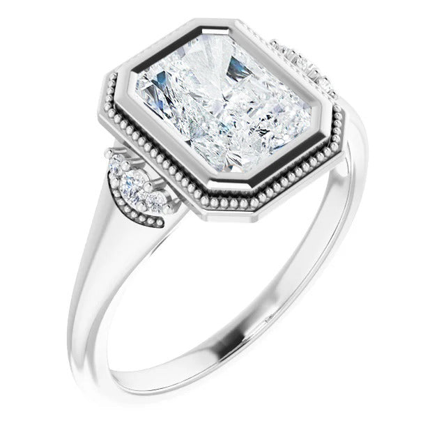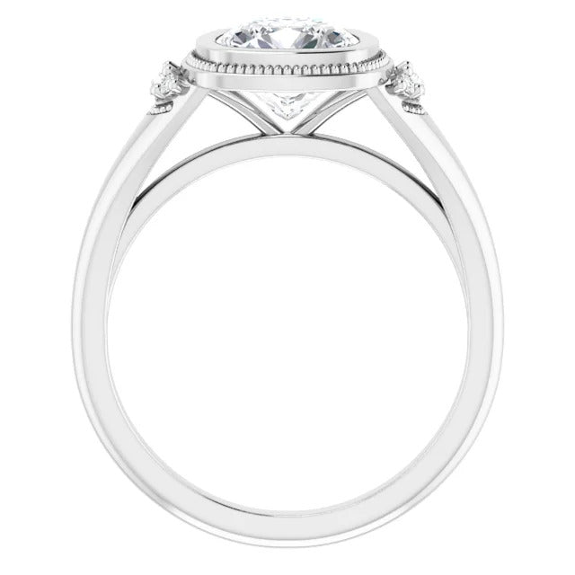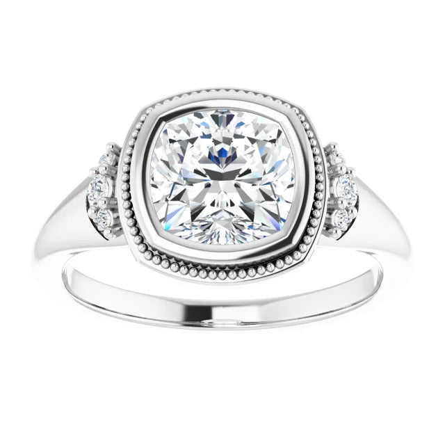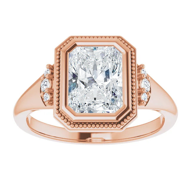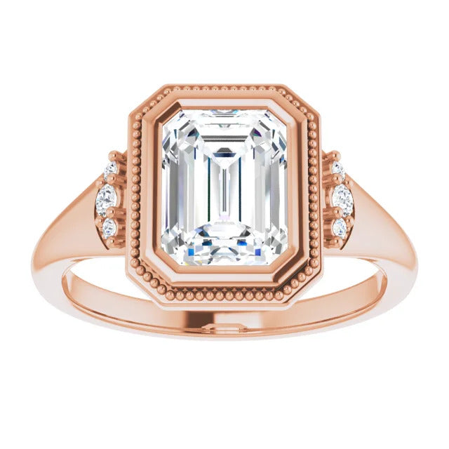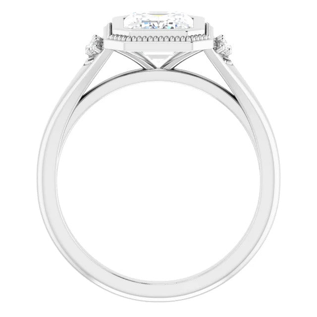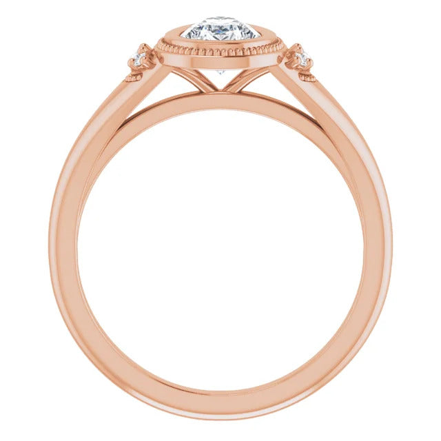 The Helen is an enchanting engagement ring that captures hearts with its charm. With a cathedral bezel setting and delicate beaded details throughout, this stunning piece features three pavé diamonds on each side of the center stone, adding a touch of shimmer and sophistication.