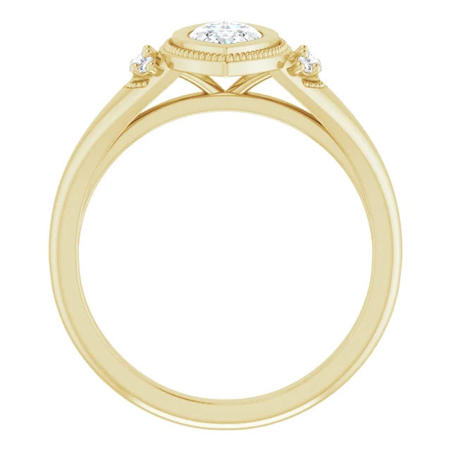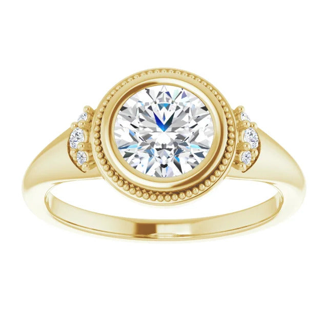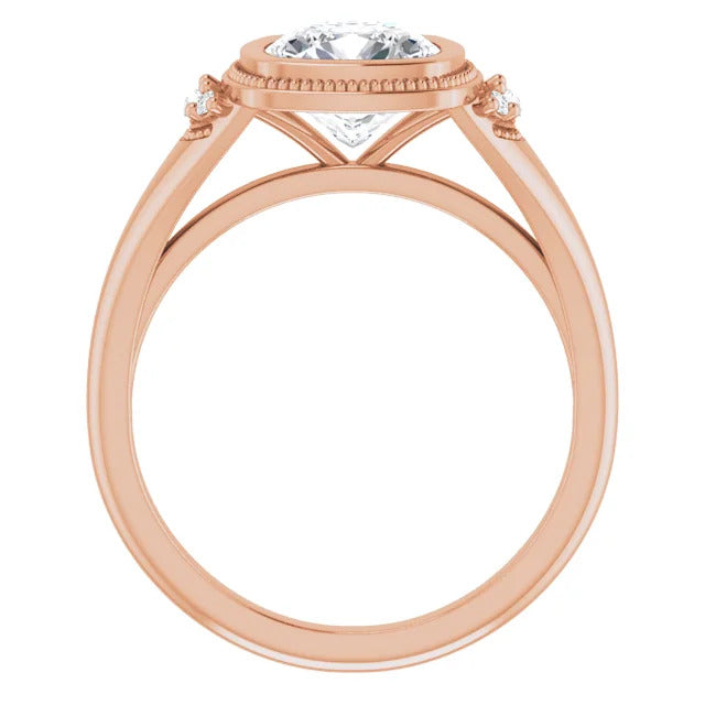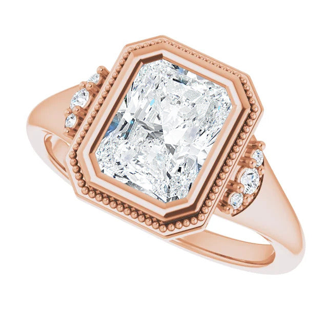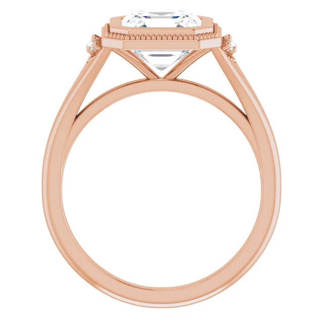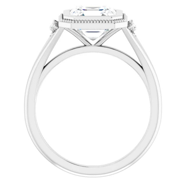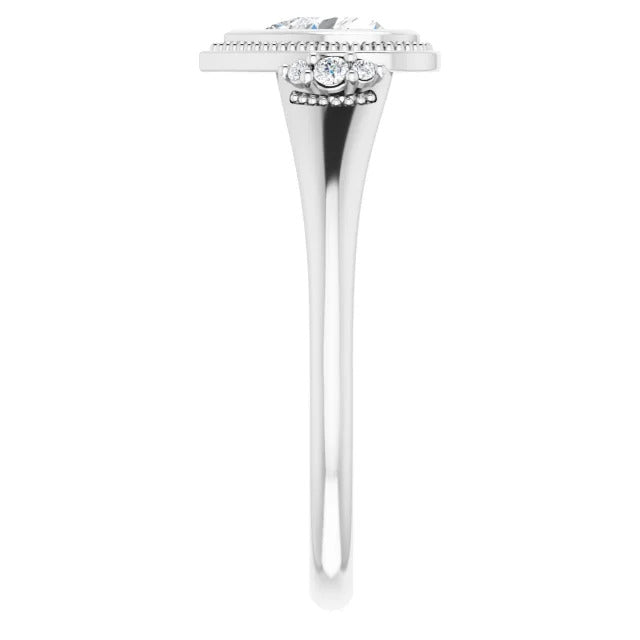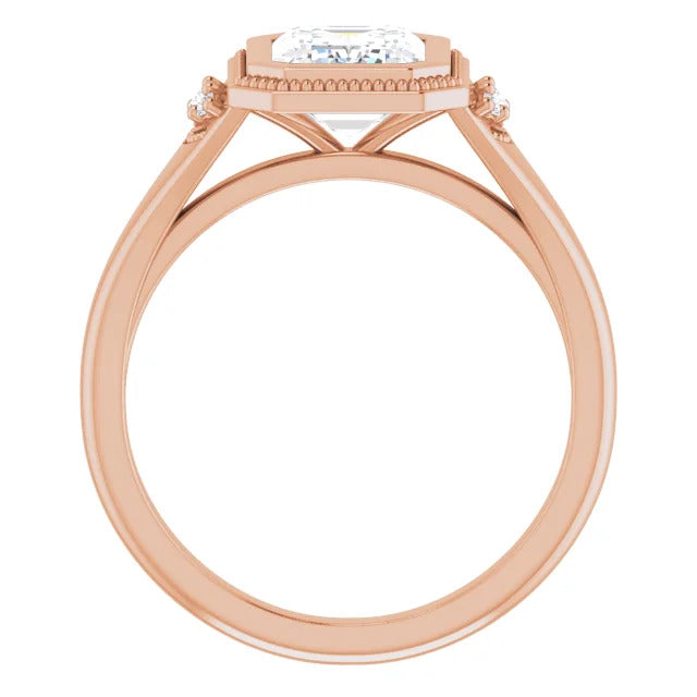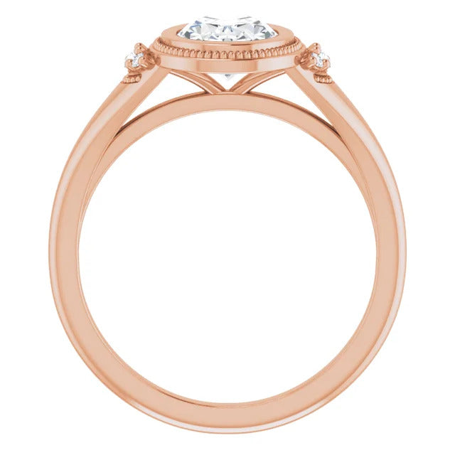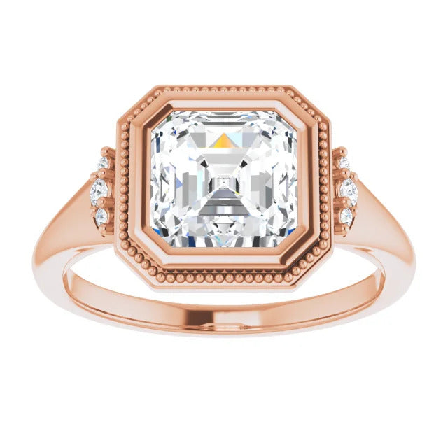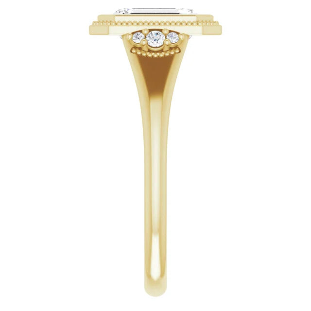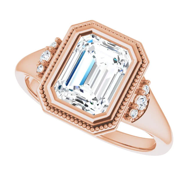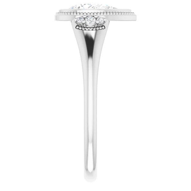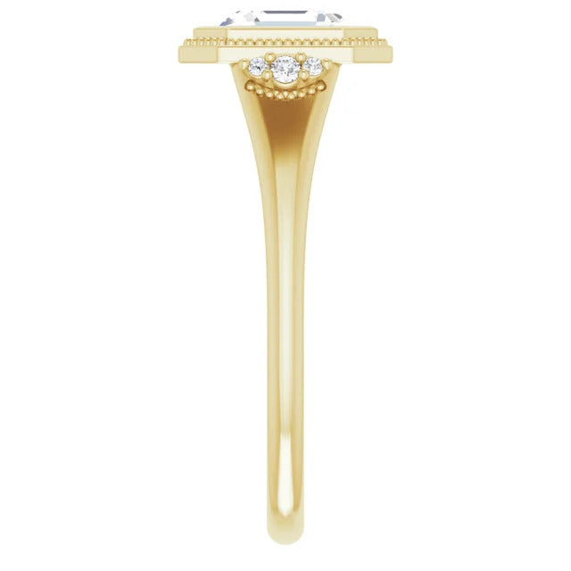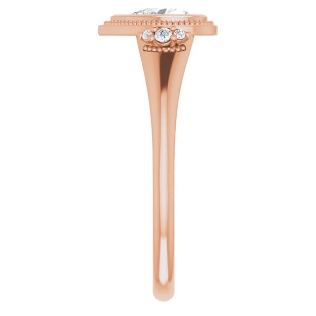 The Helen is an enchanting engagement ring that captures hearts with its charm. With a cathedral bezel setting and delicate beaded details throughout, this stunning piece features three pavé diamonds on each side of the center stone, adding a touch of shimmer and sophistication.