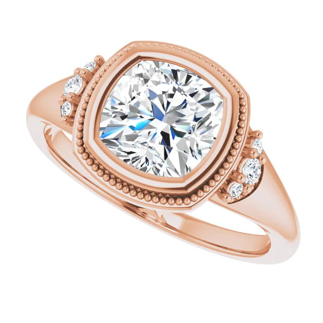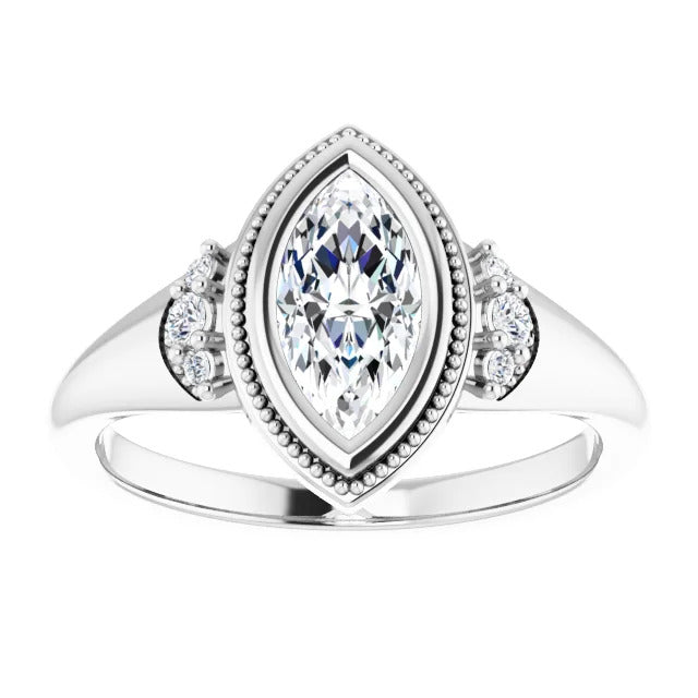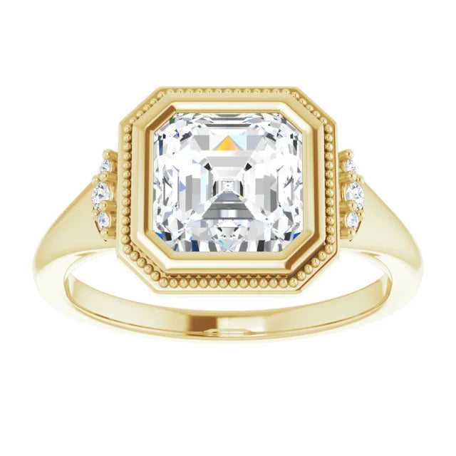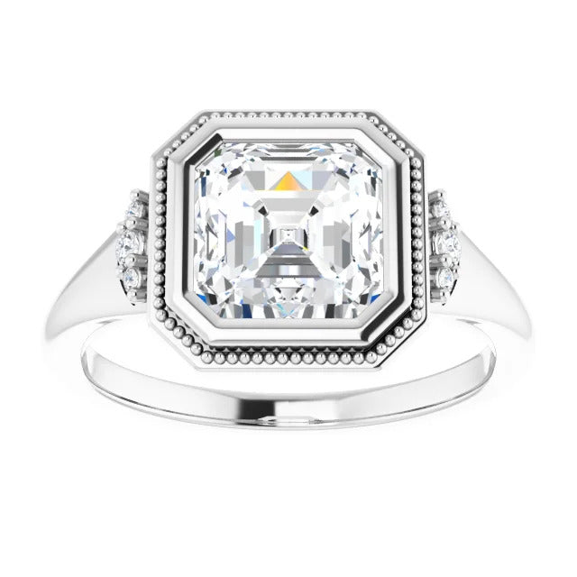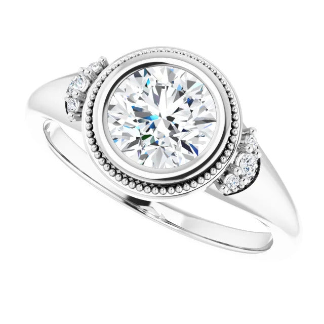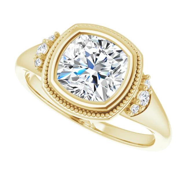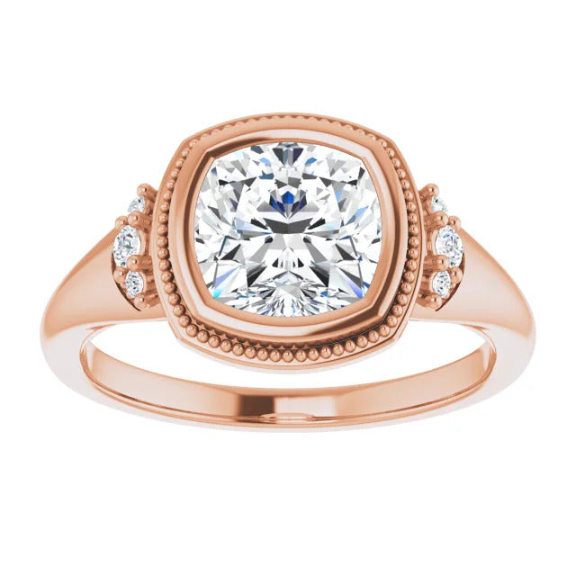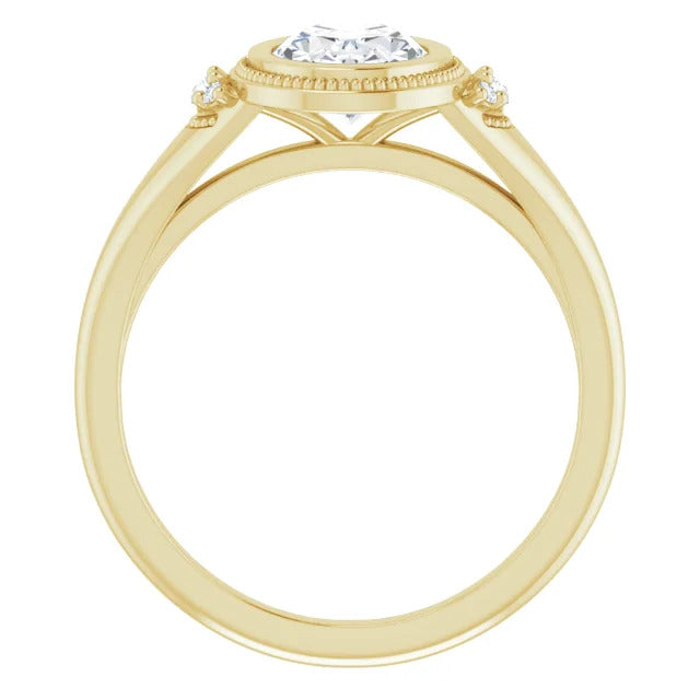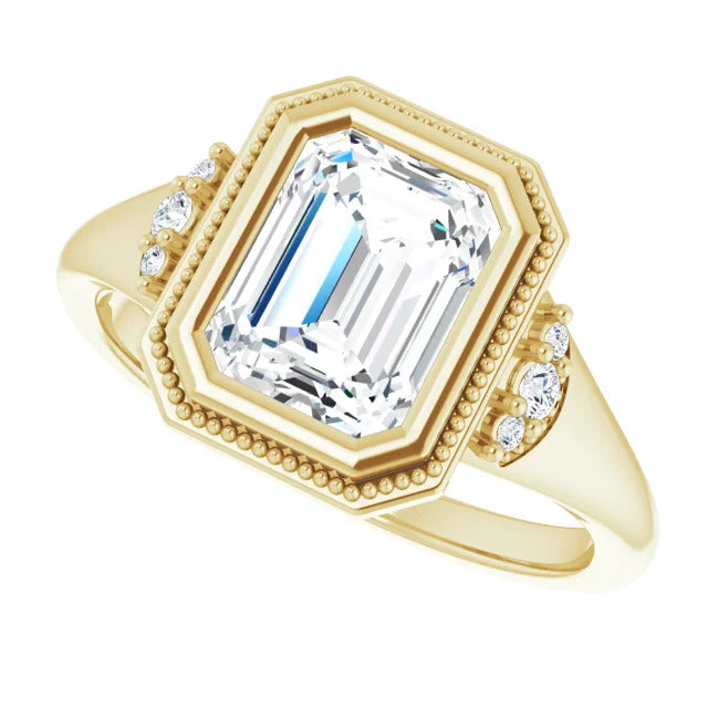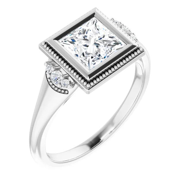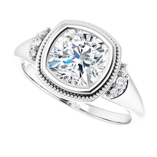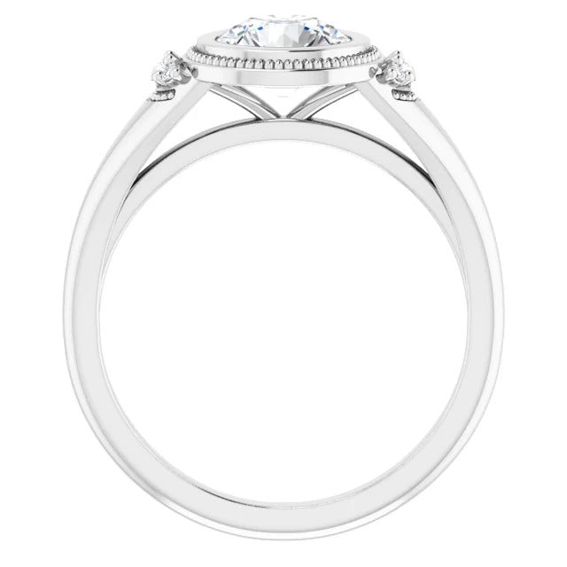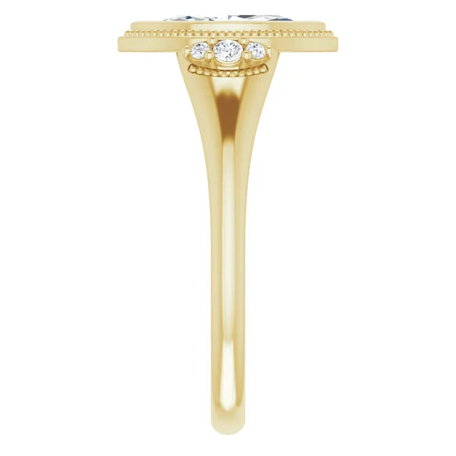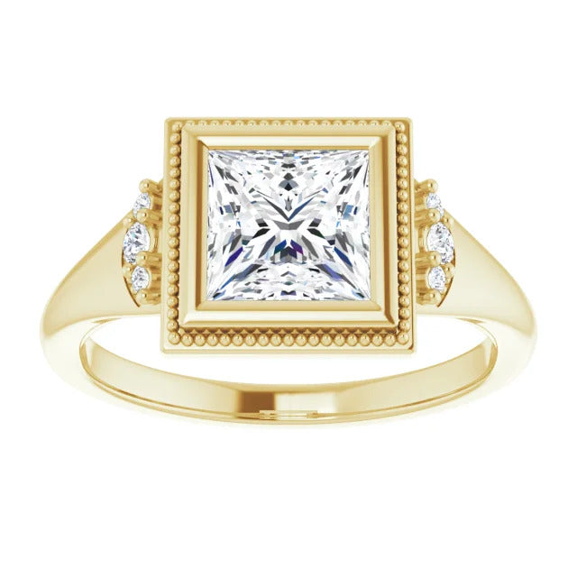 The Helen is an enchanting engagement ring that captures hearts with its charm. With a cathedral bezel setting and delicate beaded details throughout, this stunning piece features three pavé diamonds on each side of the center stone, adding a touch of shimmer and sophistication.