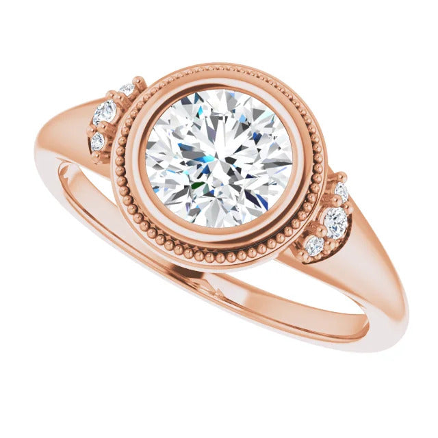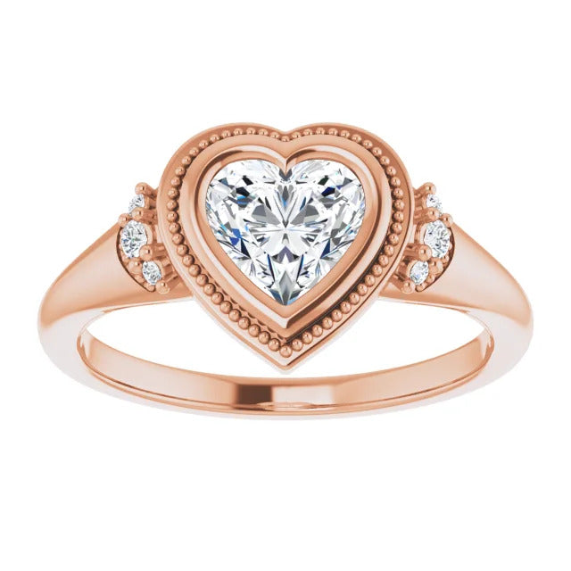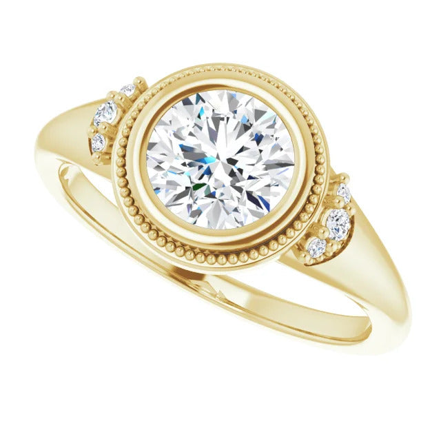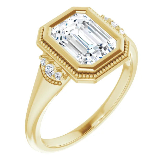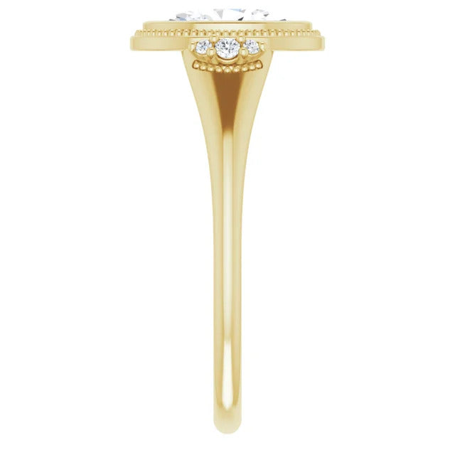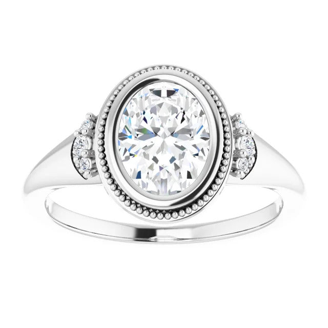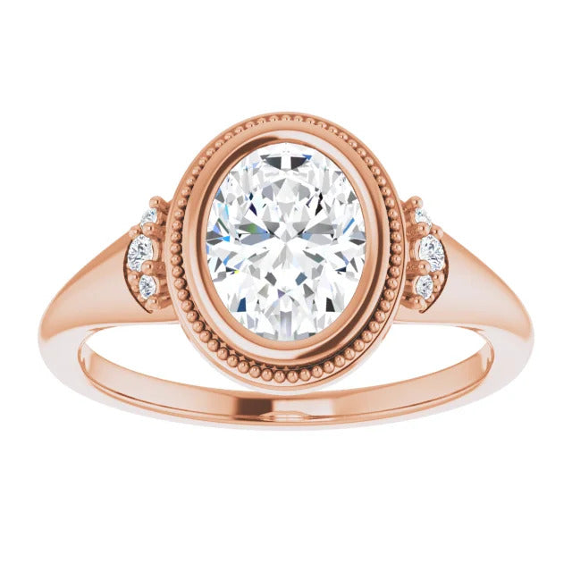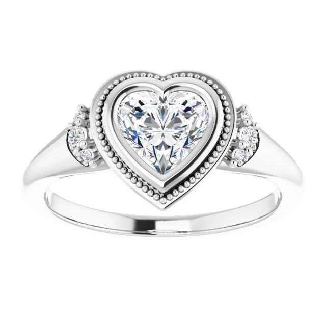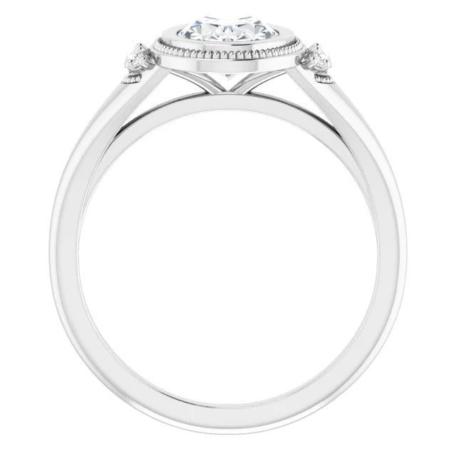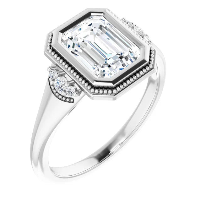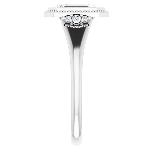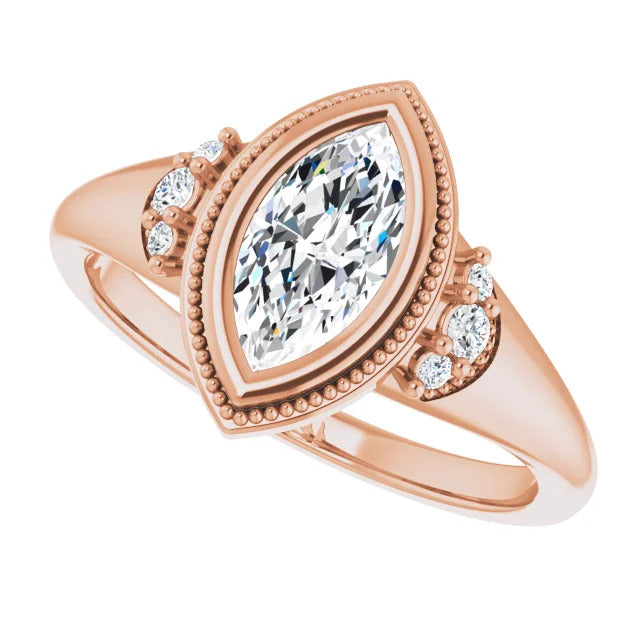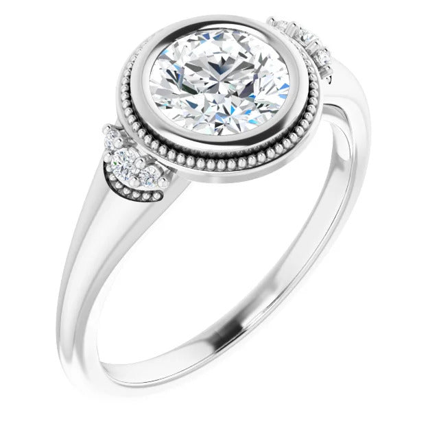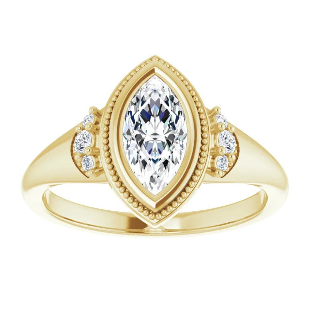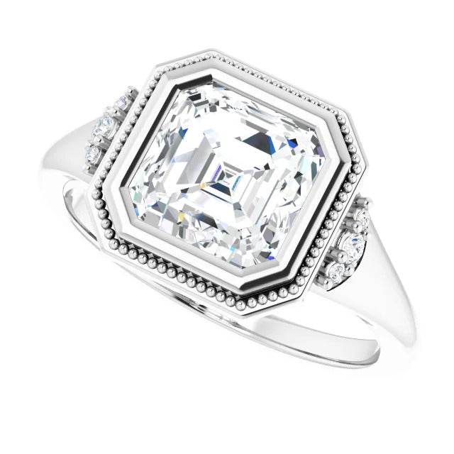 The Helen is an enchanting engagement ring that captures hearts with its charm. With a cathedral bezel setting and delicate beaded details throughout, this stunning piece features three pavé diamonds on each side of the center stone, adding a touch of shimmer and sophistication.