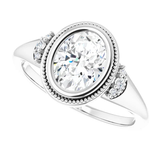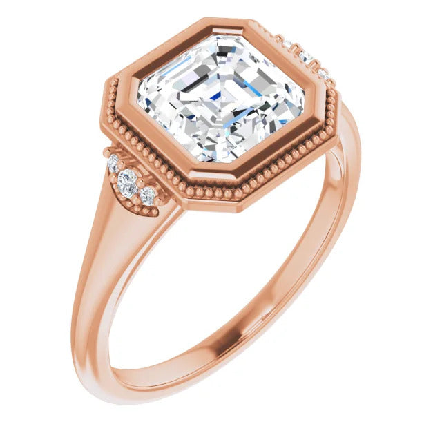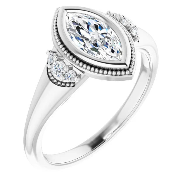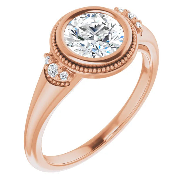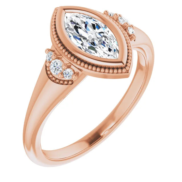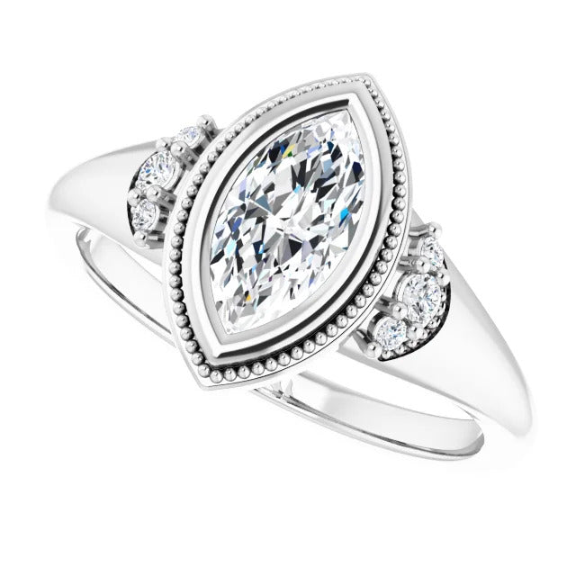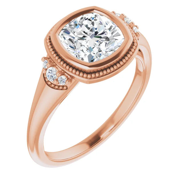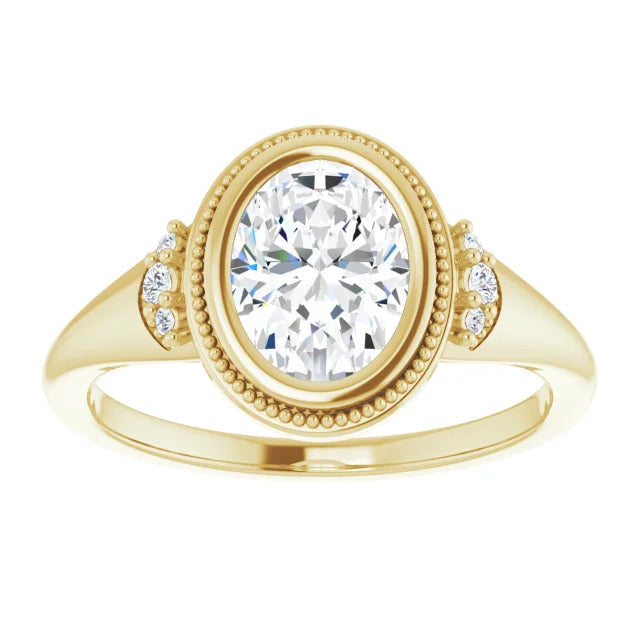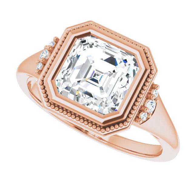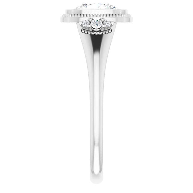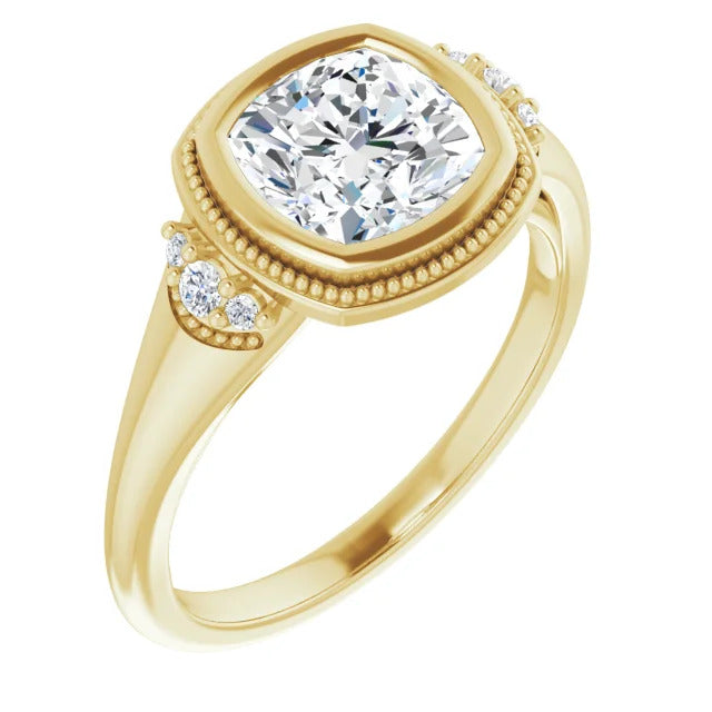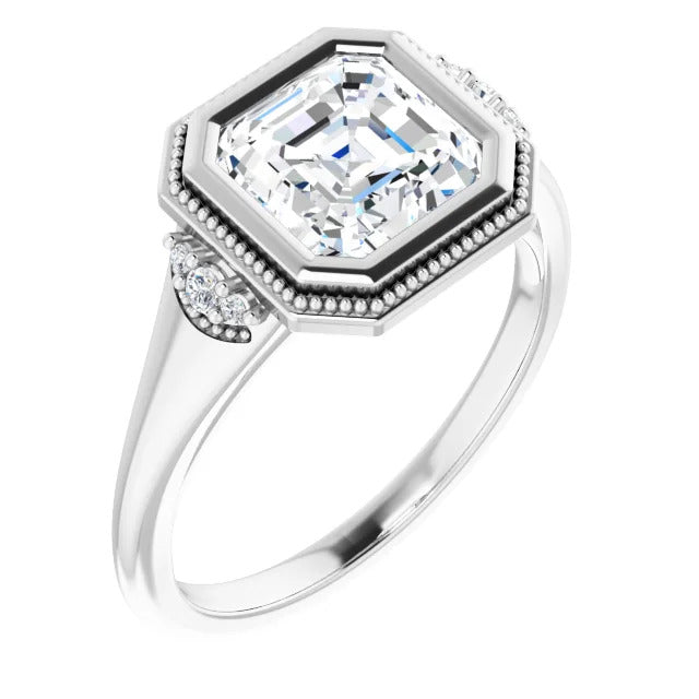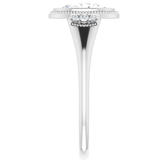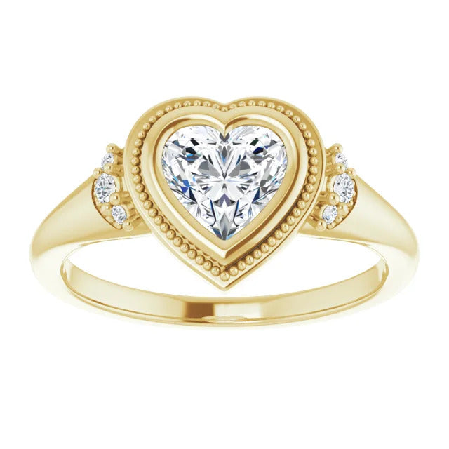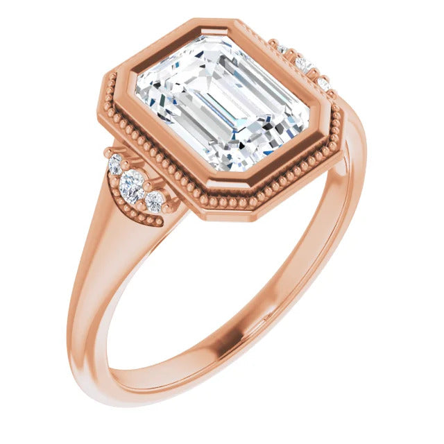 The Helen is an enchanting engagement ring that captures hearts with its charm. With a cathedral bezel setting and delicate beaded details throughout, this stunning piece features three pavé diamonds on each side of the center stone, adding a touch of shimmer and sophistication.