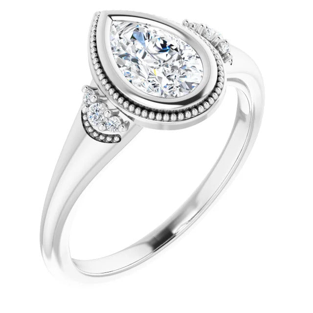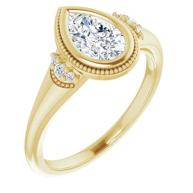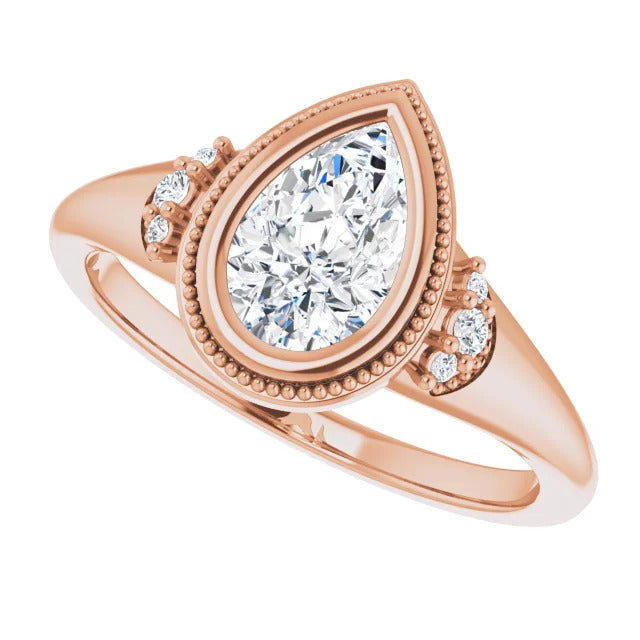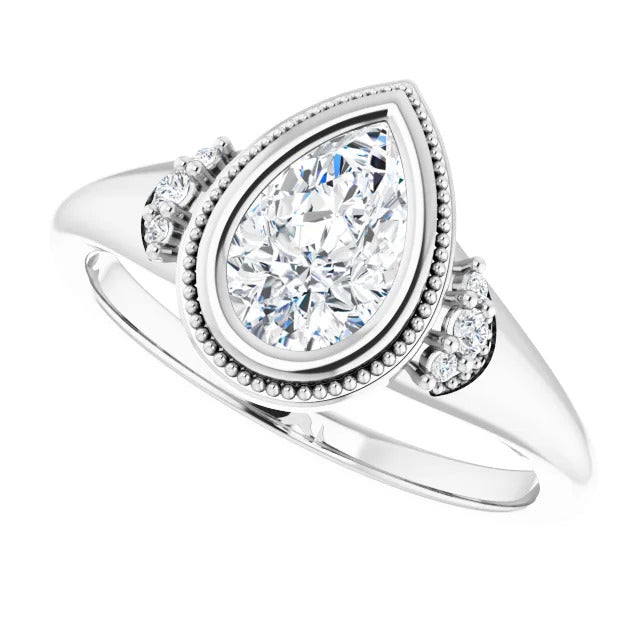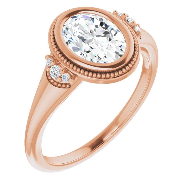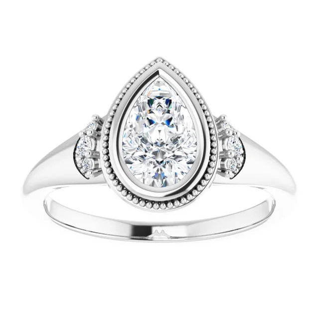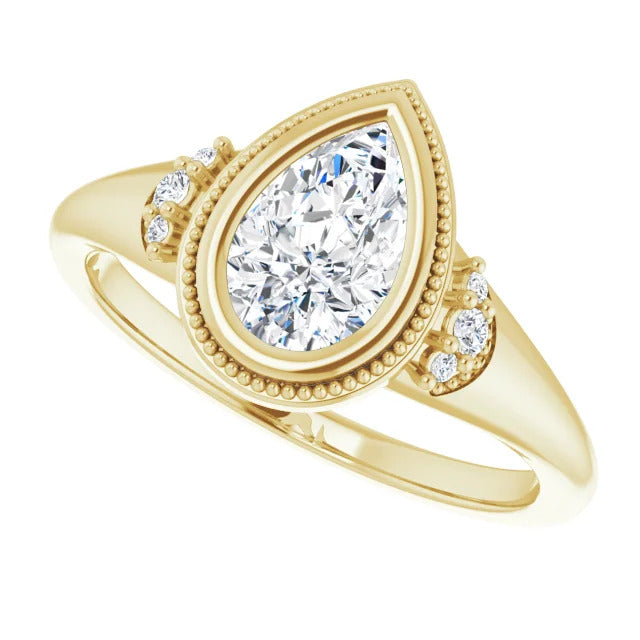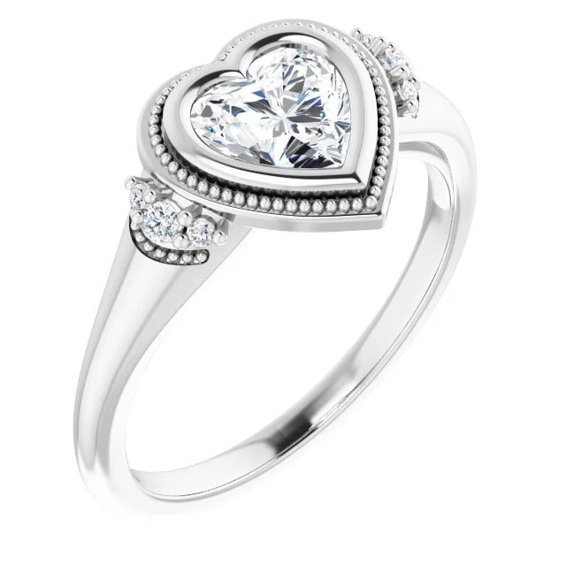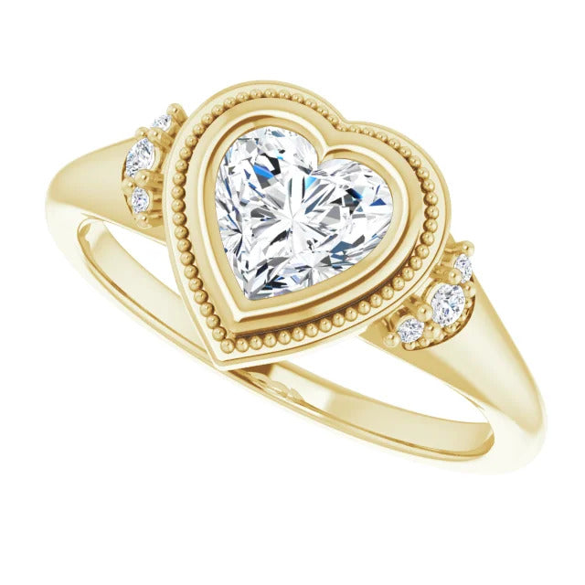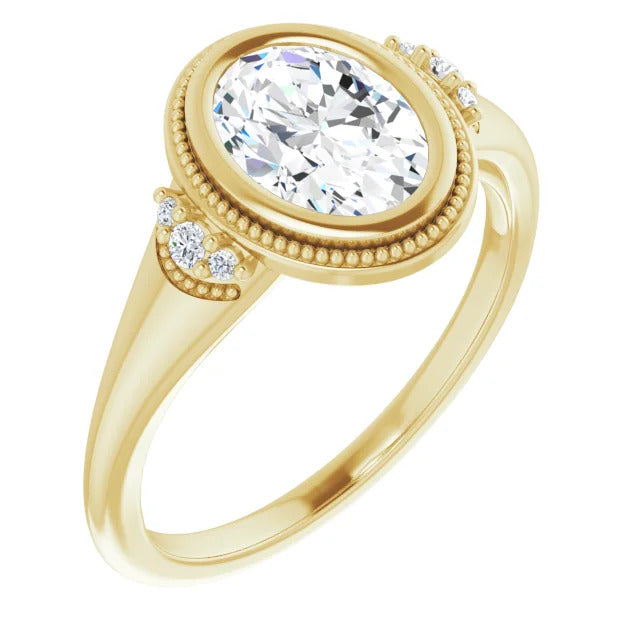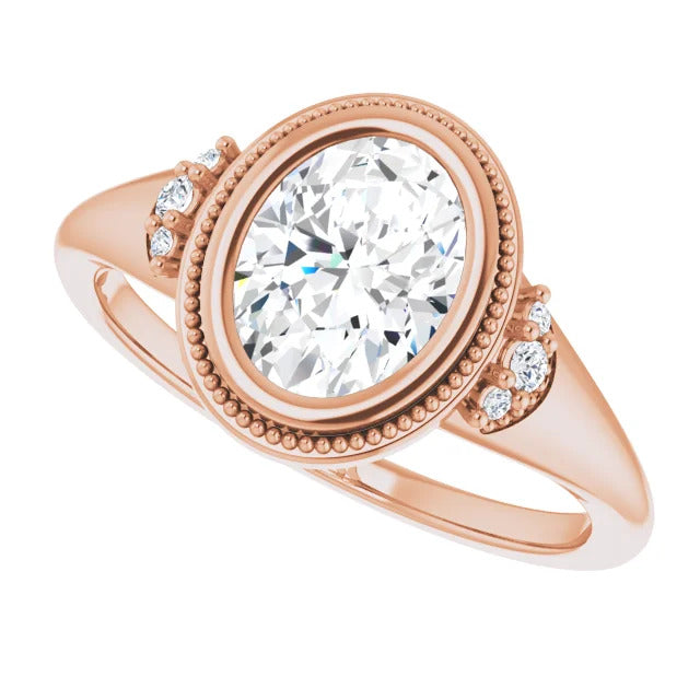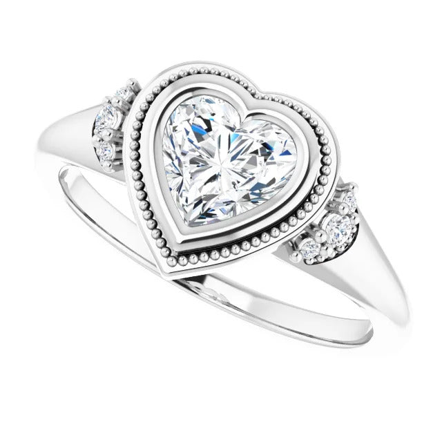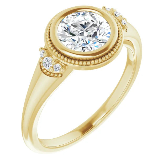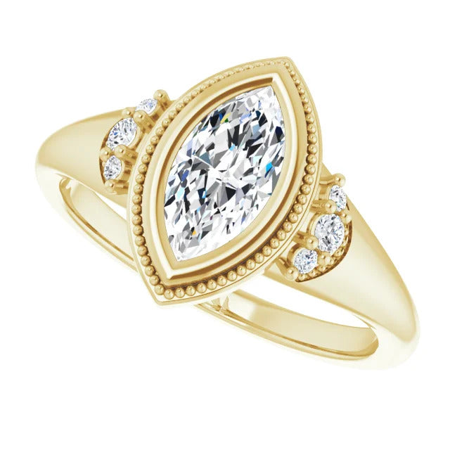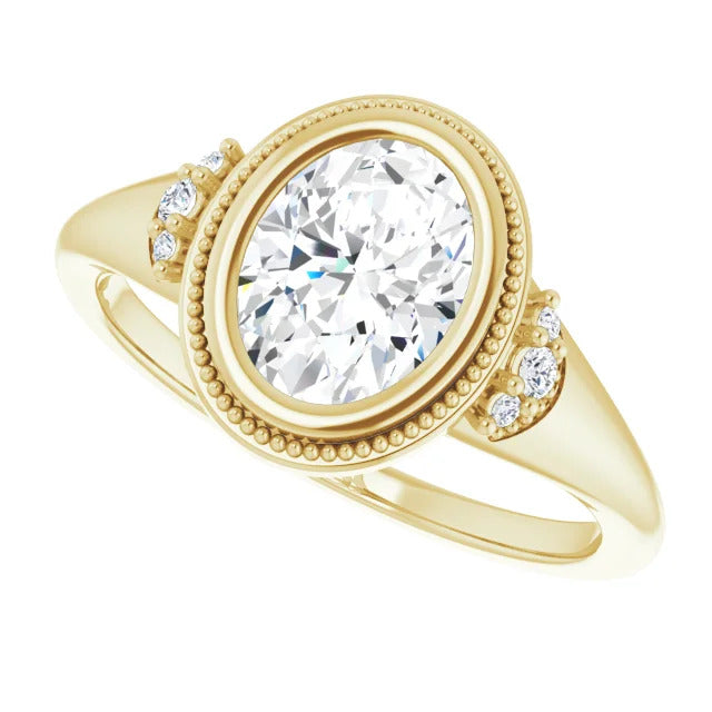The Helen is an enchanting engagement ring that captures hearts with its charm. With a cathedral bezel setting and delicate beaded details throughout, this stunning piece features three pavé diamonds on each side of the center stone, adding a touch of shimmer and sophistication.