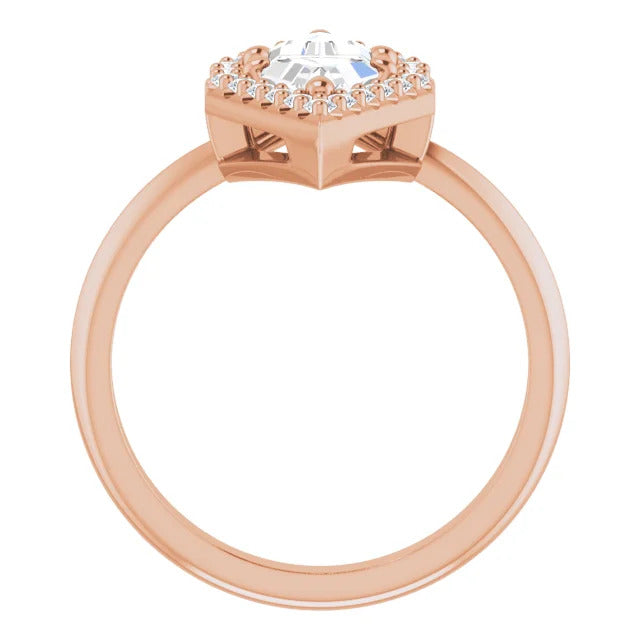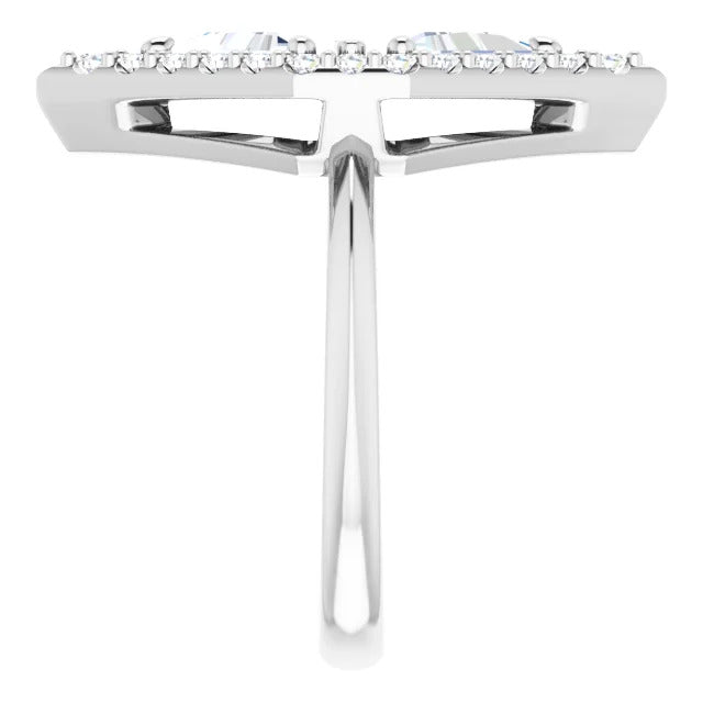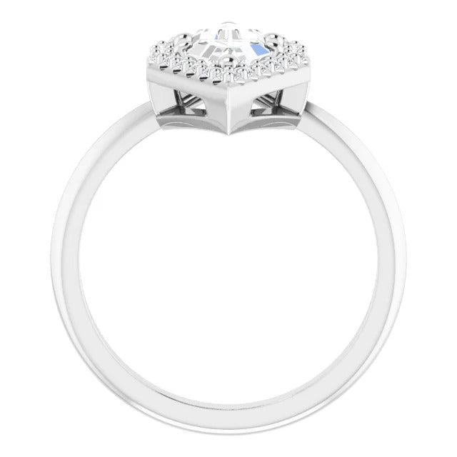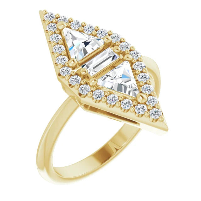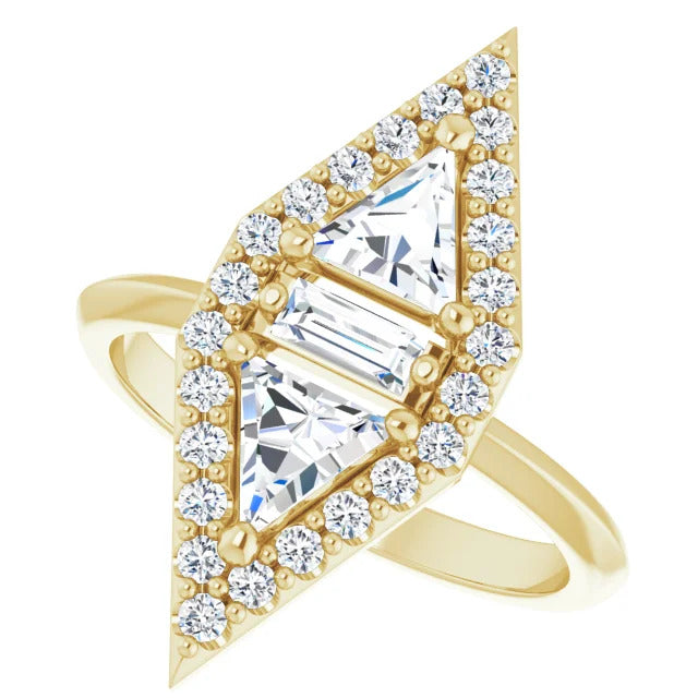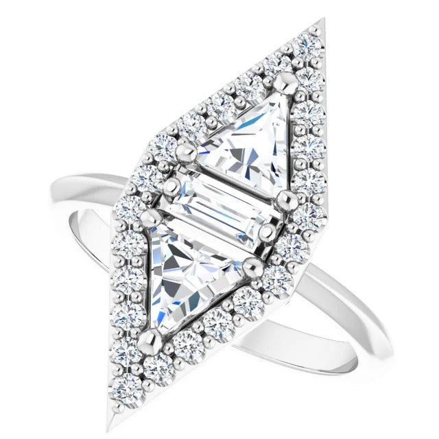 The Irina is a strikingly beautiful engagement ring that features a trio of two trillion and one baguette diamond at the center, forming a stunning rhombus shape. It is accompanied by pavé diamonds accented throughout the halo, combining a unique geometric design with brilliant sparkle.