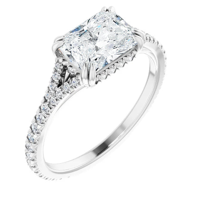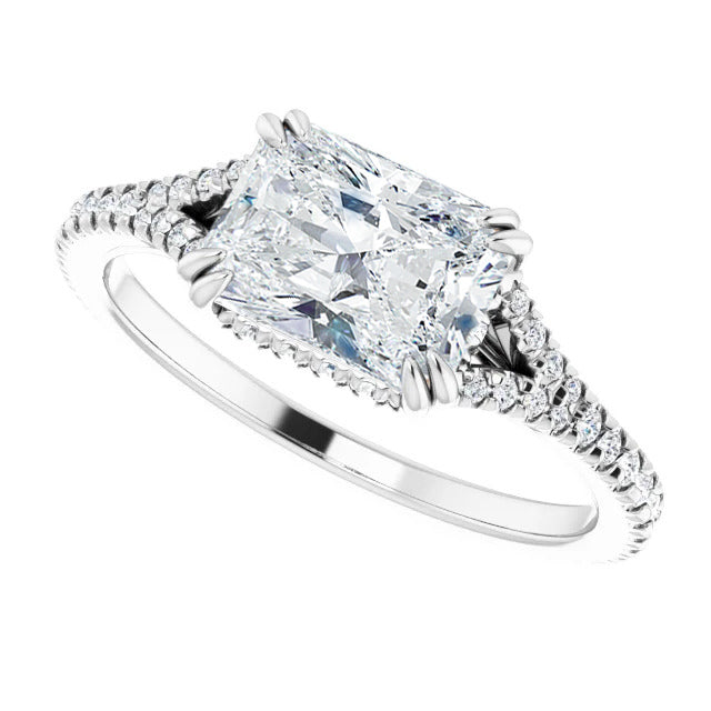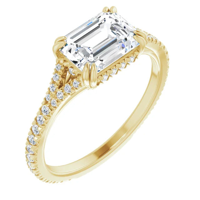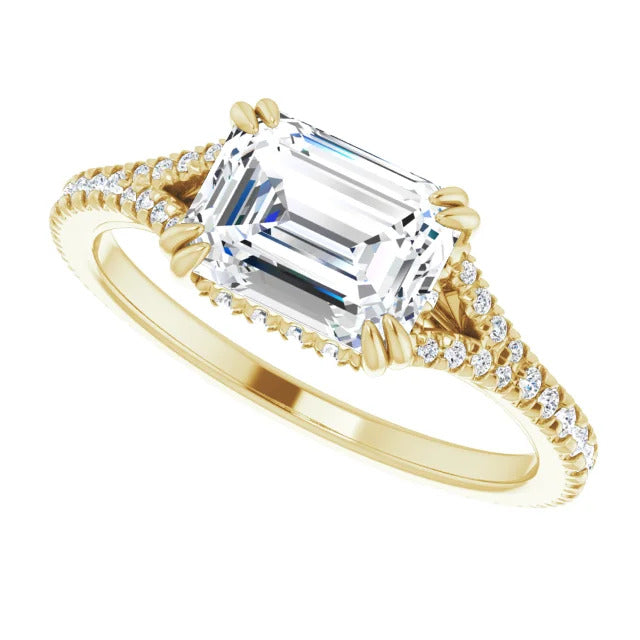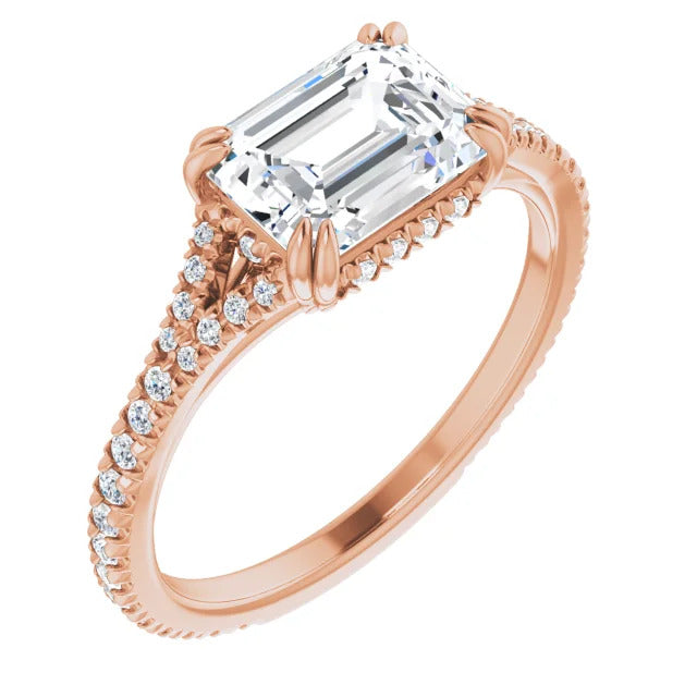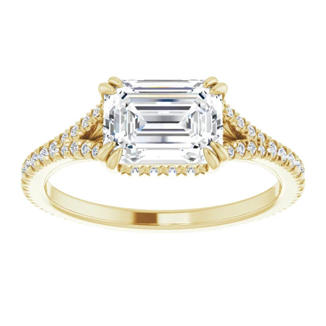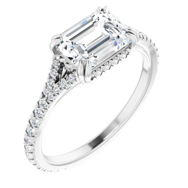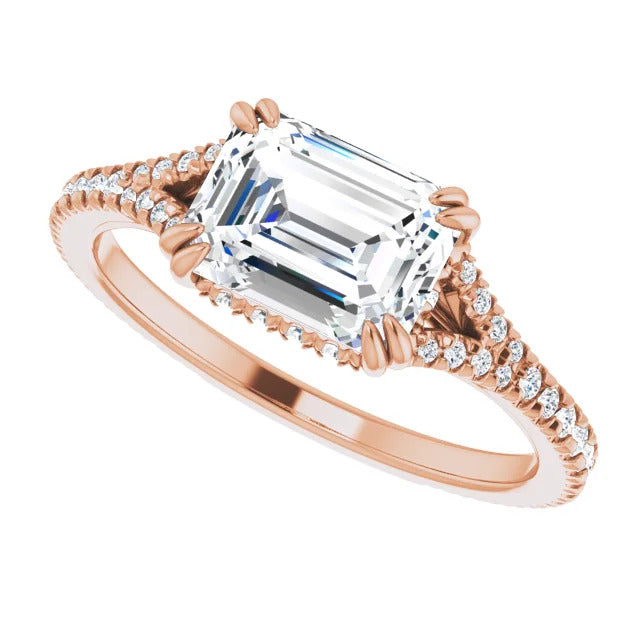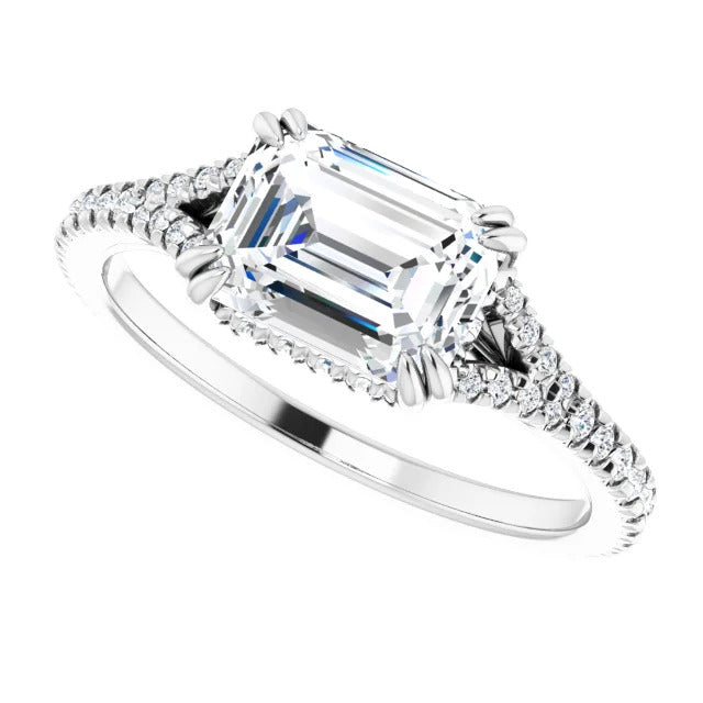 The Margot is an exquisite engagement ring with a split shank setting that showcases a captivating emerald center stone set east to west embraced by double claw prongs. It is beautifully complemented by french-set pavé diamonds that embellish the shank three-quarters of the way around, creating a mesmerizing display of artistry and sparkle.
