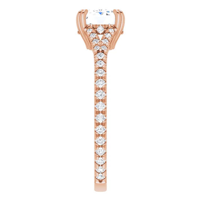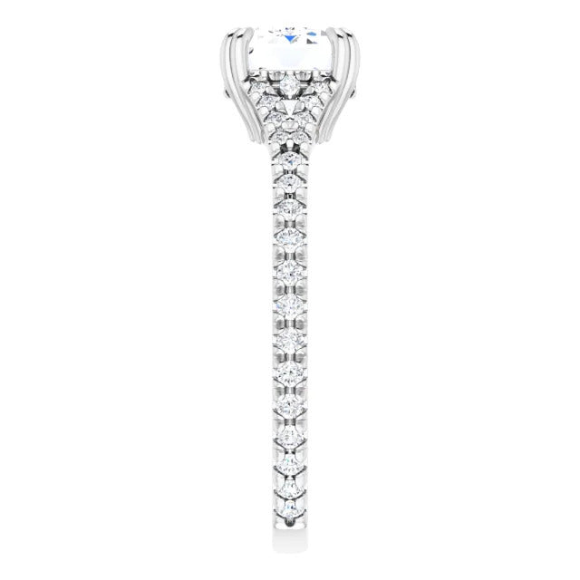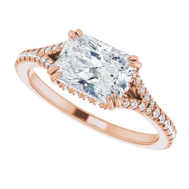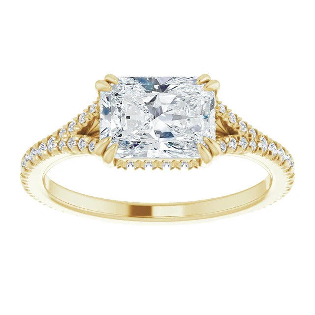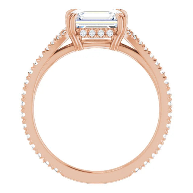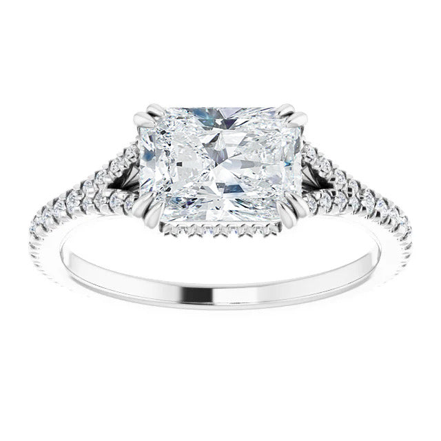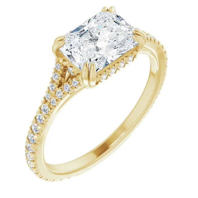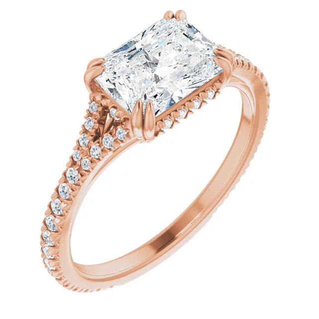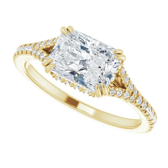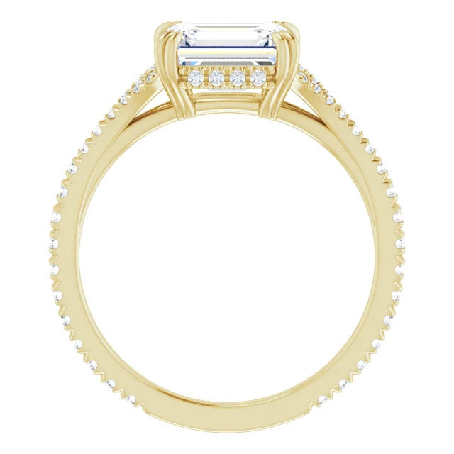 The Margot is an exquisite engagement ring with a split shank setting that showcases a captivating emerald center stone set east to west embraced by double claw prongs. It is beautifully complemented by french-set pavé diamonds that embellish the shank three-quarters of the way around, creating a mesmerizing display of artistry and sparkle.