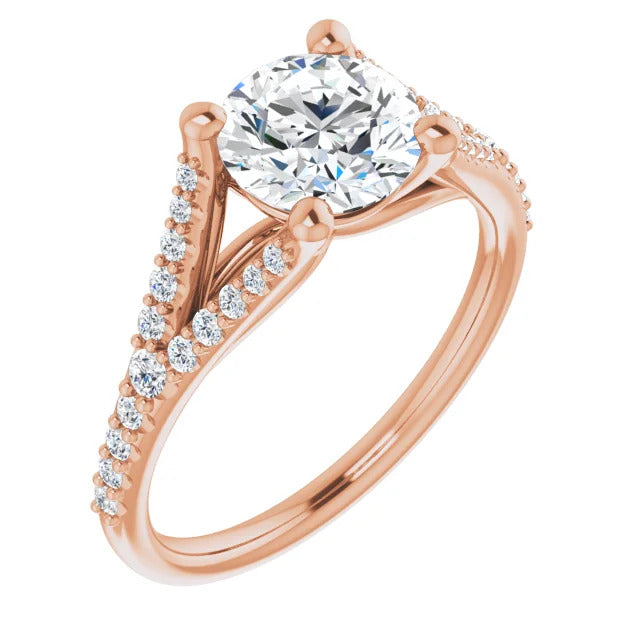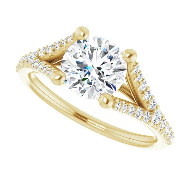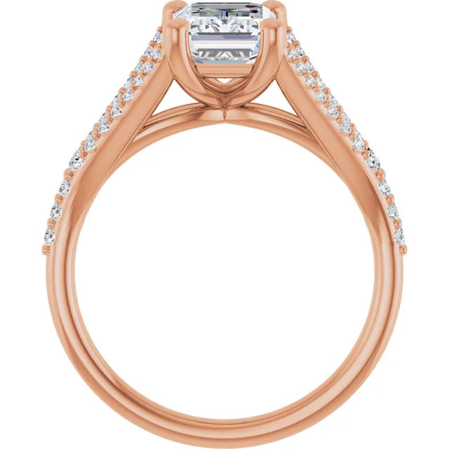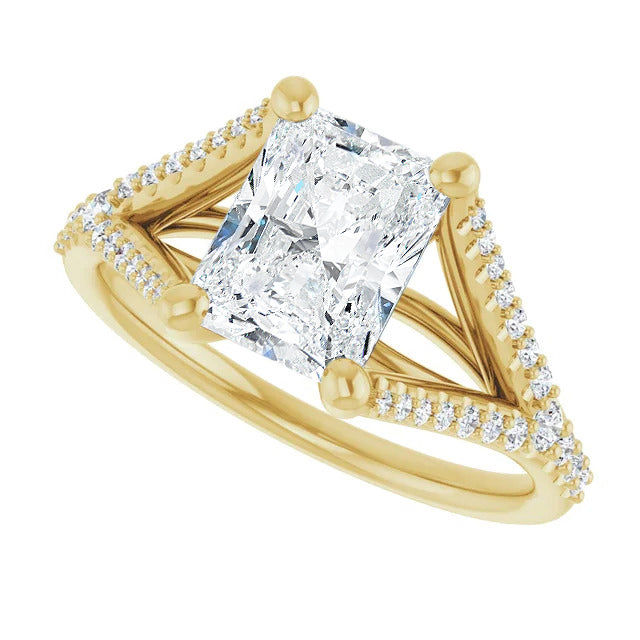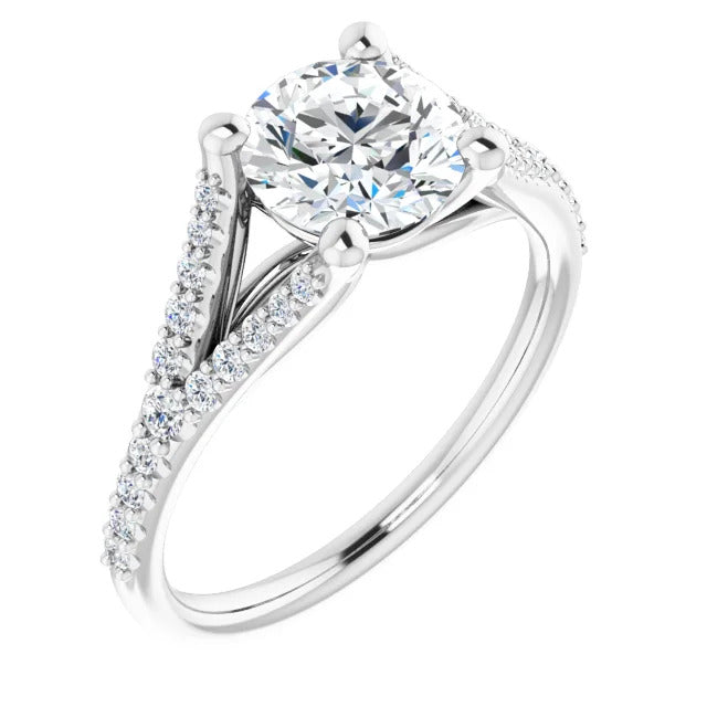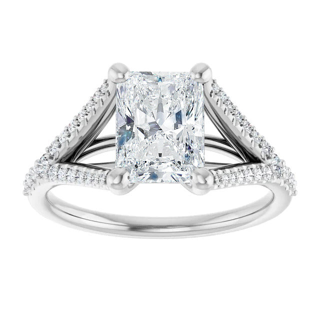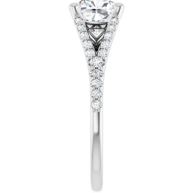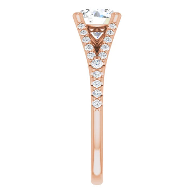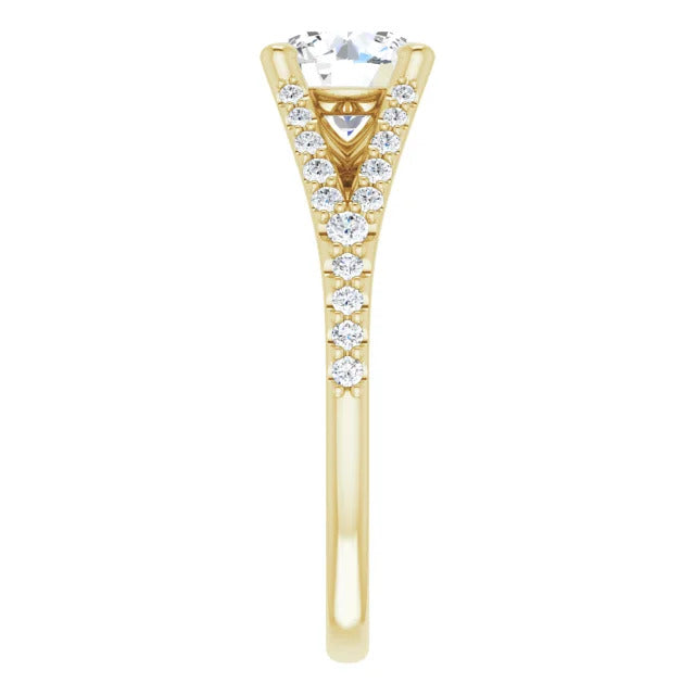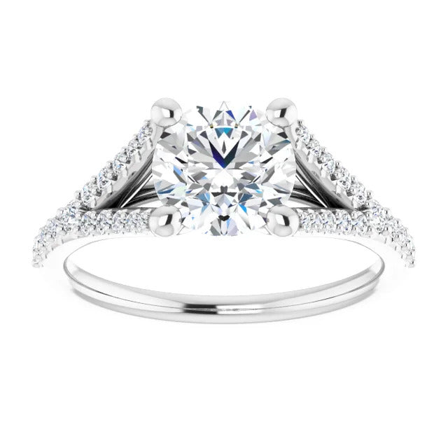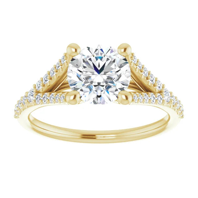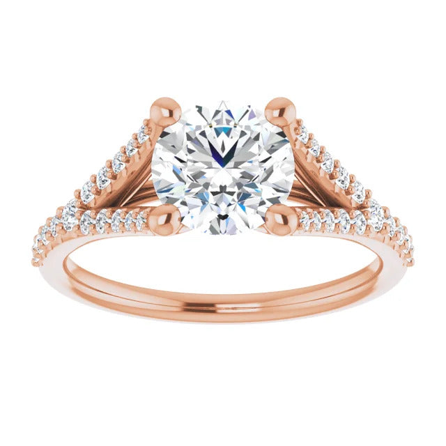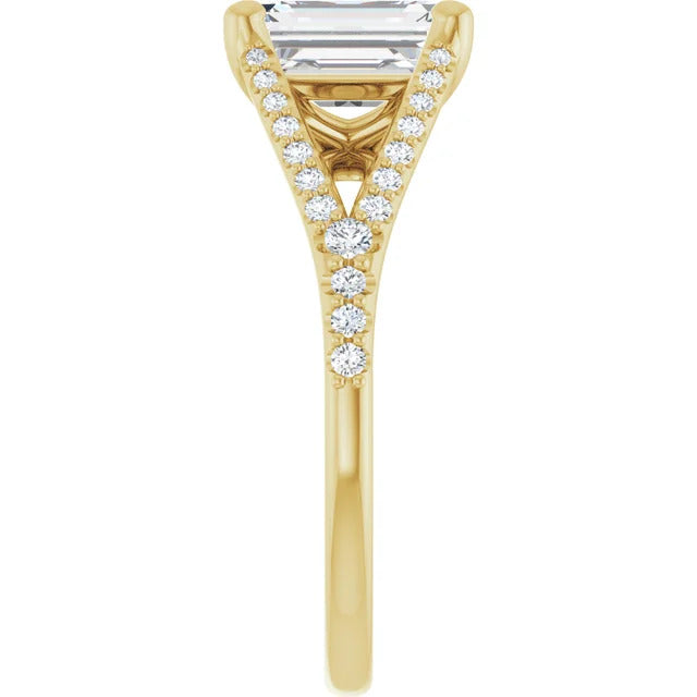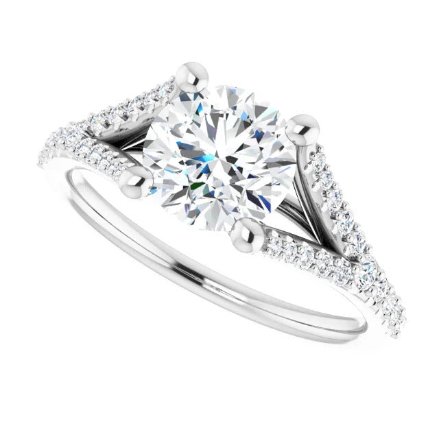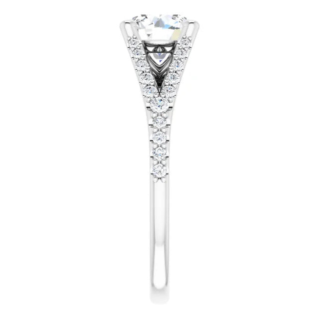 The Milan engagement ring is a dazzling split-shank cathedral setting that showcases shimmering pavé diamonds adorning the shank, adding a dimension of timeless beauty and exceptional craftsmanship.