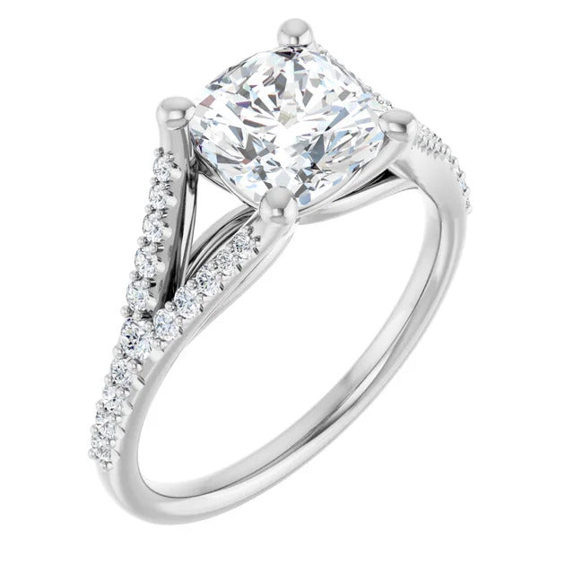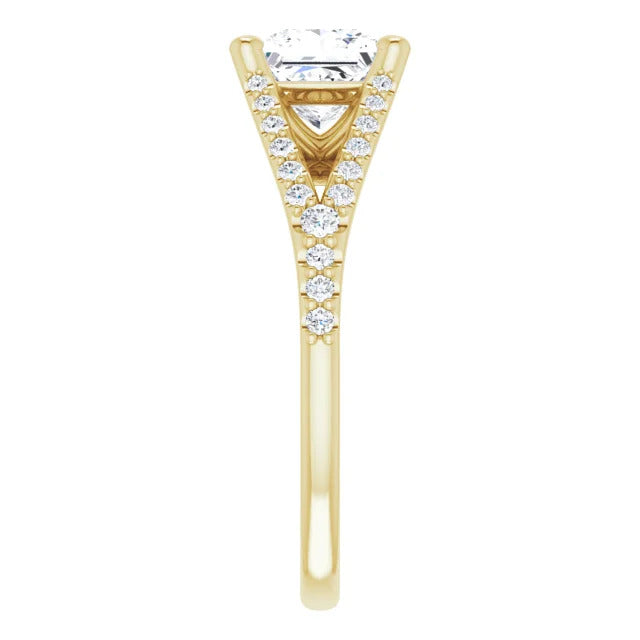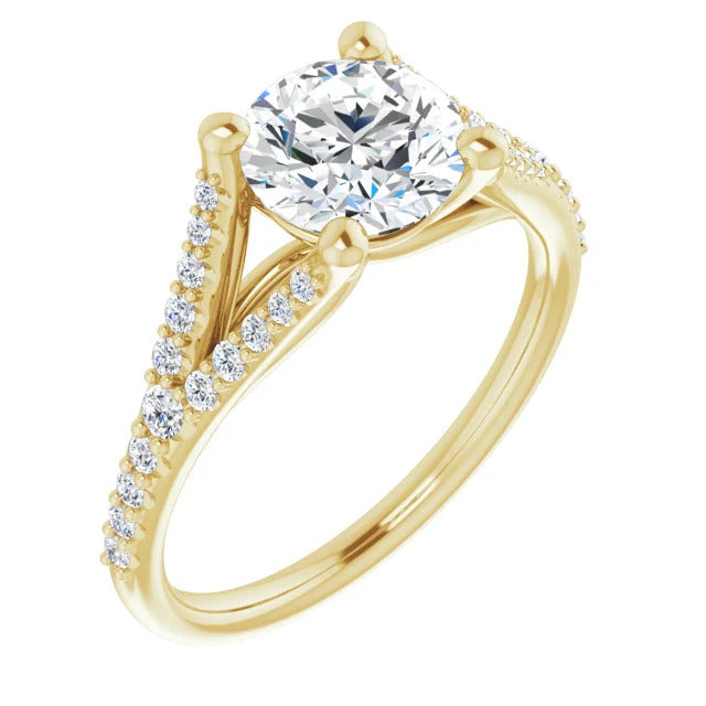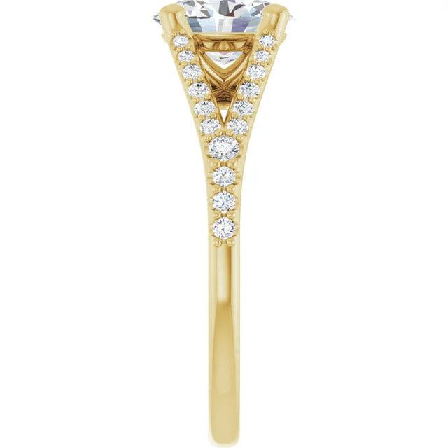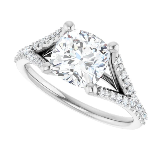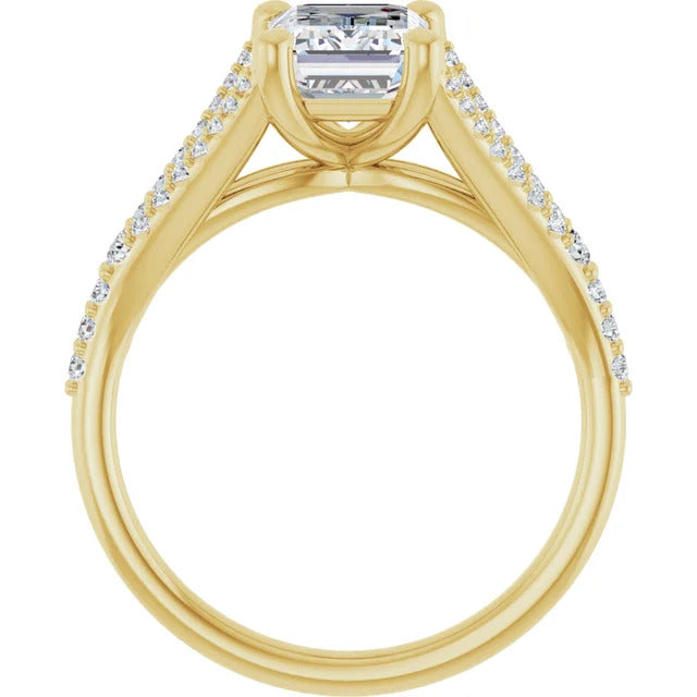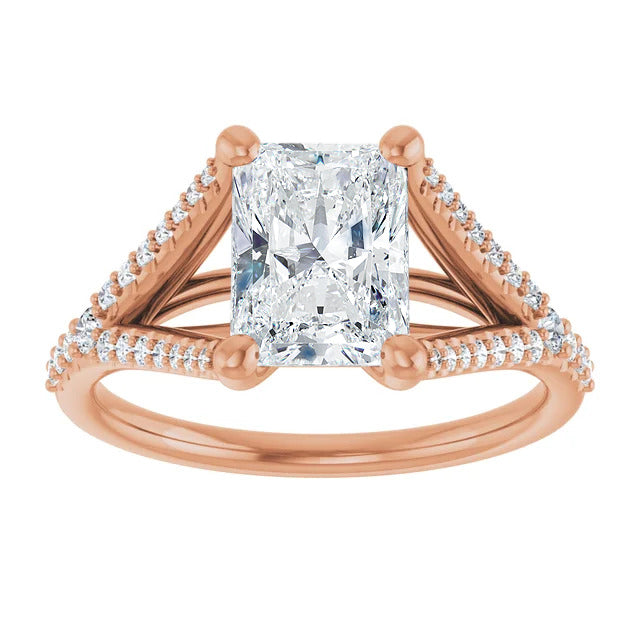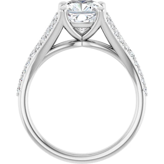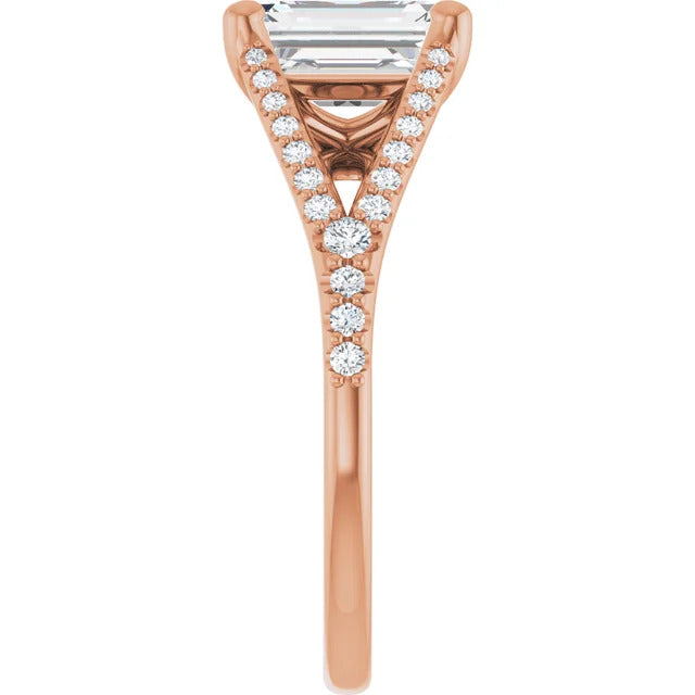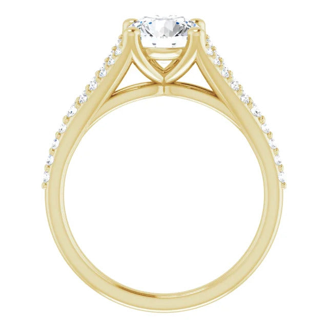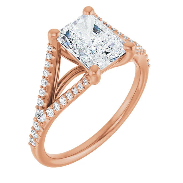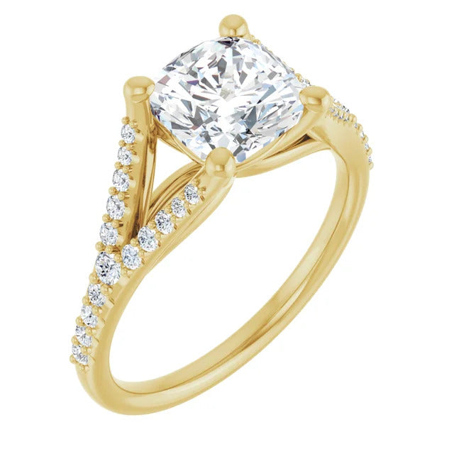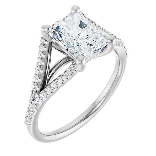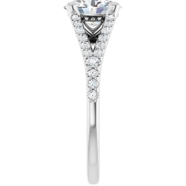 The Milan engagement ring is a dazzling split-shank cathedral setting that showcases shimmering pavé diamonds adorning the shank, adding a dimension of timeless beauty and exceptional craftsmanship.