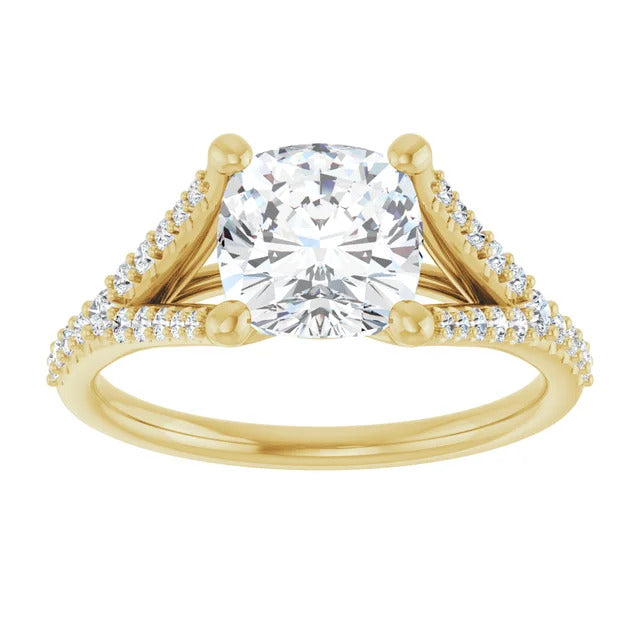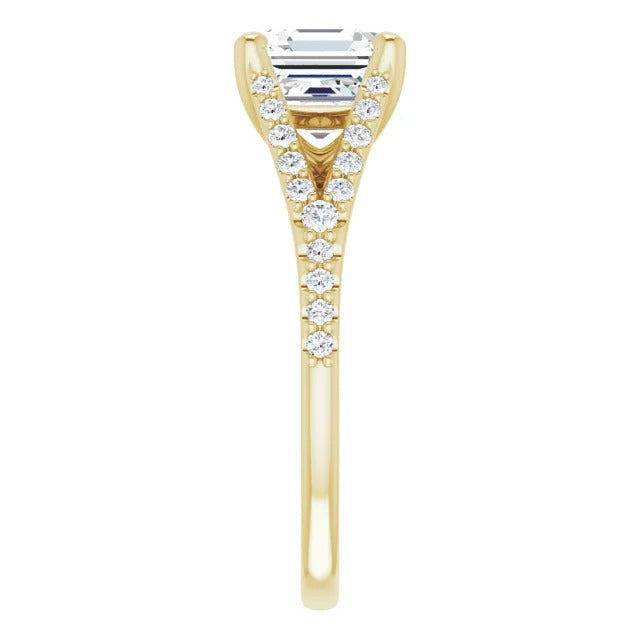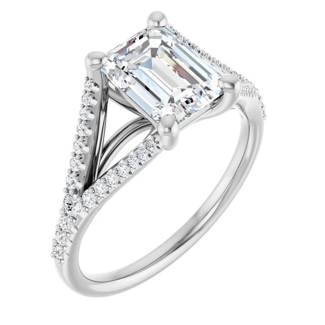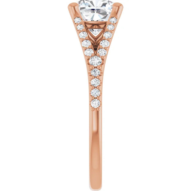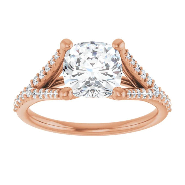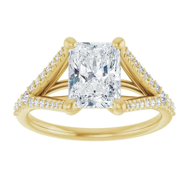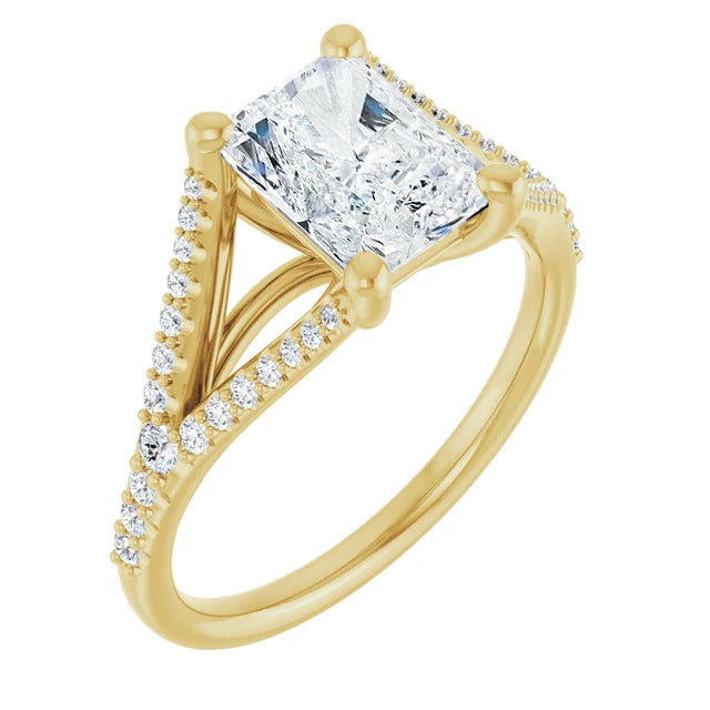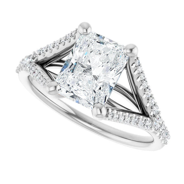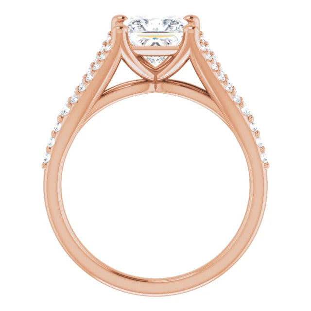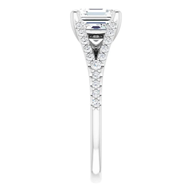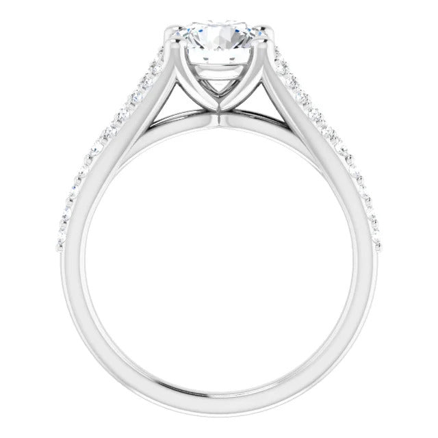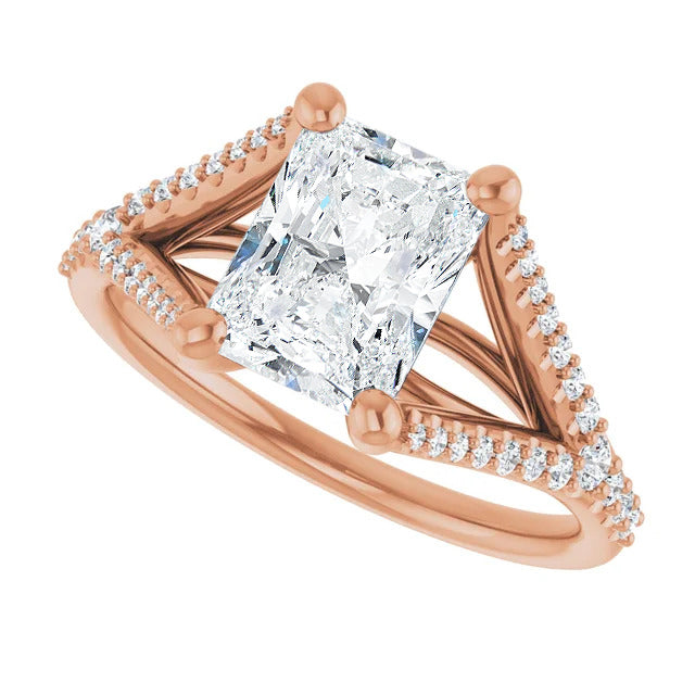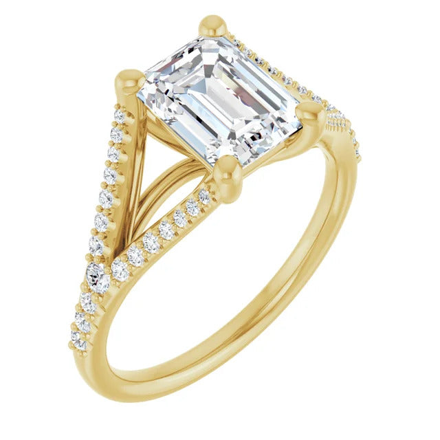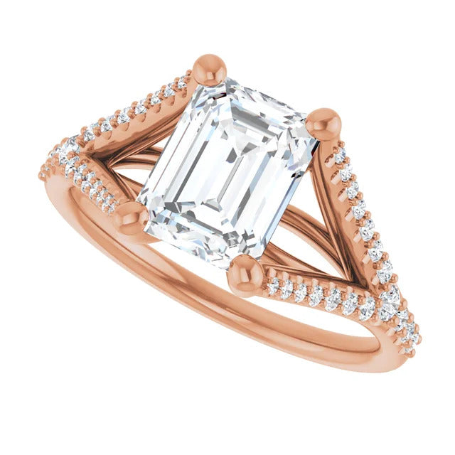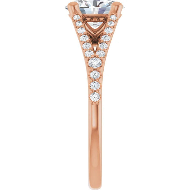 The Milan engagement ring is a dazzling split-shank cathedral setting that showcases shimmering pavé diamonds adorning the shank, adding a dimension of timeless beauty and exceptional craftsmanship.