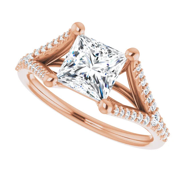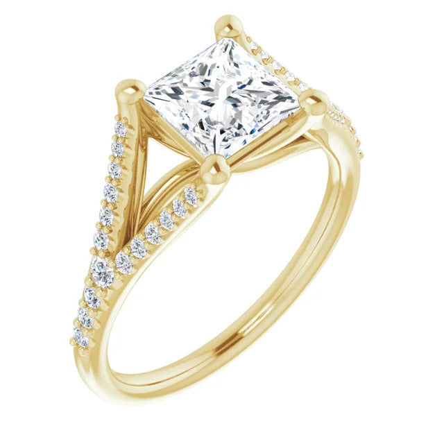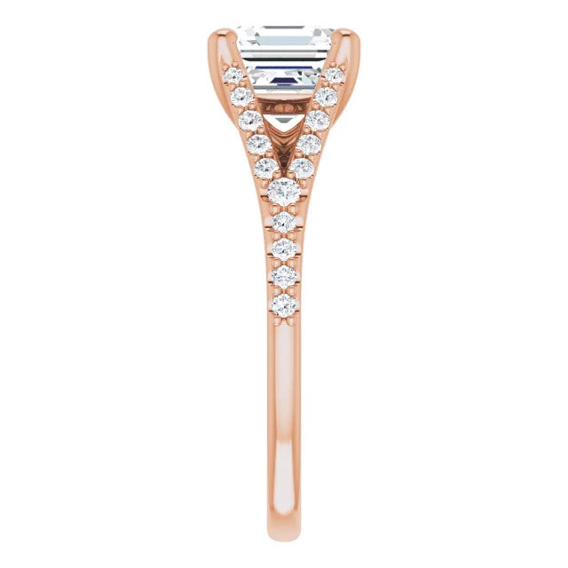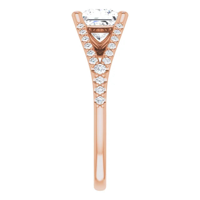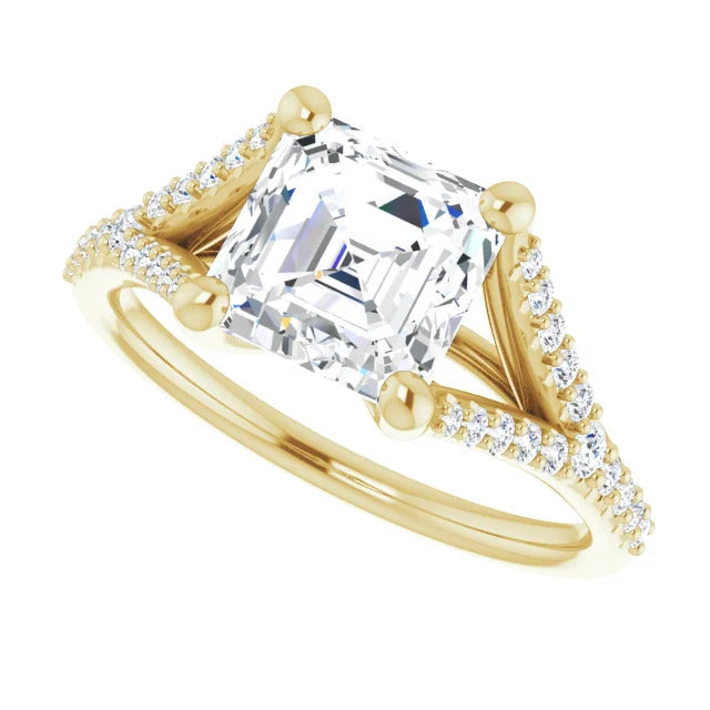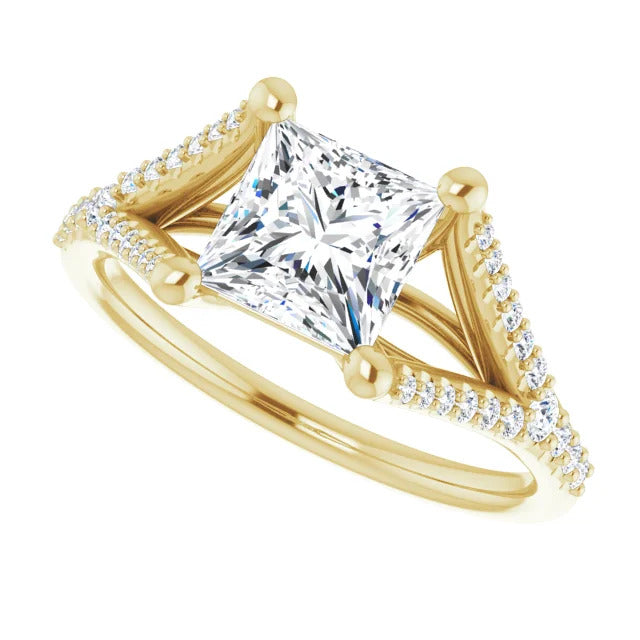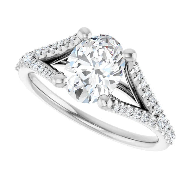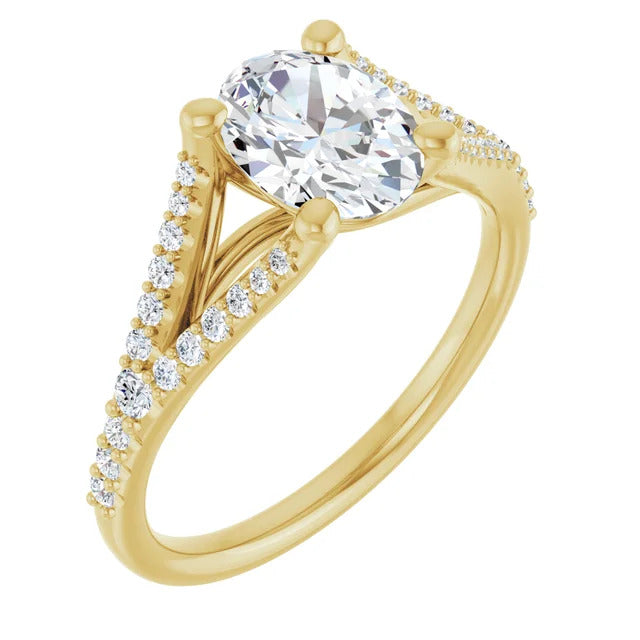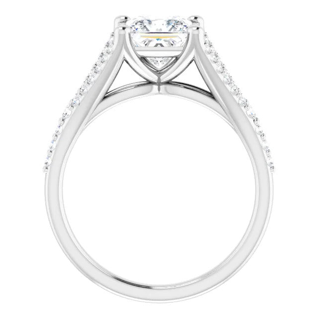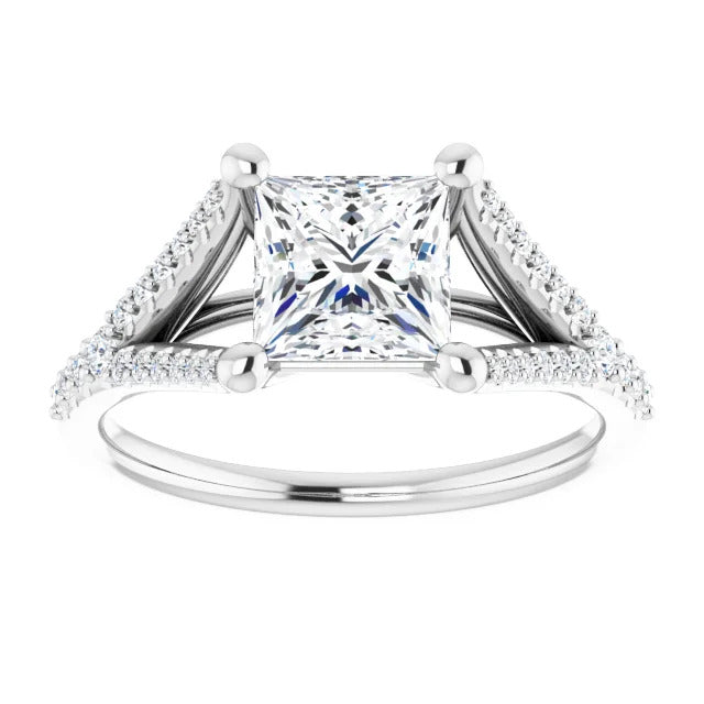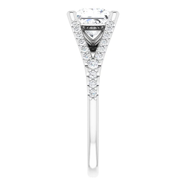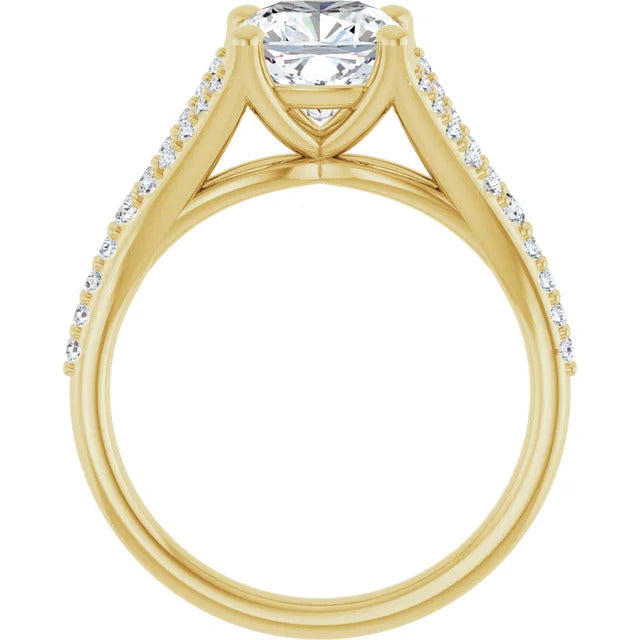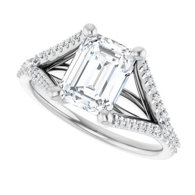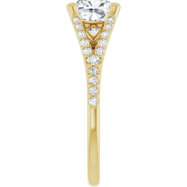 The Milan engagement ring is a dazzling split-shank cathedral setting that showcases shimmering pavé diamonds adorning the shank, adding a dimension of timeless beauty and exceptional craftsmanship.