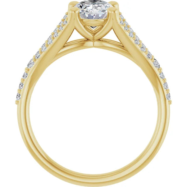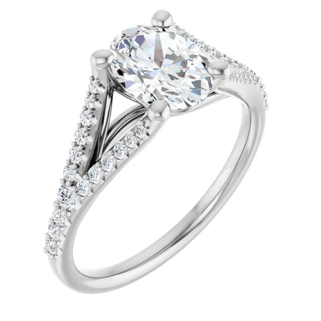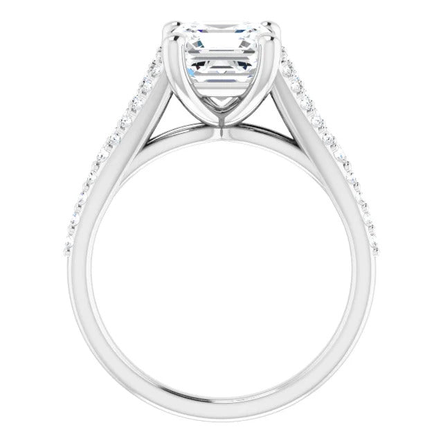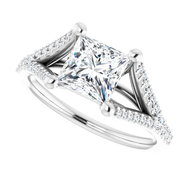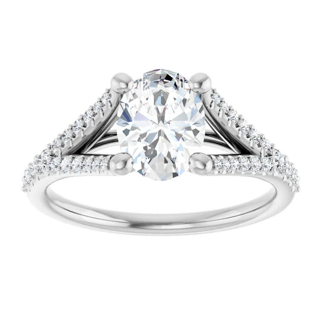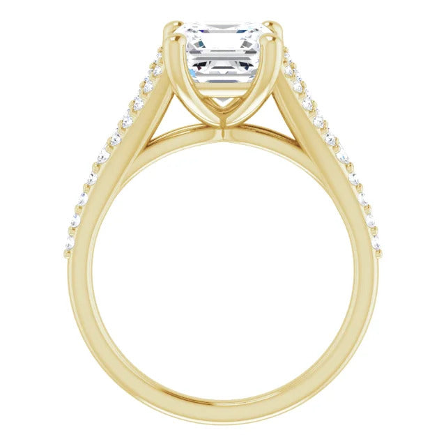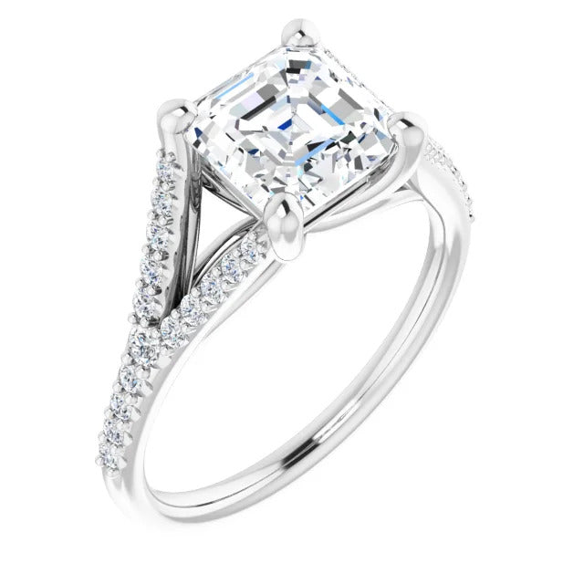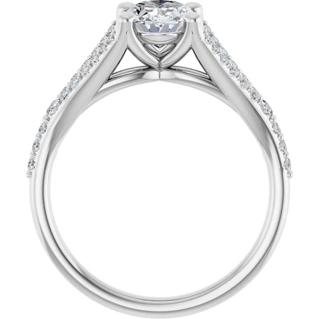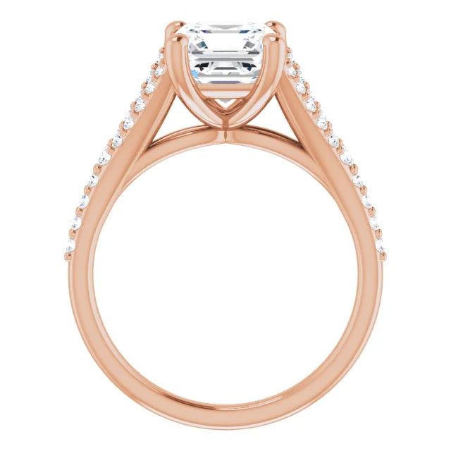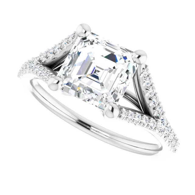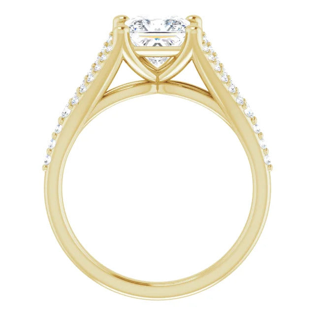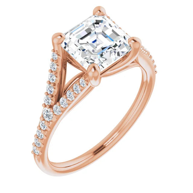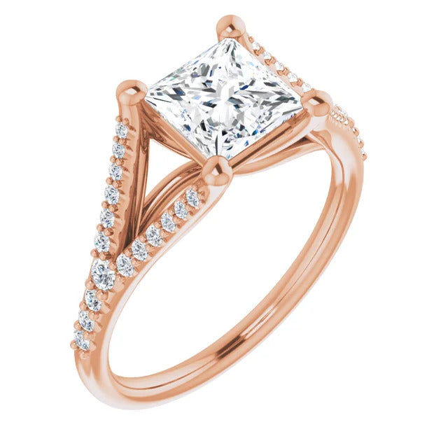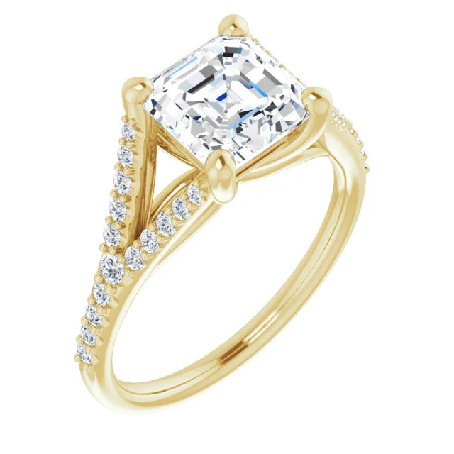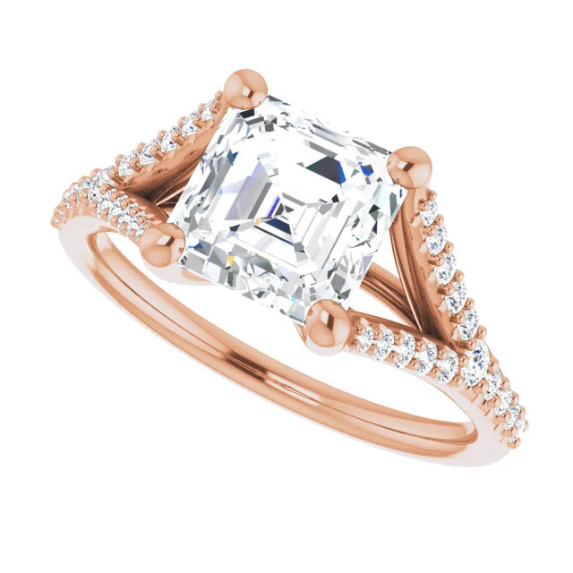 The Milan engagement ring is a dazzling split-shank cathedral setting that showcases shimmering pavé diamonds adorning the shank, adding a dimension of timeless beauty and exceptional craftsmanship.