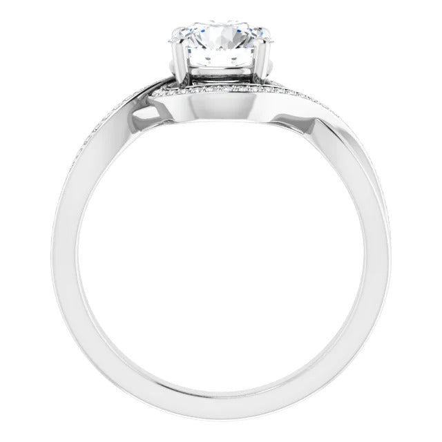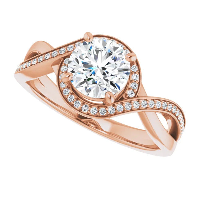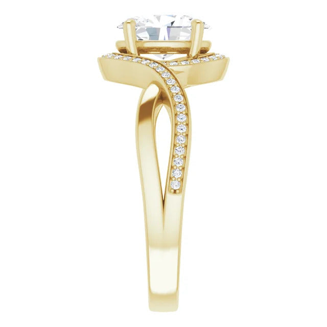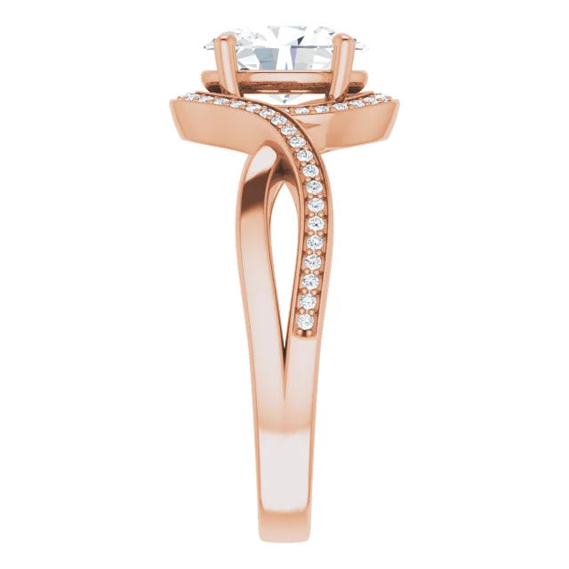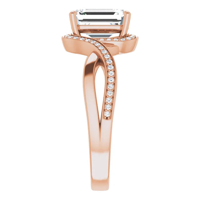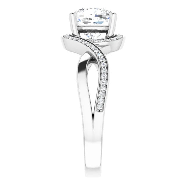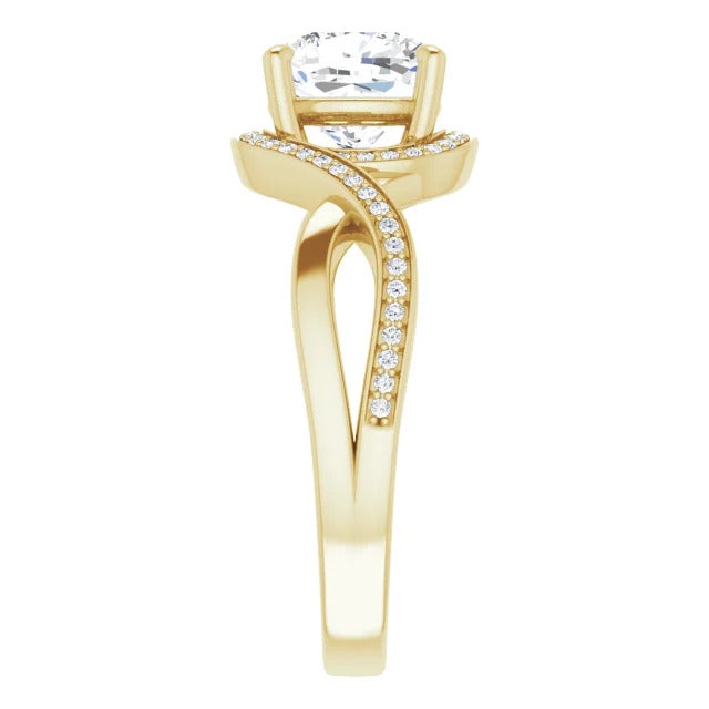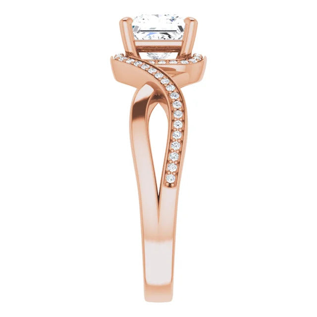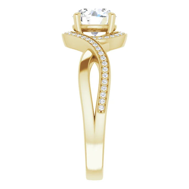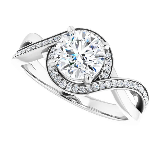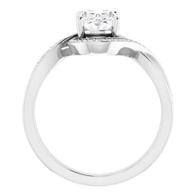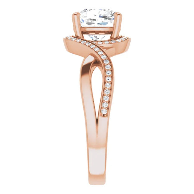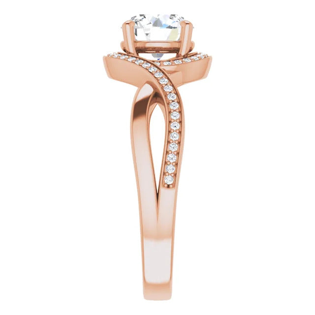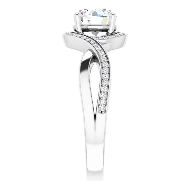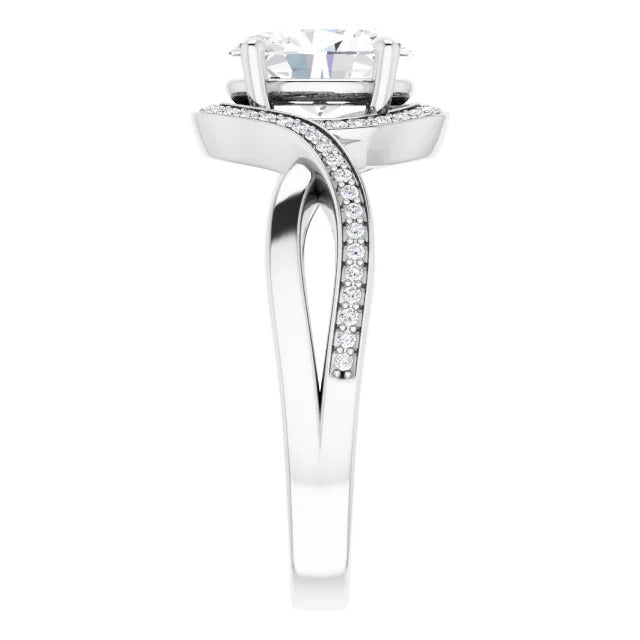The Tessa is an extraordinary engagement ring crafted for it's breathtaking beauty. With a stunning bypass design that showcases a glittering halo embracing the center stone and pavé diamonds delicately adorning halfway around the band, this ring blends modernity with timelessness.