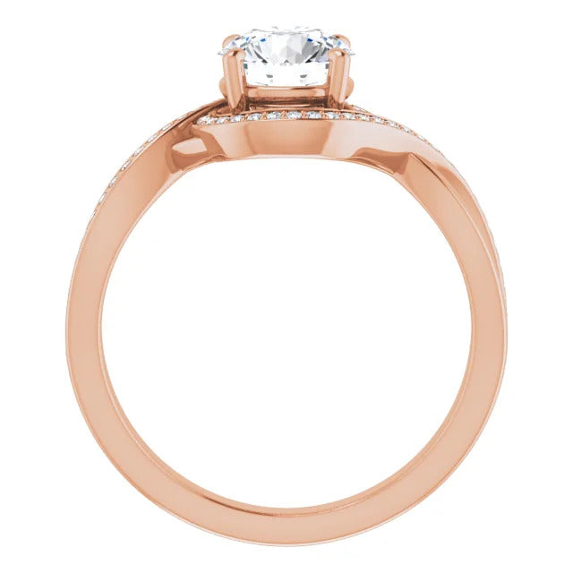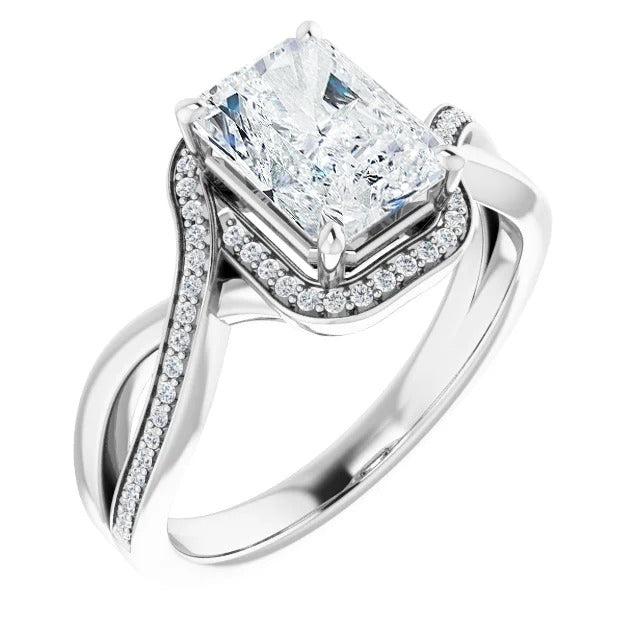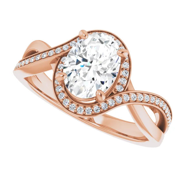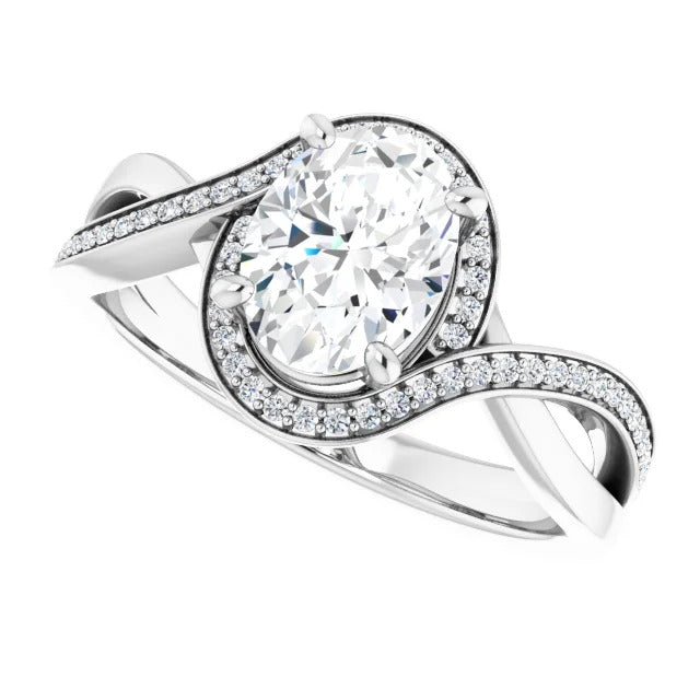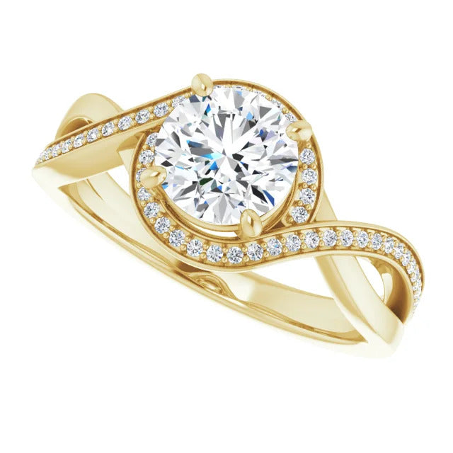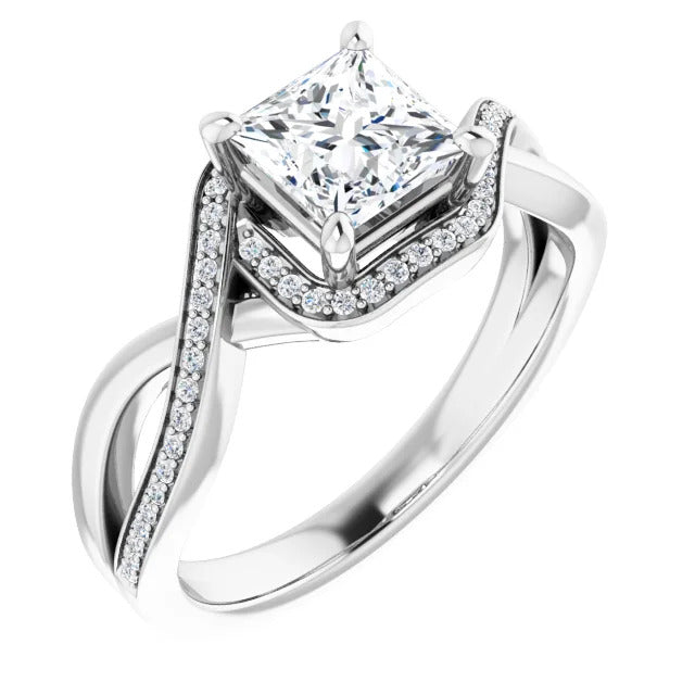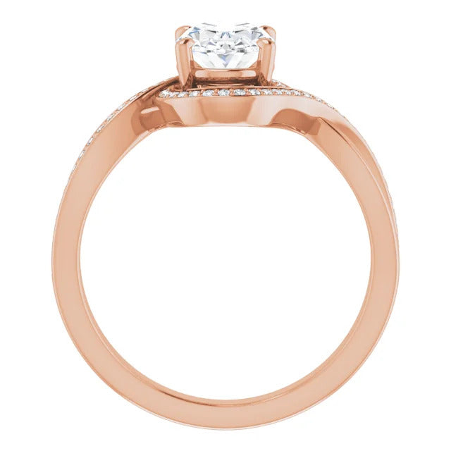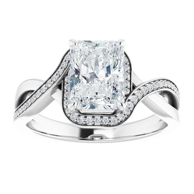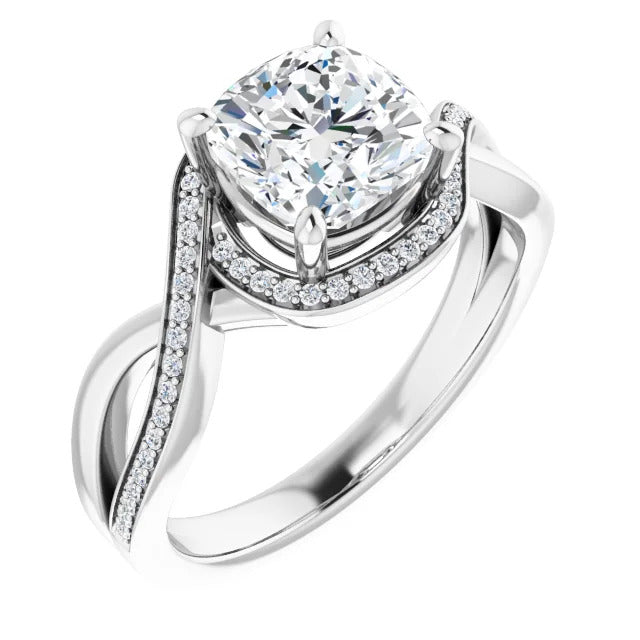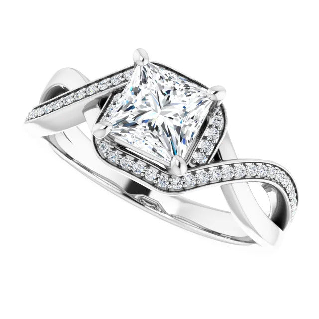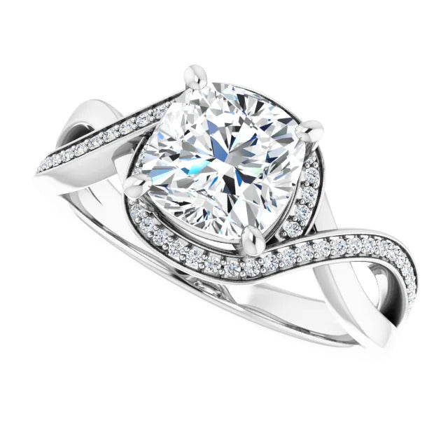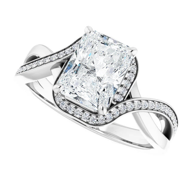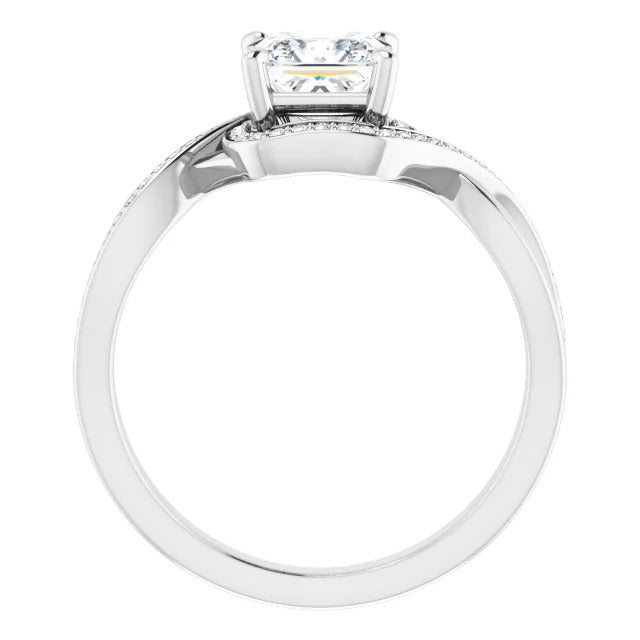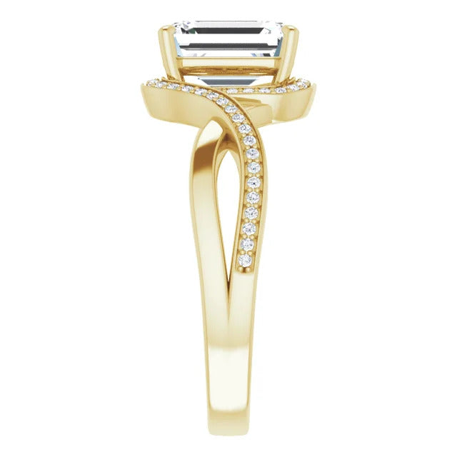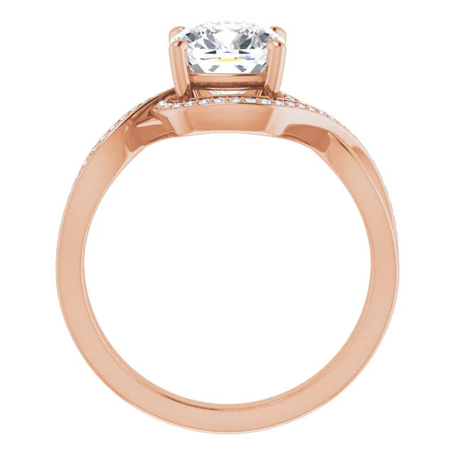 The Tessa is an extraordinary engagement ring crafted for it's breathtaking beauty. With a stunning bypass design that showcases a glittering halo embracing the center stone and pavé diamonds delicately adorning halfway around the band, this ring blends modernity with timelessness.
