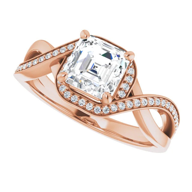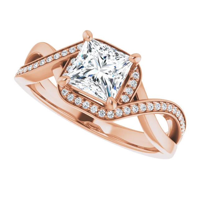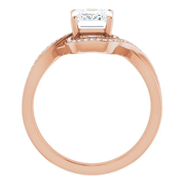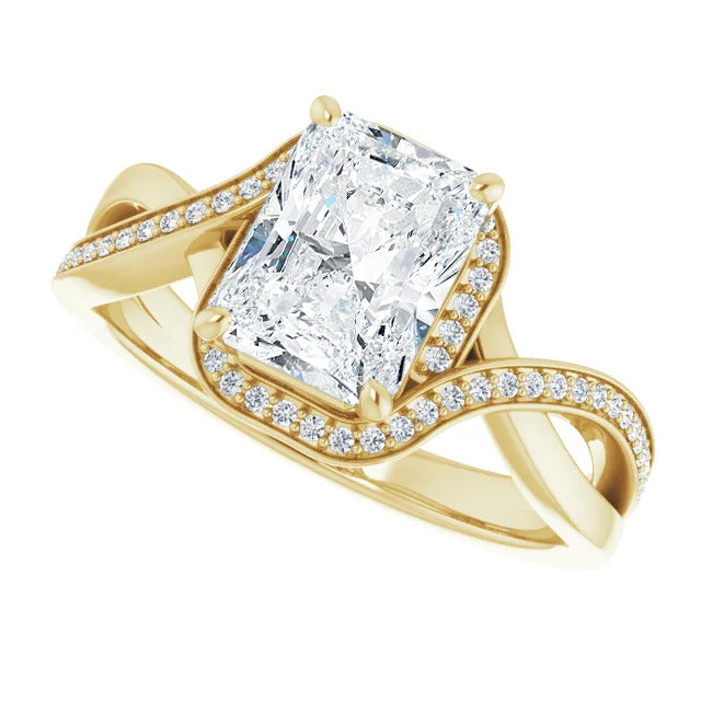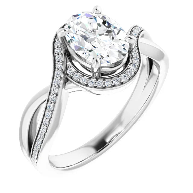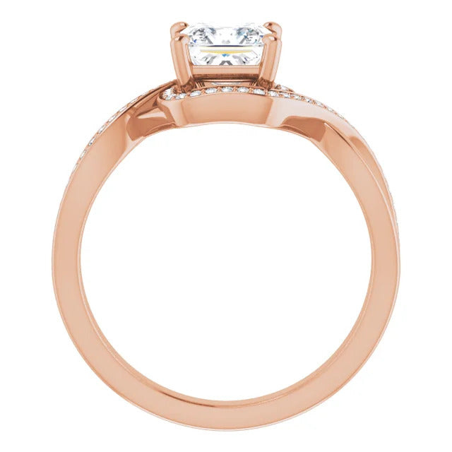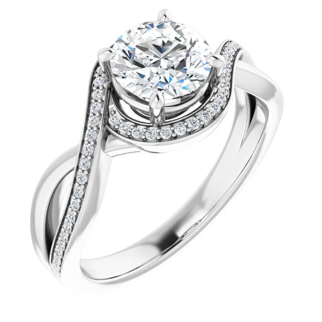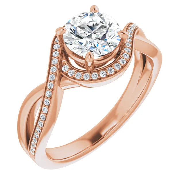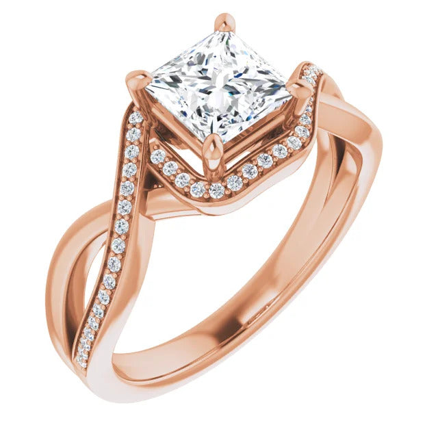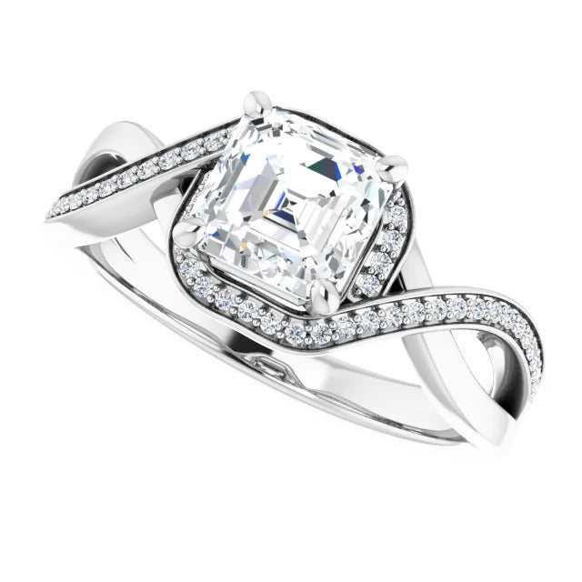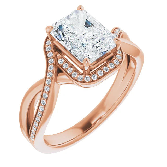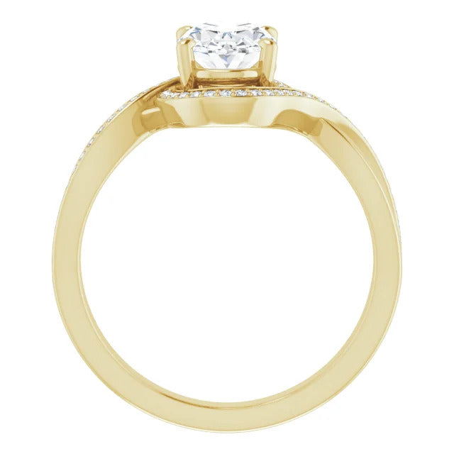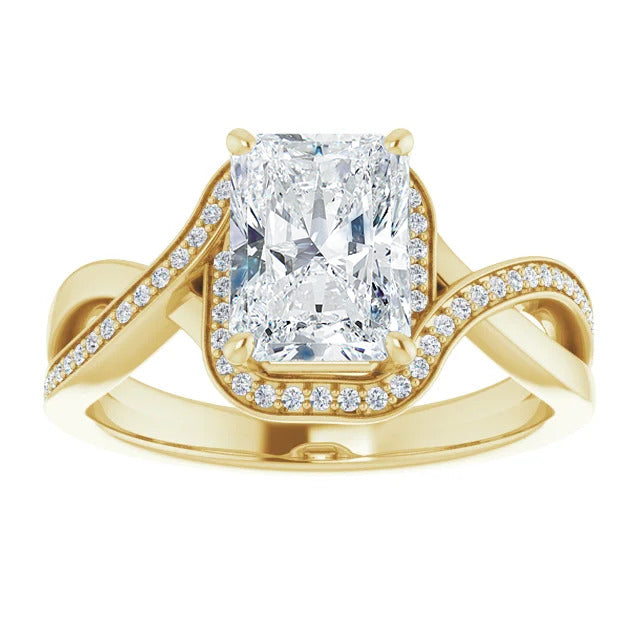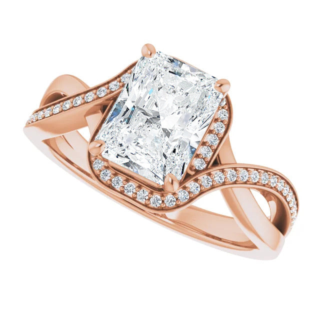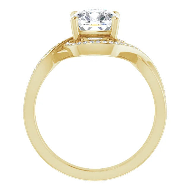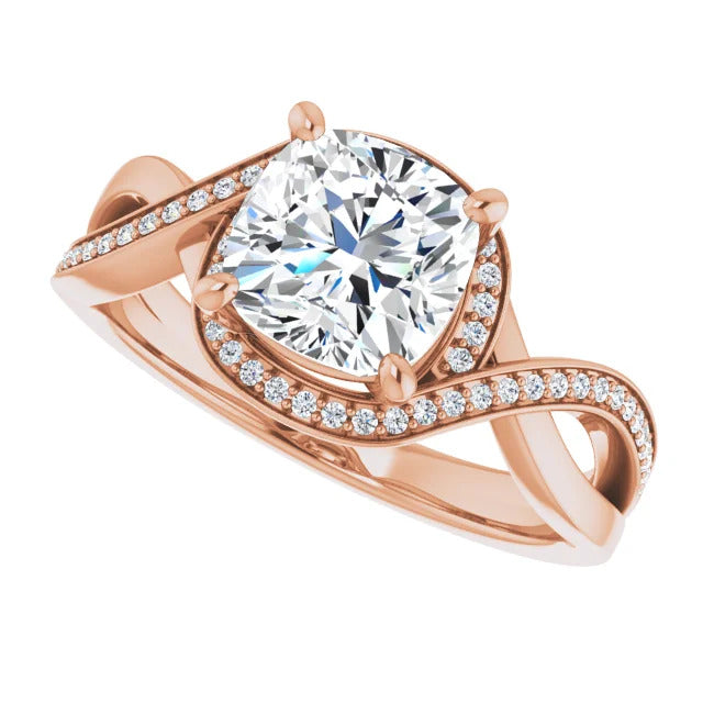 The Tessa is an extraordinary engagement ring crafted for it's breathtaking beauty. With a stunning bypass design that showcases a glittering halo embracing the center stone and pavé diamonds delicately adorning halfway around the band, this ring blends modernity with timelessness.